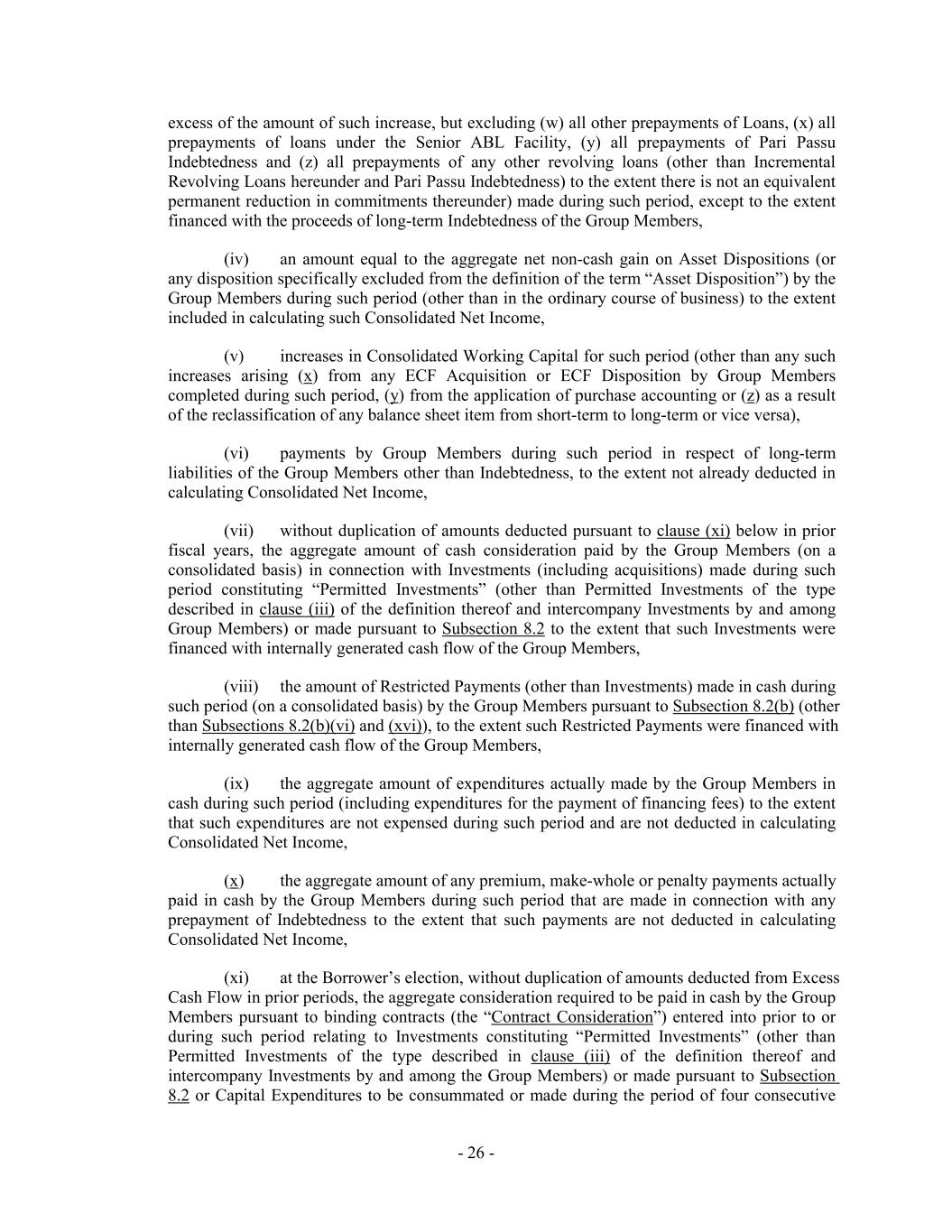 excess of the amount of such increase, but excluding (w) all other prepayments of Loans, (x) all prepayments of loans under the Senior ABL Facility, (y) all prepayments of Pari Passu Indebtedness and (z) all prepayments of any other revolving loans (other than Incremental Revolving Loans hereunder and Pari Passu Indebtedness) to the extent there is not an equivalent permanent reduction in commitments thereunder) made during such period, except to the extent financed with the proceeds of long-term Indebtedness of the Group Members, (iv) an amount equal to the aggregate net non-cash gain on Asset Dispositions (or any disposition specifically excluded from the definition of the term “Asset Disposition”) by the Group Members during such period (other than in the ordinary course of business) to the extent included in calculating such Consolidated Net Income, (v) increases in Consolidated Working Capital for such period (other than any such increases arising (x) from any ECF Acquisition or ECF Disposition by Group Members completed during such period, (y) from the application of purchase accounting or (z) as a result of the reclassification of any balance sheet item from short-term to long-term or vice versa), (vi) payments by Group Members during such period in respect of long-term liabilities of the Group Members other than Indebtedness, to the extent not already deducted in calculating Consolidated Net Income, (vii) without duplication of amounts deducted pursuant to clause (xi) below in prior fiscal years, the aggregate amount of cash consideration paid by the Group Members (on a consolidated basis) in connection with Investments (including acquisitions) made during such period constituting “Permitted Investments” (other than Permitted Investments of the type described in clause (iii) of the definition thereof and intercompany Investments by and among Group Members) or made pursuant to Subsection 8.2 to the extent that such Investments were financed with internally generated cash flow of the Group Members, (viii) the amount of Restricted Payments (other than Investments) made in cash during such period (on a consolidated basis) by the Group Members pursuant to Subsection 8.2(b) (other than Subsections 8.2(b)(vi) and (xvi)), to the extent such Restricted Payments were financed with internally generated cash flow of the Group Members, (ix) the aggregate amount of expenditures actually made by the Group Members in cash during such period (including expenditures for the payment of financing fees) to the extent that such expenditures are not expensed during such period and are not deducted in calculating Consolidated Net Income, (x) the aggregate amount of any premium, make-whole or penalty payments actually paid in cash by the Group Members during such period that are made in connection with any prepayment of Indebtedness to the extent that such payments are not deducted in calculating Consolidated Net Income, (xi) at the Borrower’s election, without duplication of amounts deducted from Excess Cash Flow in prior periods, the aggregate consideration required to be paid in cash by the Group Members pursuant to binding contracts (the “Contract Consideration”) entered into prior to or during such period relating to Investments constituting “Permitted Investments” (other than Permitted Investments of the type described in clause (iii) of the definition thereof and intercompany Investments by and among the Group Members) or made pursuant to Subsection 8.2 or Capital Expenditures to be consummated or made during the period of four consecutive - 26 -