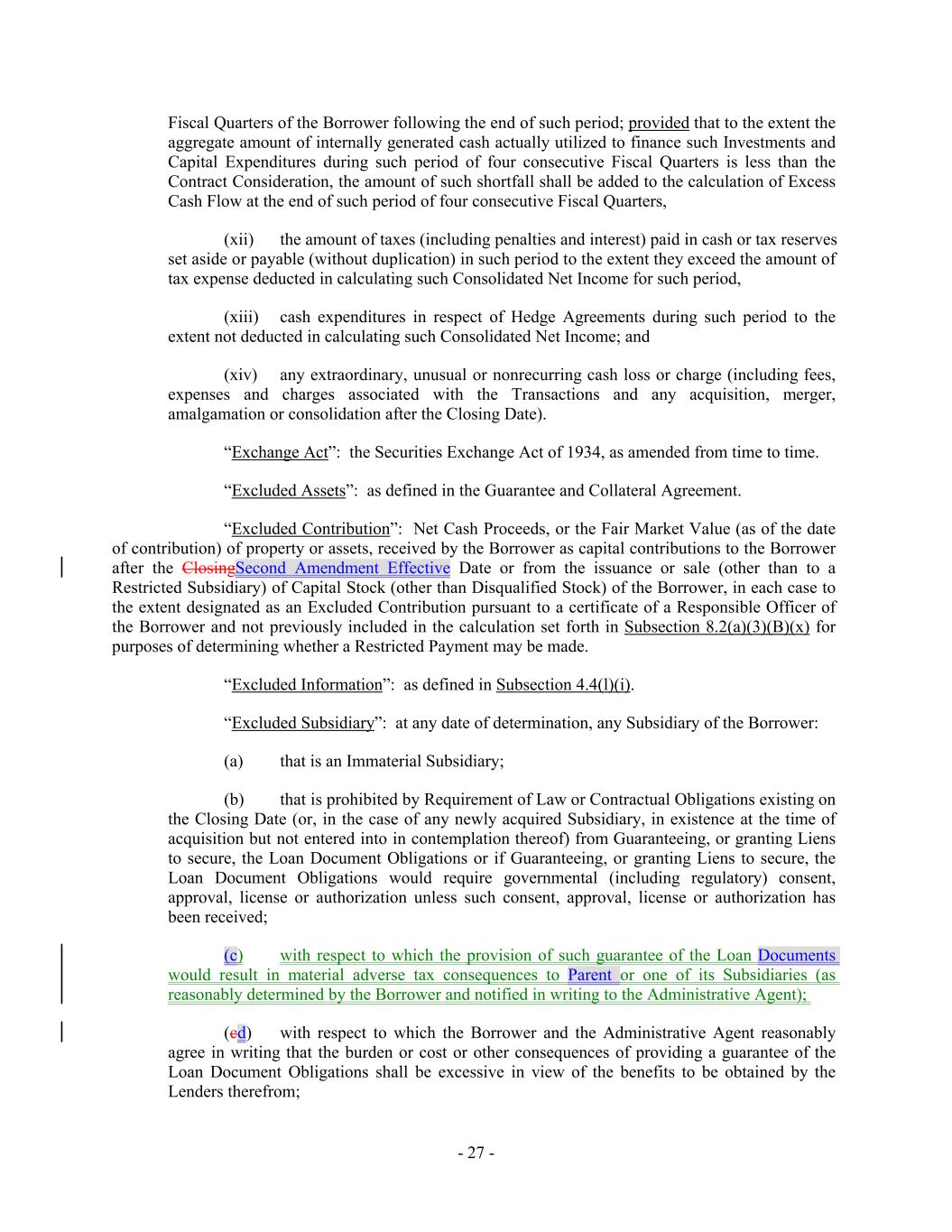 Fiscal Quarters of the Borrower following the end of such period; provided that to the extent the aggregate amount of internally generated cash actually utilized to finance such Investments and Capital Expenditures during such period of four consecutive Fiscal Quarters is less than the Contract Consideration, the amount of such shortfall shall be added to the calculation of Excess Cash Flow at the end of such period of four consecutive Fiscal Quarters, (xii) the amount of taxes (including penalties and interest) paid in cash or tax reserves set aside or payable (without duplication) in such period to the extent they exceed the amount of tax expense deducted in calculating such Consolidated Net Income for such period, (xiii) cash expenditures in respect of Hedge Agreements during such period to the extent not deducted in calculating such Consolidated Net Income; and (xiv) any extraordinary, unusual or nonrecurring cash loss or charge (including fees, expenses and charges associated with the Transactions and any acquisition, merger, amalgamation or consolidation after the Closing Date). “Exchange Act”: the Securities Exchange Act of 1934, as amended from time to time. “Excluded Assets”: as defined in the Guarantee and Collateral Agreement. “Excluded Contribution”: Net Cash Proceeds, or the Fair Market Value (as of the date of contribution) of property or assets, received by the Borrower as capital contributions to the Borrower after the ClosingSecond Amendment Effective Date or from the issuance or sale (other than to a Restricted Subsidiary) of Capital Stock (other than Disqualified Stock) of the Borrower, in each case to the extent designated as an Excluded Contribution pursuant to a certificate of a Responsible Officer of the Borrower and not previously included in the calculation set forth in Subsection 8.2(a)(3)(B)(x) for purposes of determining whether a Restricted Payment may be made. “Excluded Information”: as defined in Subsection 4.4(l)(i). “Excluded Subsidiary”: at any date of determination, any Subsidiary of the Borrower: (a) that is an Immaterial Subsidiary; (b) that is prohibited by Requirement of Law or Contractual Obligations existing on the Closing Date (or, in the case of any newly acquired Subsidiary, in existence at the time of acquisition but not entered into in contemplation thereof) from Guaranteeing, or granting Liens to secure, the Loan Document Obligations or if Guaranteeing, or granting Liens to secure, the Loan Document Obligations would require governmental (including regulatory) consent, approval, license or authorization unless such consent, approval, license or authorization has been received; (c) with respect to which the provision of such guarantee of the Loan Documents would result in material adverse tax consequences to Parent or one of its Subsidiaries (as reasonably determined by the Borrower and notified in writing to the Administrative Agent); (cd) with respect to which the Borrower and the Administrative Agent reasonably agree in writing that the burden or cost or other consequences of providing a guarantee of the Loan Document Obligations shall be excessive in view of the benefits to be obtained by the Lenders therefrom; - 27 -