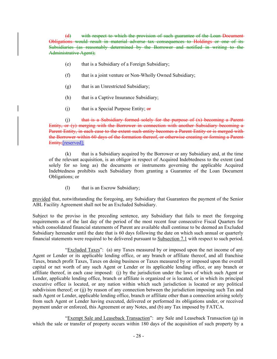 (d) with respect to which the provision of such guarantee of the Loan Document Obligations would result in material adverse tax consequences to Holdings or one of its Subsidiaries (as reasonably determined by the Borrower and notified in writing to the Administrative Agent); (e) that is a Subsidiary of a Foreign Subsidiary; (f) that is a joint venture or Non-Wholly Owned Subsidiary; (g) that is an Unrestricted Subsidiary; (h) that is a Captive Insurance Subsidiary; (i) that is a Special Purpose Entity; or (j) that is a Subsidiary formed solely for the purpose of (x) becoming a Parent Entity, or (y) merging with the Borrower in connection with another Subsidiary becoming a Parent Entity, in each case to the extent such entity becomes a Parent Entity or is merged with the Borrower within 60 days of the formation thereof, or otherwise creating or forming a Parent Entity;[reserved]; (k) that is a Subsidiary acquired by the Borrower or any Subsidiary and, at the time of the relevant acquisition, is an obligor in respect of Acquired Indebtedness to the extent (and solely for so long as) the documents or instruments governing the applicable Acquired Indebtedness prohibits such Subsidiary from granting a Guarantee of the Loan Document Obligations; or (l) that is an Escrow Subsidiary; provided that, notwithstanding the foregoing, any Subsidiary that Guarantees the payment of the Senior ABL Facility Agreement shall not be an Excluded Subsidiary. Subject to the proviso in the preceding sentence, any Subsidiary that fails to meet the foregoing requirements as of the last day of the period of the most recent four consecutive Fiscal Quarters for which consolidated financial statements of Parent are available shall continue to be deemed an Excluded Subsidiary hereunder until the date that is 60 days following the date on which such annual or quarterly financial statements were required to be delivered pursuant to Subsection 7.1 with respect to such period. “Excluded Taxes”: (a) any Taxes measured by or imposed upon the net income of any Agent or Lender or its applicable lending office, or any branch or affiliate thereof, and all franchise Taxes, branch profit Taxes, Taxes on doing business or Taxes measured by or imposed upon the overall capital or net worth of any such Agent or Lender or its applicable lending office, or any branch or affiliate thereof, in each case imposed: (i) by the jurisdiction under the laws of which such Agent or Lender, applicable lending office, branch or affiliate is organized or is located, or in which its principal executive office is located, or any nation within which such jurisdiction is located or any political subdivision thereof; or (ii) by reason of any connection between the jurisdiction imposing such Tax and such Agent or Lender, applicable lending office, branch or affiliate other than a connection arising solely from such Agent or Lender having executed, delivered or performed its obligations under, or received payment under or enforced, this Agreement or any Notes, and (b) any Tax imposed by FATCA. “Exempt Sale and Leaseback Transaction”: any Sale and Leaseback Transaction (a) in which the sale or transfer of property occurs within 180 days of the acquisition of such property by a - 28 -