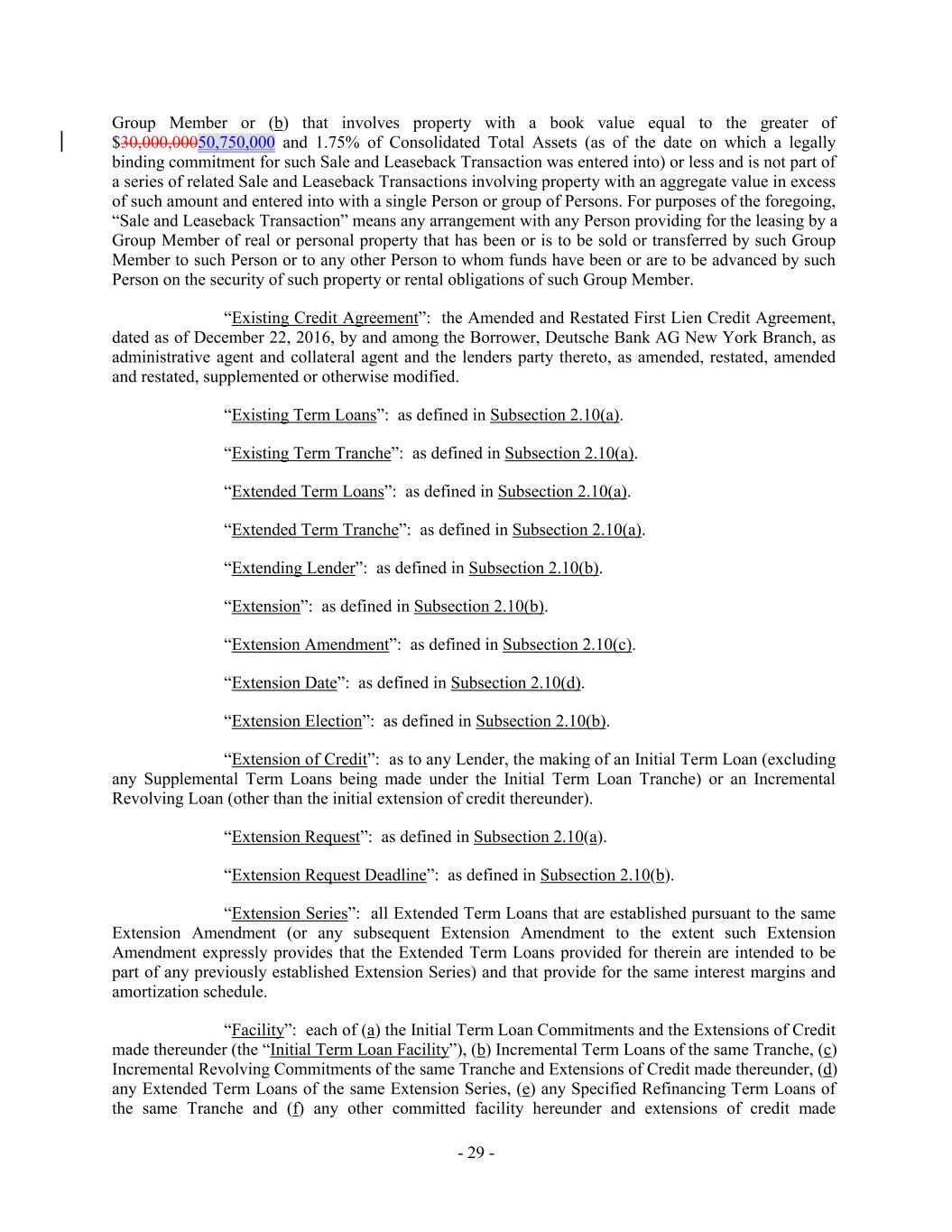Group Member or (b) that involves property with a book value equal to the greater of $30,000,00050,750,000 and 1.75% of Consolidated Total Assets (as of the date on which a legally binding commitment for such Sale and Leaseback Transaction was entered into) or less and is not part of a series of related Sale and Leaseback Transactions involving property with an aggregate value in excess of such amount and entered into with a single Person or group of Persons. For purposes of the foregoing, “Sale and Leaseback Transaction” means any arrangement with any Person providing for the leasing by a Group Member of real or personal property that has been or is to be sold or transferred by such Group Member to such Person or to any other Person to whom funds have been or are to be advanced by such Person on the security of such property or rental obligations of such Group Member. “Existing Credit Agreement”: the Amended and Restated First Lien Credit Agreement, dated as of December 22, 2016, by and among the Borrower, Deutsche Bank AG New York Branch, as administrative agent and collateral agent and the lenders party thereto, as amended, restated, amended and restated, supplemented or otherwise modified. “Existing Term Loans”: as defined in Subsection 2.10(a). “Existing Term Tranche”: as defined in Subsection 2.10(a). “Extended Term Loans”: as defined in Subsection 2.10(a). “Extended Term Tranche”: as defined in Subsection 2.10(a). “Extending Lender”: as defined in Subsection 2.10(b). “Extension”: as defined in Subsection 2.10(b). “Extension Amendment”: as defined in Subsection 2.10(c). “Extension Date”: as defined in Subsection 2.10(d). “Extension Election”: as defined in Subsection 2.10(b). “Extension of Credit”: as to any Lender, the making of an Initial Term Loan (excluding any Supplemental Term Loans being made under the Initial Term Loan Tranche) or an Incremental Revolving Loan (other than the initial extension of credit thereunder). “Extension Request”: as defined in Subsection 2.10(a). “Extension Request Deadline”: as defined in Subsection 2.10(b). “Extension Series”: all Extended Term Loans that are established pursuant to the same Extension Amendment (or any subsequent Extension Amendment to the extent such Extension Amendment expressly provides that the Extended Term Loans provided for therein are intended to be part of any previously established Extension Series) and that provide for the same interest margins and amortization schedule. “Facility”: each of (a) the Initial Term Loan Commitments and the Extensions of Credit made thereunder (the “Initial Term Loan Facility”), (b) Incremental Term Loans of the same Tranche, (c) Incremental Revolving Commitments of the same Tranche and Extensions of Credit made thereunder, (d) any Extended Term Loans of the same Extension Series, (e) any Specified Refinancing Term Loans of the same Tranche and (f) any other committed facility hereunder and extensions of credit made - 29 -
