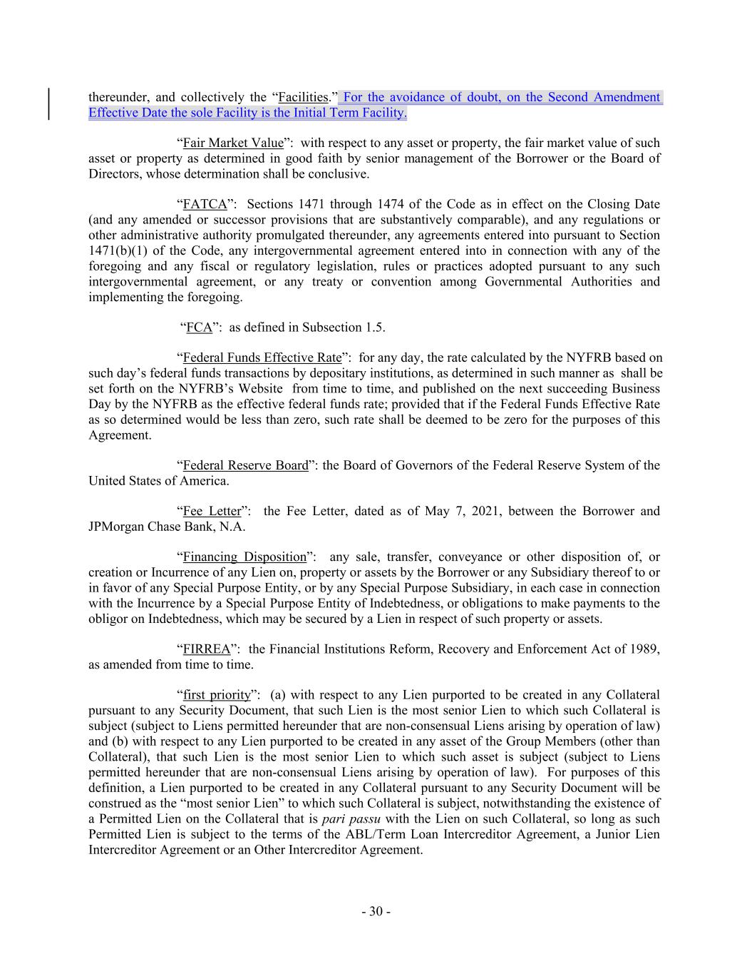 thereunder, and collectively the “Facilities.” For the avoidance of doubt, on the Second Amendment Effective Date the sole Facility is the Initial Term Facility. “Fair Market Value”: with respect to any asset or property, the fair market value of such asset or property as determined in good faith by senior management of the Borrower or the Board of Directors, whose determination shall be conclusive. “FATCA”: Sections 1471 through 1474 of the Code as in effect on the Closing Date (and any amended or successor provisions that are substantively comparable), and any regulations or other administrative authority promulgated thereunder, any agreements entered into pursuant to Section 1471(b)(1) of the Code, any intergovernmental agreement entered into in connection with any of the foregoing and any fiscal or regulatory legislation, rules or practices adopted pursuant to any such intergovernmental agreement, or any treaty or convention among Governmental Authorities and implementing the foregoing. “FCA”: as defined in Subsection 1.5. “Federal Funds Effective Rate”: for any day, the rate calculated by the NYFRB based on such day’s federal funds transactions by depositary institutions, as determined in such manner as shall be set forth on the NYFRB’s Website from time to time, and published on the next succeeding Business Day by the NYFRB as the effective federal funds rate; provided that if the Federal Funds Effective Rate as so determined would be less than zero, such rate shall be deemed to be zero for the purposes of this Agreement. “Federal Reserve Board”: the Board of Governors of the Federal Reserve System of the United States of America. “Fee Letter”: the Fee Letter, dated as of May 7, 2021, between the Borrower and JPMorgan Chase Bank, N.A. “Financing Disposition”: any sale, transfer, conveyance or other disposition of, or creation or Incurrence of any Lien on, property or assets by the Borrower or any Subsidiary thereof to or in favor of any Special Purpose Entity, or by any Special Purpose Subsidiary, in each case in connection with the Incurrence by a Special Purpose Entity of Indebtedness, or obligations to make payments to the obligor on Indebtedness, which may be secured by a Lien in respect of such property or assets. “FIRREA”: the Financial Institutions Reform, Recovery and Enforcement Act of 1989, as amended from time to time. “first priority”: (a) with respect to any Lien purported to be created in any Collateral pursuant to any Security Document, that such Lien is the most senior Lien to which such Collateral is subject (subject to Liens permitted hereunder that are non-consensual Liens arising by operation of law) and (b) with respect to any Lien purported to be created in any asset of the Group Members (other than Collateral), that such Lien is the most senior Lien to which such asset is subject (subject to Liens permitted hereunder that are non-consensual Liens arising by operation of law). For purposes of this definition, a Lien purported to be created in any Collateral pursuant to any Security Document will be construed as the “most senior Lien” to which such Collateral is subject, notwithstanding the existence of a Permitted Lien on the Collateral that is pari passu with the Lien on such Collateral, so long as such Permitted Lien is subject to the terms of the ABL/Term Loan Intercreditor Agreement, a Junior Lien Intercreditor Agreement or an Other Intercreditor Agreement. - 30 -