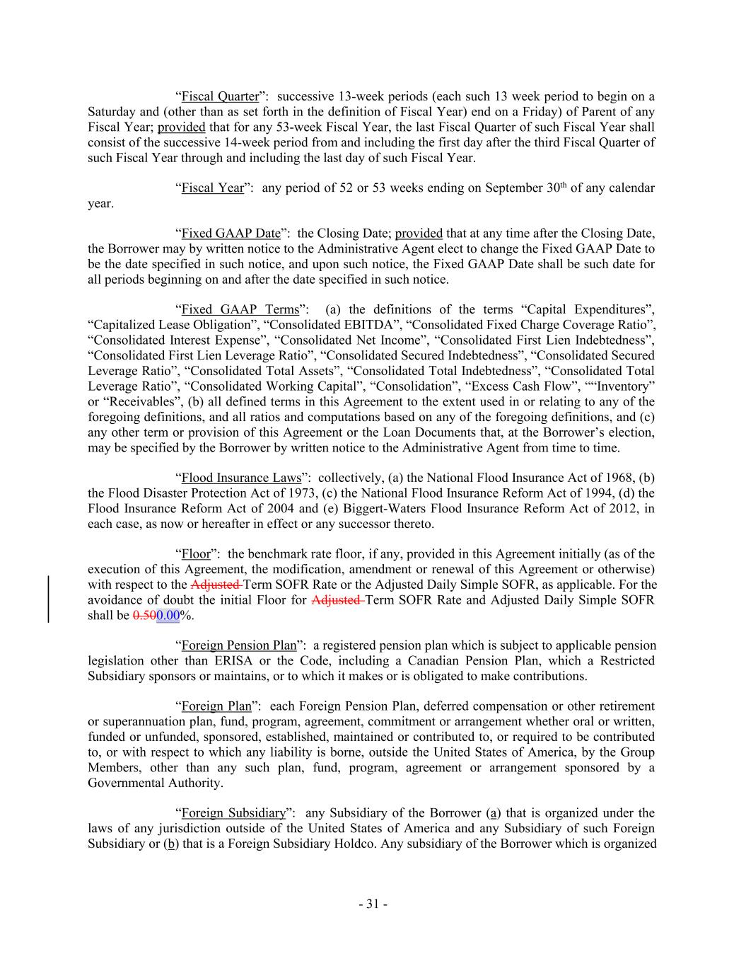 “Fiscal Quarter”: successive 13-week periods (each such 13 week period to begin on a Saturday and (other than as set forth in the definition of Fiscal Year) end on a Friday) of Parent of any Fiscal Year; provided that for any 53-week Fiscal Year, the last Fiscal Quarter of such Fiscal Year shall consist of the successive 14-week period from and including the first day after the third Fiscal Quarter of such Fiscal Year through and including the last day of such Fiscal Year. “Fiscal Year”: any period of 52 or 53 weeks ending on September 30th of any calendar year. “Fixed GAAP Date”: the Closing Date; provided that at any time after the Closing Date, the Borrower may by written notice to the Administrative Agent elect to change the Fixed GAAP Date to be the date specified in such notice, and upon such notice, the Fixed GAAP Date shall be such date for all periods beginning on and after the date specified in such notice. “Fixed GAAP Terms”: (a) the definitions of the terms “Capital Expenditures”, “Capitalized Lease Obligation”, “Consolidated EBITDA”, “Consolidated Fixed Charge Coverage Ratio”, “Consolidated Interest Expense”, “Consolidated Net Income”, “Consolidated First Lien Indebtedness”, “Consolidated First Lien Leverage Ratio”, “Consolidated Secured Indebtedness”, “Consolidated Secured Leverage Ratio”, “Consolidated Total Assets”, “Consolidated Total Indebtedness”, “Consolidated Total Leverage Ratio”, “Consolidated Working Capital”, “Consolidation”, “Excess Cash Flow”, ““Inventory” or “Receivables”, (b) all defined terms in this Agreement to the extent used in or relating to any of the foregoing definitions, and all ratios and computations based on any of the foregoing definitions, and (c) any other term or provision of this Agreement or the Loan Documents that, at the Borrower’s election, may be specified by the Borrower by written notice to the Administrative Agent from time to time. “Flood Insurance Laws”: collectively, (a) the National Flood Insurance Act of 1968, (b) the Flood Disaster Protection Act of 1973, (c) the National Flood Insurance Reform Act of 1994, (d) the Flood Insurance Reform Act of 2004 and (e) Biggert-Waters Flood Insurance Reform Act of 2012, in each case, as now or hereafter in effect or any successor thereto. “Floor”: the benchmark rate floor, if any, provided in this Agreement initially (as of the execution of this Agreement, the modification, amendment or renewal of this Agreement or otherwise) with respect to the Adjusted Term SOFR Rate or the Adjusted Daily Simple SOFR, as applicable. For the avoidance of doubt the initial Floor for Adjusted Term SOFR Rate and Adjusted Daily Simple SOFR shall be 0.500.00%. “Foreign Pension Plan”: a registered pension plan which is subject to applicable pension legislation other than ERISA or the Code, including a Canadian Pension Plan, which a Restricted Subsidiary sponsors or maintains, or to which it makes or is obligated to make contributions. “Foreign Plan”: each Foreign Pension Plan, deferred compensation or other retirement or superannuation plan, fund, program, agreement, commitment or arrangement whether oral or written, funded or unfunded, sponsored, established, maintained or contributed to, or required to be contributed to, or with respect to which any liability is borne, outside the United States of America, by the Group Members, other than any such plan, fund, program, agreement or arrangement sponsored by a Governmental Authority. “Foreign Subsidiary”: any Subsidiary of the Borrower (a) that is organized under the laws of any jurisdiction outside of the United States of America and any Subsidiary of such Foreign Subsidiary or (b) that is a Foreign Subsidiary Holdco. Any subsidiary of the Borrower which is organized - 31 -