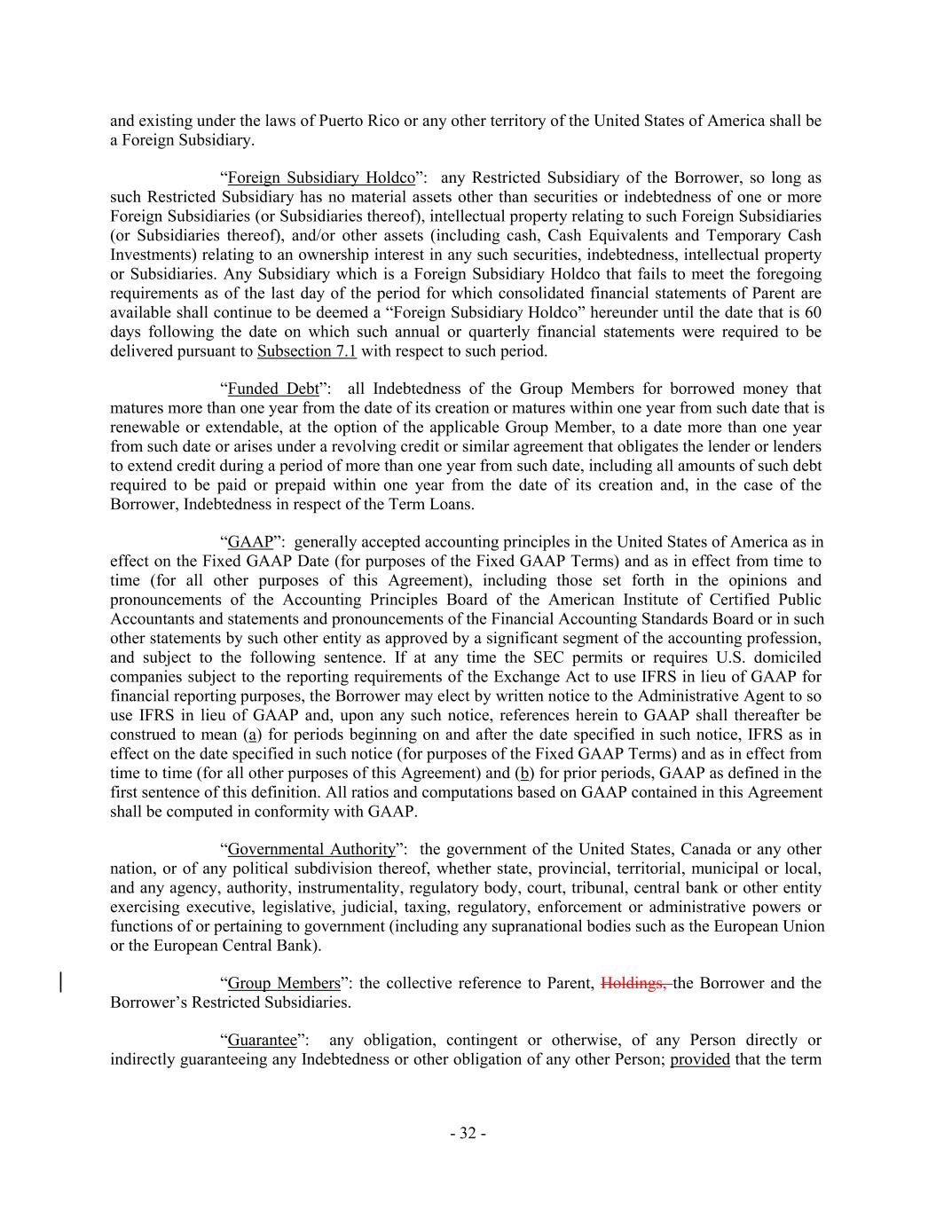 and existing under the laws of Puerto Rico or any other territory of the United States of America shall be a Foreign Subsidiary. “Foreign Subsidiary Holdco”: any Restricted Subsidiary of the Borrower, so long as such Restricted Subsidiary has no material assets other than securities or indebtedness of one or more Foreign Subsidiaries (or Subsidiaries thereof), intellectual property relating to such Foreign Subsidiaries (or Subsidiaries thereof), and/or other assets (including cash, Cash Equivalents and Temporary Cash Investments) relating to an ownership interest in any such securities, indebtedness, intellectual property or Subsidiaries. Any Subsidiary which is a Foreign Subsidiary Holdco that fails to meet the foregoing requirements as of the last day of the period for which consolidated financial statements of Parent are available shall continue to be deemed a “Foreign Subsidiary Holdco” hereunder until the date that is 60 days following the date on which such annual or quarterly financial statements were required to be delivered pursuant to Subsection 7.1 with respect to such period. “Funded Debt”: all Indebtedness of the Group Members for borrowed money that matures more than one year from the date of its creation or matures within one year from such date that is renewable or extendable, at the option of the applicable Group Member, to a date more than one year from such date or arises under a revolving credit or similar agreement that obligates the lender or lenders to extend credit during a period of more than one year from such date, including all amounts of such debt required to be paid or prepaid within one year from the date of its creation and, in the case of the Borrower, Indebtedness in respect of the Term Loans. “GAAP”: generally accepted accounting principles in the United States of America as in effect on the Fixed GAAP Date (for purposes of the Fixed GAAP Terms) and as in effect from time to time (for all other purposes of this Agreement), including those set forth in the opinions and pronouncements of the Accounting Principles Board of the American Institute of Certified Public Accountants and statements and pronouncements of the Financial Accounting Standards Board or in such other statements by such other entity as approved by a significant segment of the accounting profession, and subject to the following sentence. If at any time the SEC permits or requires U.S. domiciled companies subject to the reporting requirements of the Exchange Act to use IFRS in lieu of GAAP for financial reporting purposes, the Borrower may elect by written notice to the Administrative Agent to so use IFRS in lieu of GAAP and, upon any such notice, references herein to GAAP shall thereafter be construed to mean (a) for periods beginning on and after the date specified in such notice, IFRS as in effect on the date specified in such notice (for purposes of the Fixed GAAP Terms) and as in effect from time to time (for all other purposes of this Agreement) and (b) for prior periods, GAAP as defined in the first sentence of this definition. All ratios and computations based on GAAP contained in this Agreement shall be computed in conformity with GAAP. “Governmental Authority”: the government of the United States, Canada or any other nation, or of any political subdivision thereof, whether state, provincial, territorial, municipal or local, and any agency, authority, instrumentality, regulatory body, court, tribunal, central bank or other entity exercising executive, legislative, judicial, taxing, regulatory, enforcement or administrative powers or functions of or pertaining to government (including any supranational bodies such as the European Union or the European Central Bank). “Group Members”: the collective reference to Parent, Holdings, the Borrower and the Borrower’s Restricted Subsidiaries. “Guarantee”: any obligation, contingent or otherwise, of any Person directly or indirectly guaranteeing any Indebtedness or other obligation of any other Person; provided that the term - 32 -