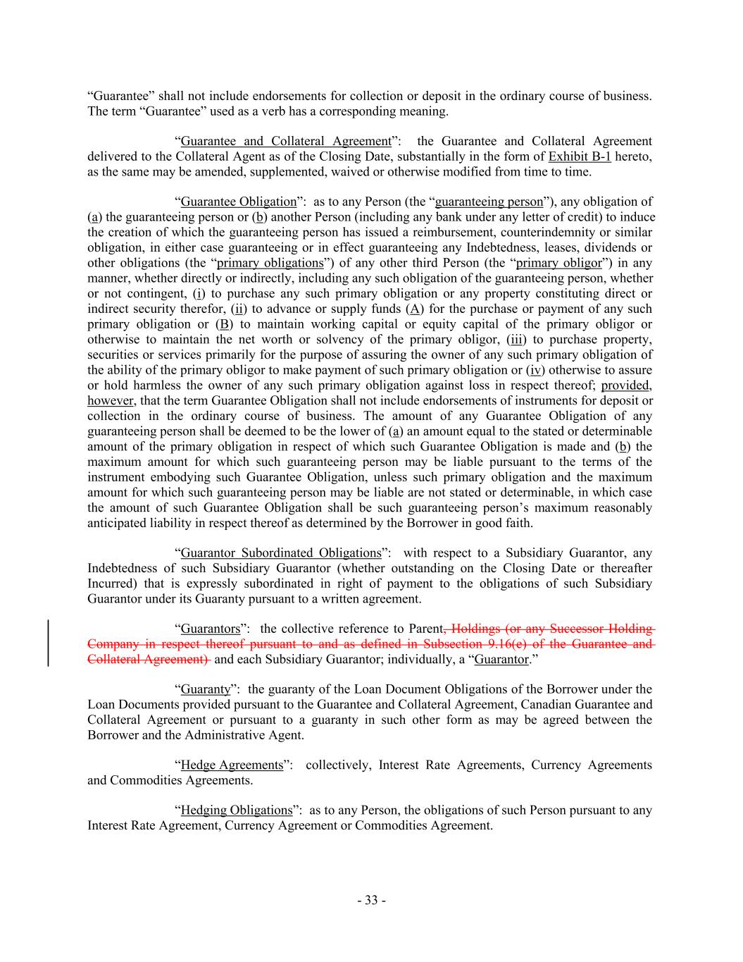 “Guarantee” shall not include endorsements for collection or deposit in the ordinary course of business. The term “Guarantee” used as a verb has a corresponding meaning. “Guarantee and Collateral Agreement”: the Guarantee and Collateral Agreement delivered to the Collateral Agent as of the Closing Date, substantially in the form of Exhibit B-1 hereto, as the same may be amended, supplemented, waived or otherwise modified from time to time. “Guarantee Obligation”: as to any Person (the “guaranteeing person”), any obligation of (a) the guaranteeing person or (b) another Person (including any bank under any letter of credit) to induce the creation of which the guaranteeing person has issued a reimbursement, counterindemnity or similar obligation, in either case guaranteeing or in effect guaranteeing any Indebtedness, leases, dividends or other obligations (the “primary obligations”) of any other third Person (the “primary obligor”) in any manner, whether directly or indirectly, including any such obligation of the guaranteeing person, whether or not contingent, (i) to purchase any such primary obligation or any property constituting direct or indirect security therefor, (ii) to advance or supply funds (A) for the purchase or payment of any such primary obligation or (B) to maintain working capital or equity capital of the primary obligor or otherwise to maintain the net worth or solvency of the primary obligor, (iii) to purchase property, securities or services primarily for the purpose of assuring the owner of any such primary obligation of the ability of the primary obligor to make payment of such primary obligation or (iv) otherwise to assure or hold harmless the owner of any such primary obligation against loss in respect thereof; provided, however, that the term Guarantee Obligation shall not include endorsements of instruments for deposit or collection in the ordinary course of business. The amount of any Guarantee Obligation of any guaranteeing person shall be deemed to be the lower of (a) an amount equal to the stated or determinable amount of the primary obligation in respect of which such Guarantee Obligation is made and (b) the maximum amount for which such guaranteeing person may be liable pursuant to the terms of the instrument embodying such Guarantee Obligation, unless such primary obligation and the maximum amount for which such guaranteeing person may be liable are not stated or determinable, in which case the amount of such Guarantee Obligation shall be such guaranteeing person’s maximum reasonably anticipated liability in respect thereof as determined by the Borrower in good faith. “Guarantor Subordinated Obligations”: with respect to a Subsidiary Guarantor, any Indebtedness of such Subsidiary Guarantor (whether outstanding on the Closing Date or thereafter Incurred) that is expressly subordinated in right of payment to the obligations of such Subsidiary Guarantor under its Guaranty pursuant to a written agreement. “Guarantors”: the collective reference to Parent, Holdings (or any Successor Holding Company in respect thereof pursuant to and as defined in Subsection 9.16(e) of the Guarantee and Collateral Agreement) and each Subsidiary Guarantor; individually, a “Guarantor.” “Guaranty”: the guaranty of the Loan Document Obligations of the Borrower under the Loan Documents provided pursuant to the Guarantee and Collateral Agreement, Canadian Guarantee and Collateral Agreement or pursuant to a guaranty in such other form as may be agreed between the Borrower and the Administrative Agent. “Hedge Agreements”: collectively, Interest Rate Agreements, Currency Agreements and Commodities Agreements. “Hedging Obligations”: as to any Person, the obligations of such Person pursuant to any Interest Rate Agreement, Currency Agreement or Commodities Agreement. - 33 -
