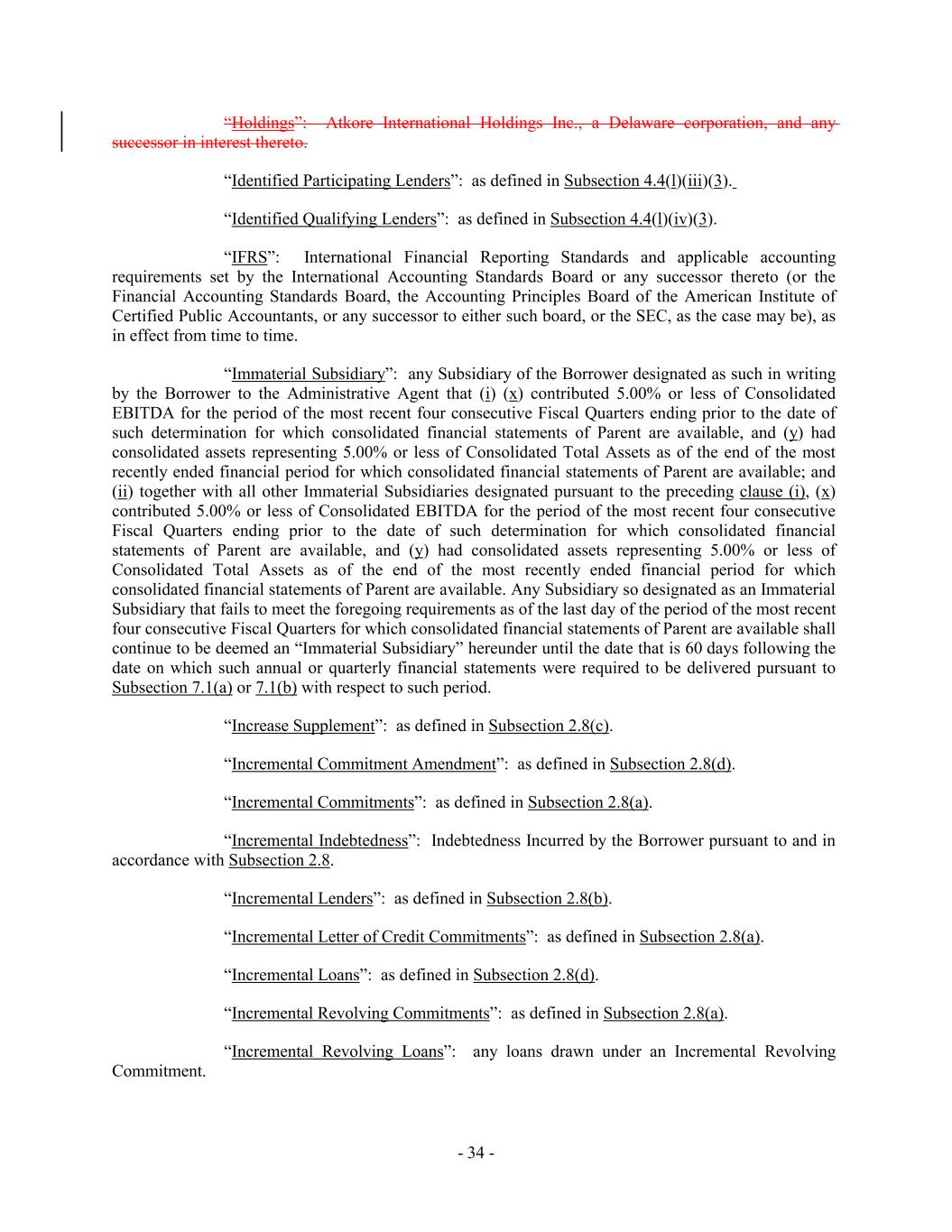“Holdings”: Atkore International Holdings Inc., a Delaware corporation, and any successor in interest thereto. “Identified Participating Lenders”: as defined in Subsection 4.4(l)(iii)(3). “Identified Qualifying Lenders”: as defined in Subsection 4.4(l)(iv)(3). “IFRS”: International Financial Reporting Standards and applicable accounting requirements set by the International Accounting Standards Board or any successor thereto (or the Financial Accounting Standards Board, the Accounting Principles Board of the American Institute of Certified Public Accountants, or any successor to either such board, or the SEC, as the case may be), as in effect from time to time. “Immaterial Subsidiary”: any Subsidiary of the Borrower designated as such in writing by the Borrower to the Administrative Agent that (i) (x) contributed 5.00% or less of Consolidated EBITDA for the period of the most recent four consecutive Fiscal Quarters ending prior to the date of such determination for which consolidated financial statements of Parent are available, and (y) had consolidated assets representing 5.00% or less of Consolidated Total Assets as of the end of the most recently ended financial period for which consolidated financial statements of Parent are available; and (ii) together with all other Immaterial Subsidiaries designated pursuant to the preceding clause (i), (x) contributed 5.00% or less of Consolidated EBITDA for the period of the most recent four consecutive Fiscal Quarters ending prior to the date of such determination for which consolidated financial statements of Parent are available, and (y) had consolidated assets representing 5.00% or less of Consolidated Total Assets as of the end of the most recently ended financial period for which consolidated financial statements of Parent are available. Any Subsidiary so designated as an Immaterial Subsidiary that fails to meet the foregoing requirements as of the last day of the period of the most recent four consecutive Fiscal Quarters for which consolidated financial statements of Parent are available shall continue to be deemed an “Immaterial Subsidiary” hereunder until the date that is 60 days following the date on which such annual or quarterly financial statements were required to be delivered pursuant to Subsection 7.1(a) or 7.1(b) with respect to such period. “Increase Supplement”: as defined in Subsection 2.8(c). “Incremental Commitment Amendment”: as defined in Subsection 2.8(d). “Incremental Commitments”: as defined in Subsection 2.8(a). “Incremental Indebtedness”: Indebtedness Incurred by the Borrower pursuant to and in accordance with Subsection 2.8. “Incremental Lenders”: as defined in Subsection 2.8(b). “Incremental Letter of Credit Commitments”: as defined in Subsection 2.8(a). “Incremental Loans”: as defined in Subsection 2.8(d). “Incremental Revolving Commitments”: as defined in Subsection 2.8(a). “Incremental Revolving Loans”: any loans drawn under an Incremental Revolving Commitment. - 34 -