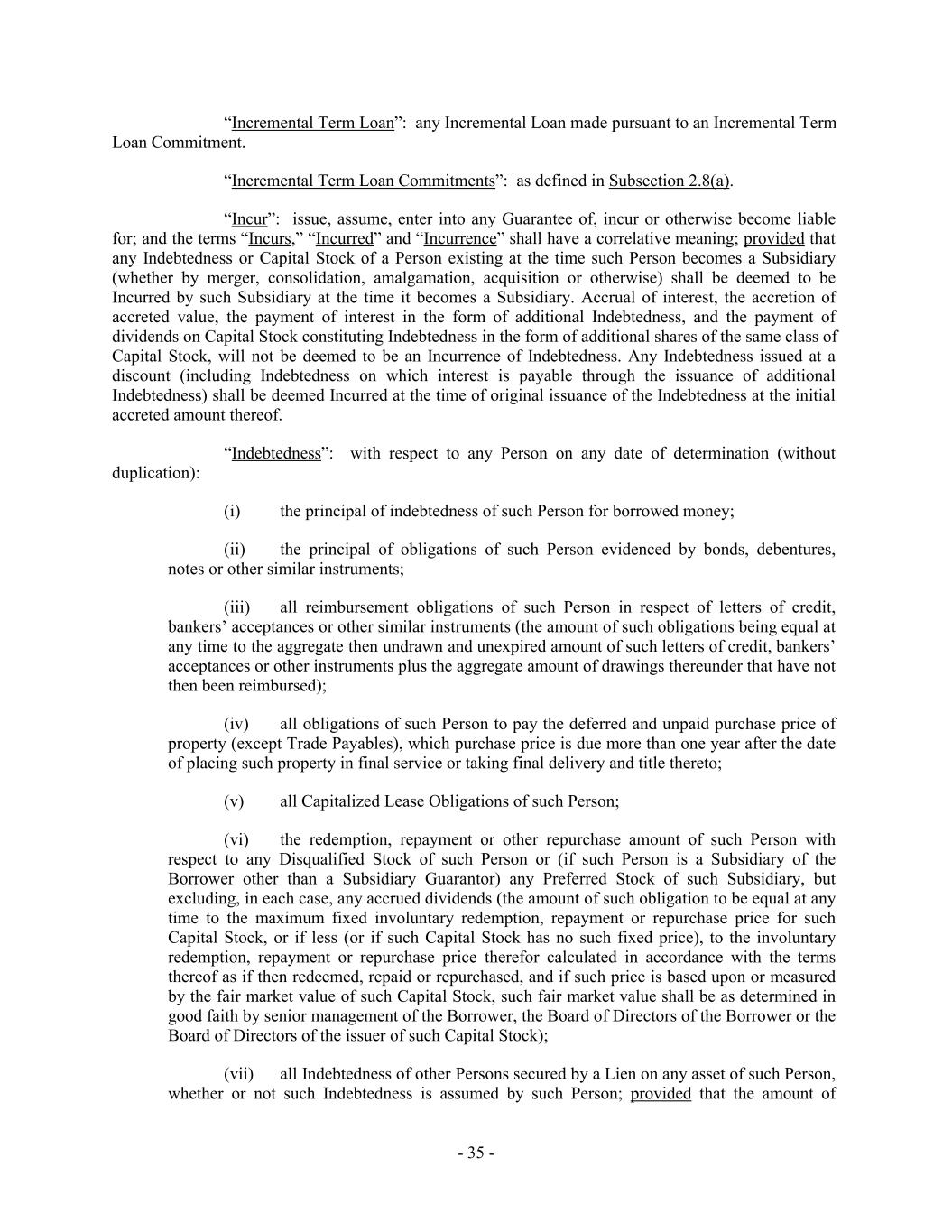 “Incremental Term Loan”: any Incremental Loan made pursuant to an Incremental Term Loan Commitment. “Incremental Term Loan Commitments”: as defined in Subsection 2.8(a). “Incur”: issue, assume, enter into any Guarantee of, incur or otherwise become liable for; and the terms “Incurs,” “Incurred” and “Incurrence” shall have a correlative meaning; provided that any Indebtedness or Capital Stock of a Person existing at the time such Person becomes a Subsidiary (whether by merger, consolidation, amalgamation, acquisition or otherwise) shall be deemed to be Incurred by such Subsidiary at the time it becomes a Subsidiary. Accrual of interest, the accretion of accreted value, the payment of interest in the form of additional Indebtedness, and the payment of dividends on Capital Stock constituting Indebtedness in the form of additional shares of the same class of Capital Stock, will not be deemed to be an Incurrence of Indebtedness. Any Indebtedness issued at a discount (including Indebtedness on which interest is payable through the issuance of additional Indebtedness) shall be deemed Incurred at the time of original issuance of the Indebtedness at the initial accreted amount thereof. “Indebtedness”: with respect to any Person on any date of determination (without duplication): (i) the principal of indebtedness of such Person for borrowed money; (ii) the principal of obligations of such Person evidenced by bonds, debentures, notes or other similar instruments; (iii) all reimbursement obligations of such Person in respect of letters of credit, bankers’ acceptances or other similar instruments (the amount of such obligations being equal at any time to the aggregate then undrawn and unexpired amount of such letters of credit, bankers’ acceptances or other instruments plus the aggregate amount of drawings thereunder that have not then been reimbursed); (iv) all obligations of such Person to pay the deferred and unpaid purchase price of property (except Trade Payables), which purchase price is due more than one year after the date of placing such property in final service or taking final delivery and title thereto; (v) all Capitalized Lease Obligations of such Person; (vi) the redemption, repayment or other repurchase amount of such Person with respect to any Disqualified Stock of such Person or (if such Person is a Subsidiary of the Borrower other than a Subsidiary Guarantor) any Preferred Stock of such Subsidiary, but excluding, in each case, any accrued dividends (the amount of such obligation to be equal at any time to the maximum fixed involuntary redemption, repayment or repurchase price for such Capital Stock, or if less (or if such Capital Stock has no such fixed price), to the involuntary redemption, repayment or repurchase price therefor calculated in accordance with the terms thereof as if then redeemed, repaid or repurchased, and if such price is based upon or measured by the fair market value of such Capital Stock, such fair market value shall be as determined in good faith by senior management of the Borrower, the Board of Directors of the Borrower or the Board of Directors of the issuer of such Capital Stock); (vii) all Indebtedness of other Persons secured by a Lien on any asset of such Person, whether or not such Indebtedness is assumed by such Person; provided that the amount of - 35 -