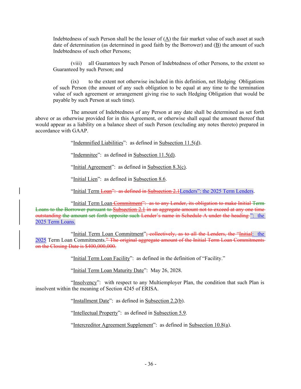 Indebtedness of such Person shall be the lesser of (A) the fair market value of such asset at such date of determination (as determined in good faith by the Borrower) and (B) the amount of such Indebtedness of such other Persons; (viii) all Guarantees by such Person of Indebtedness of other Persons, to the extent so Guaranteed by such Person; and (ix) to the extent not otherwise included in this definition, net Hedging Obligations of such Person (the amount of any such obligation to be equal at any time to the termination value of such agreement or arrangement giving rise to such Hedging Obligation that would be payable by such Person at such time). The amount of Indebtedness of any Person at any date shall be determined as set forth above or as otherwise provided for in this Agreement, or otherwise shall equal the amount thereof that would appear as a liability on a balance sheet of such Person (excluding any notes thereto) prepared in accordance with GAAP. “Indemnified Liabilities”: as defined in Subsection 11.5(d). “Indemnitee”: as defined in Subsection 11.5(d). “Initial Agreement”: as defined in Subsection 8.3(c). “Initial Lien”: as defined in Subsection 8.6. “Initial Term Loan”: as defined in Subsection 2.1Lenders”: the 2025 Term Lenders. “Initial Term Loan Commitment”: as to any Lender, its obligation to make Initial Term Loans to the Borrower pursuant to Subsection 2.1 in an aggregate amount not to exceed at any one time outstanding the amount set forth opposite such Lender’s name in Schedule A under the heading ”: the 2025 Term Loans. “Initial Term Loan Commitment”; collectively, as to all the Lenders, the “Initial: the 2025 Term Loan Commitments.” The original aggregate amount of the Initial Term Loan Commitments on the Closing Date is $400,000,000. “Initial Term Loan Facility”: as defined in the definition of “Facility.” “Initial Term Loan Maturity Date”: May 26, 2028. “Insolvency”: with respect to any Multiemployer Plan, the condition that such Plan is insolvent within the meaning of Section 4245 of ERISA. “Installment Date”: as defined in Subsection 2.2(b). “Intellectual Property”: as defined in Subsection 5.9. “Intercreditor Agreement Supplement”: as defined in Subsection 10.8(a). - 36 -