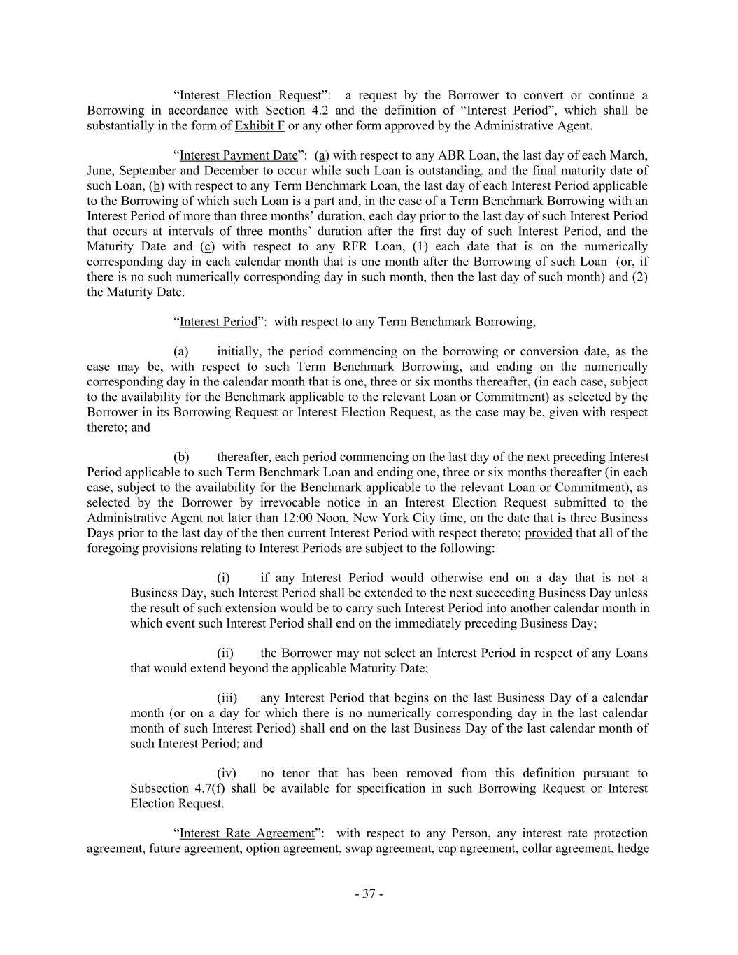 “Interest Election Request”: a request by the Borrower to convert or continue a Borrowing in accordance with Section 4.2 and the definition of “Interest Period”, which shall be substantially in the form of Exhibit F or any other form approved by the Administrative Agent. “Interest Payment Date”: (a) with respect to any ABR Loan, the last day of each March, June, September and December to occur while such Loan is outstanding, and the final maturity date of such Loan, (b) with respect to any Term Benchmark Loan, the last day of each Interest Period applicable to the Borrowing of which such Loan is a part and, in the case of a Term Benchmark Borrowing with an Interest Period of more than three months’ duration, each day prior to the last day of such Interest Period that occurs at intervals of three months’ duration after the first day of such Interest Period, and the Maturity Date and (c) with respect to any RFR Loan, (1) each date that is on the numerically corresponding day in each calendar month that is one month after the Borrowing of such Loan (or, if there is no such numerically corresponding day in such month, then the last day of such month) and (2) the Maturity Date. “Interest Period”: with respect to any Term Benchmark Borrowing, (a) initially, the period commencing on the borrowing or conversion date, as the case may be, with respect to such Term Benchmark Borrowing, and ending on the numerically corresponding day in the calendar month that is one, three or six months thereafter, (in each case, subject to the availability for the Benchmark applicable to the relevant Loan or Commitment) as selected by the Borrower in its Borrowing Request or Interest Election Request, as the case may be, given with respect thereto; and (b) thereafter, each period commencing on the last day of the next preceding Interest Period applicable to such Term Benchmark Loan and ending one, three or six months thereafter (in each case, subject to the availability for the Benchmark applicable to the relevant Loan or Commitment), as selected by the Borrower by irrevocable notice in an Interest Election Request submitted to the Administrative Agent not later than 12:00 Noon, New York City time, on the date that is three Business Days prior to the last day of the then current Interest Period with respect thereto; provided that all of the foregoing provisions relating to Interest Periods are subject to the following: (i) if any Interest Period would otherwise end on a day that is not a Business Day, such Interest Period shall be extended to the next succeeding Business Day unless the result of such extension would be to carry such Interest Period into another calendar month in which event such Interest Period shall end on the immediately preceding Business Day; (ii) the Borrower may not select an Interest Period in respect of any Loans that would extend beyond the applicable Maturity Date; (iii) any Interest Period that begins on the last Business Day of a calendar month (or on a day for which there is no numerically corresponding day in the last calendar month of such Interest Period) shall end on the last Business Day of the last calendar month of such Interest Period; and (iv) no tenor that has been removed from this definition pursuant to Subsection 4.7(f) shall be available for specification in such Borrowing Request or Interest Election Request. “Interest Rate Agreement”: with respect to any Person, any interest rate protection agreement, future agreement, option agreement, swap agreement, cap agreement, collar agreement, hedge - 37 -