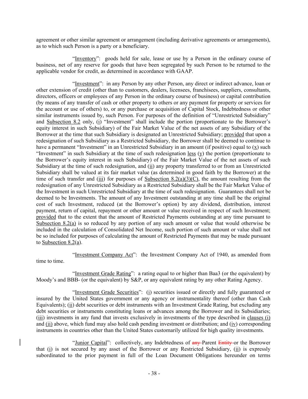 agreement or other similar agreement or arrangement (including derivative agreements or arrangements), as to which such Person is a party or a beneficiary. “Inventory”: goods held for sale, lease or use by a Person in the ordinary course of business, net of any reserve for goods that have been segregated by such Person to be returned to the applicable vendor for credit, as determined in accordance with GAAP. “Investment”: in any Person by any other Person, any direct or indirect advance, loan or other extension of credit (other than to customers, dealers, licensees, franchisees, suppliers, consultants, directors, officers or employees of any Person in the ordinary course of business) or capital contribution (by means of any transfer of cash or other property to others or any payment for property or services for the account or use of others) to, or any purchase or acquisition of Capital Stock, Indebtedness or other similar instruments issued by, such Person. For purposes of the definition of “Unrestricted Subsidiary” and Subsection 8.2 only, (i) “Investment” shall include the portion (proportionate to the Borrower’s equity interest in such Subsidiary) of the Fair Market Value of the net assets of any Subsidiary of the Borrower at the time that such Subsidiary is designated an Unrestricted Subsidiary; provided that upon a redesignation of such Subsidiary as a Restricted Subsidiary, the Borrower shall be deemed to continue to have a permanent “Investment” in an Unrestricted Subsidiary in an amount (if positive) equal to (x) such “Investment” in such Subsidiary at the time of such redesignation less (y) the portion (proportionate to the Borrower’s equity interest in such Subsidiary) of the Fair Market Value of the net assets of such Subsidiary at the time of such redesignation, and (ii) any property transferred to or from an Unrestricted Subsidiary shall be valued at its fair market value (as determined in good faith by the Borrower) at the time of such transfer and (iii) for purposes of Subsection 8.2(a)(3)(C), the amount resulting from the redesignation of any Unrestricted Subsidiary as a Restricted Subsidiary shall be the Fair Market Value of the Investment in such Unrestricted Subsidiary at the time of such redesignation. Guarantees shall not be deemed to be Investments. The amount of any Investment outstanding at any time shall be the original cost of such Investment, reduced (at the Borrower’s option) by any dividend, distribution, interest payment, return of capital, repayment or other amount or value received in respect of such Investment; provided that to the extent that the amount of Restricted Payments outstanding at any time pursuant to Subsection 8.2(a) is so reduced by any portion of any such amount or value that would otherwise be included in the calculation of Consolidated Net Income, such portion of such amount or value shall not be so included for purposes of calculating the amount of Restricted Payments that may be made pursuant to Subsection 8.2(a). “Investment Company Act”: the Investment Company Act of 1940, as amended from time to time. “Investment Grade Rating”: a rating equal to or higher than Baa3 (or the equivalent) by Moody’s and BBB- (or the equivalent) by S&P, or any equivalent rating by any other Rating Agency. “Investment Grade Securities”: (i) securities issued or directly and fully guaranteed or insured by the United States government or any agency or instrumentality thereof (other than Cash Equivalents); (ii) debt securities or debt instruments with an Investment Grade Rating, but excluding any debt securities or instruments constituting loans or advances among the Borrower and its Subsidiaries; (iii) investments in any fund that invests exclusively in investments of the type described in clauses (i) and (ii) above, which fund may also hold cash pending investment or distribution; and (iv) corresponding instruments in countries other than the United States customarily utilized for high quality investments. “Junior Capital”: collectively, any Indebtedness of any Parent Entity or the Borrower that (i) is not secured by any asset of the Borrower or any Restricted Subsidiary, (ii) is expressly subordinated to the prior payment in full of the Loan Document Obligations hereunder on terms - 38 -