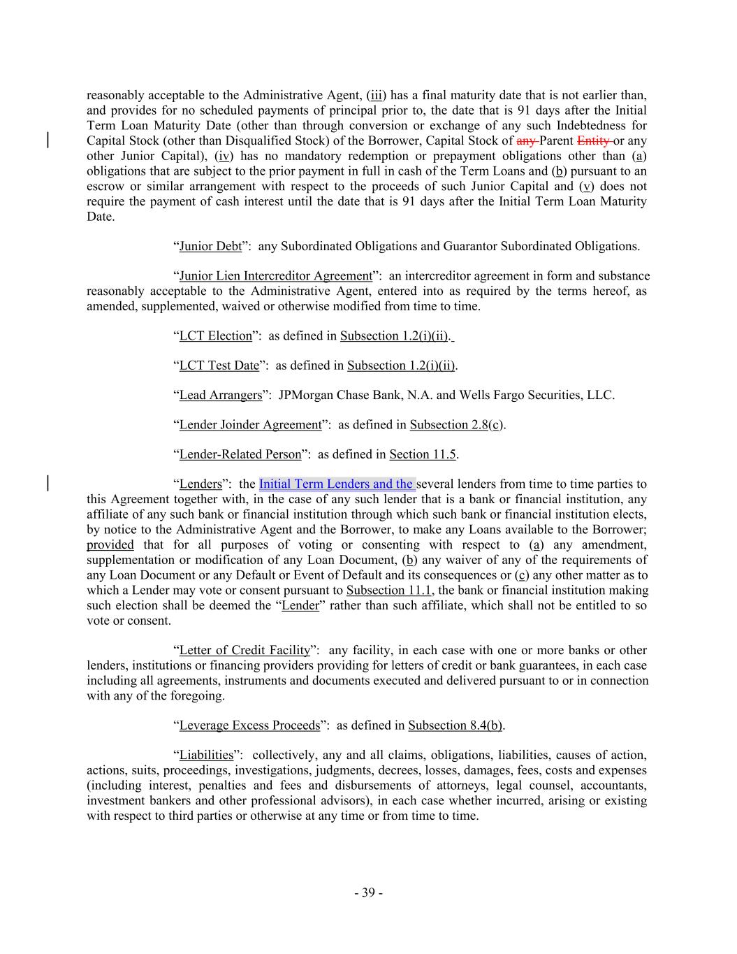 reasonably acceptable to the Administrative Agent, (iii) has a final maturity date that is not earlier than, and provides for no scheduled payments of principal prior to, the date that is 91 days after the Initial Term Loan Maturity Date (other than through conversion or exchange of any such Indebtedness for Capital Stock (other than Disqualified Stock) of the Borrower, Capital Stock of any Parent Entity or any other Junior Capital), (iv) has no mandatory redemption or prepayment obligations other than (a) obligations that are subject to the prior payment in full in cash of the Term Loans and (b) pursuant to an escrow or similar arrangement with respect to the proceeds of such Junior Capital and (v) does not require the payment of cash interest until the date that is 91 days after the Initial Term Loan Maturity Date. “Junior Debt”: any Subordinated Obligations and Guarantor Subordinated Obligations. “Junior Lien Intercreditor Agreement”: an intercreditor agreement in form and substance reasonably acceptable to the Administrative Agent, entered into as required by the terms hereof, as amended, supplemented, waived or otherwise modified from time to time. “LCT Election”: as defined in Subsection 1.2(i)(ii). “LCT Test Date”: as defined in Subsection 1.2(i)(ii). “Lead Arrangers”: JPMorgan Chase Bank, N.A. and Wells Fargo Securities, LLC. “Lender Joinder Agreement”: as defined in Subsection 2.8(c). “Lender-Related Person”: as defined in Section 11.5. “Lenders”: the Initial Term Lenders and the several lenders from time to time parties to this Agreement together with, in the case of any such lender that is a bank or financial institution, any affiliate of any such bank or financial institution through which such bank or financial institution elects, by notice to the Administrative Agent and the Borrower, to make any Loans available to the Borrower; provided that for all purposes of voting or consenting with respect to (a) any amendment, supplementation or modification of any Loan Document, (b) any waiver of any of the requirements of any Loan Document or any Default or Event of Default and its consequences or (c) any other matter as to which a Lender may vote or consent pursuant to Subsection 11.1, the bank or financial institution making such election shall be deemed the “Lender” rather than such affiliate, which shall not be entitled to so vote or consent. “Letter of Credit Facility”: any facility, in each case with one or more banks or other lenders, institutions or financing providers providing for letters of credit or bank guarantees, in each case including all agreements, instruments and documents executed and delivered pursuant to or in connection with any of the foregoing. “Leverage Excess Proceeds”: as defined in Subsection 8.4(b). “Liabilities”: collectively, any and all claims, obligations, liabilities, causes of action, actions, suits, proceedings, investigations, judgments, decrees, losses, damages, fees, costs and expenses (including interest, penalties and fees and disbursements of attorneys, legal counsel, accountants, investment bankers and other professional advisors), in each case whether incurred, arising or existing with respect to third parties or otherwise at any time or from time to time. - 39 -