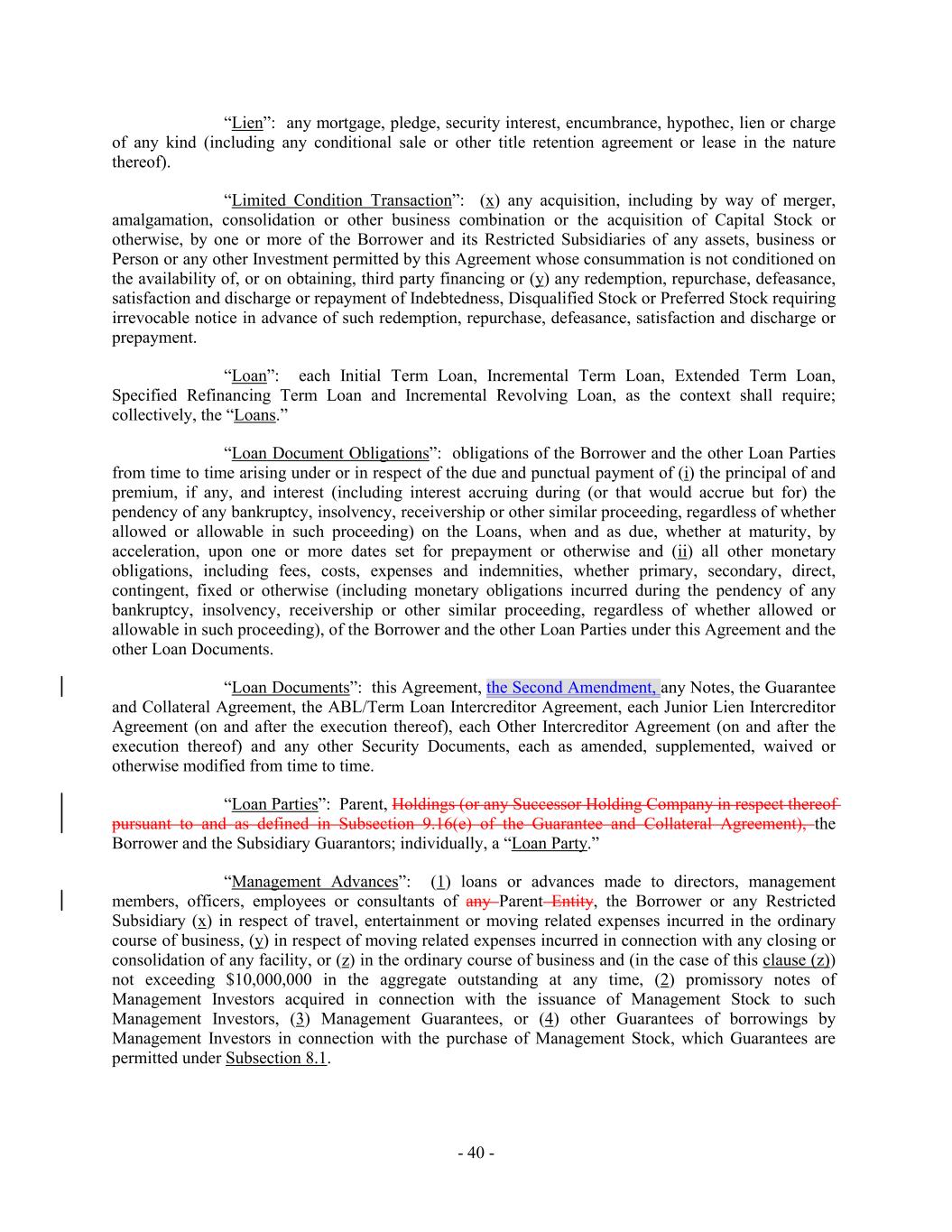 “Lien”: any mortgage, pledge, security interest, encumbrance, hypothec, lien or charge of any kind (including any conditional sale or other title retention agreement or lease in the nature thereof). “Limited Condition Transaction”: (x) any acquisition, including by way of merger, amalgamation, consolidation or other business combination or the acquisition of Capital Stock or otherwise, by one or more of the Borrower and its Restricted Subsidiaries of any assets, business or Person or any other Investment permitted by this Agreement whose consummation is not conditioned on the availability of, or on obtaining, third party financing or (y) any redemption, repurchase, defeasance, satisfaction and discharge or repayment of Indebtedness, Disqualified Stock or Preferred Stock requiring irrevocable notice in advance of such redemption, repurchase, defeasance, satisfaction and discharge or prepayment. “Loan”: each Initial Term Loan, Incremental Term Loan, Extended Term Loan, Specified Refinancing Term Loan and Incremental Revolving Loan, as the context shall require; collectively, the “Loans.” “Loan Document Obligations”: obligations of the Borrower and the other Loan Parties from time to time arising under or in respect of the due and punctual payment of (i) the principal of and premium, if any, and interest (including interest accruing during (or that would accrue but for) the pendency of any bankruptcy, insolvency, receivership or other similar proceeding, regardless of whether allowed or allowable in such proceeding) on the Loans, when and as due, whether at maturity, by acceleration, upon one or more dates set for prepayment or otherwise and (ii) all other monetary obligations, including fees, costs, expenses and indemnities, whether primary, secondary, direct, contingent, fixed or otherwise (including monetary obligations incurred during the pendency of any bankruptcy, insolvency, receivership or other similar proceeding, regardless of whether allowed or allowable in such proceeding), of the Borrower and the other Loan Parties under this Agreement and the other Loan Documents. “Loan Documents”: this Agreement, the Second Amendment, any Notes, the Guarantee and Collateral Agreement, the ABL/Term Loan Intercreditor Agreement, each Junior Lien Intercreditor Agreement (on and after the execution thereof), each Other Intercreditor Agreement (on and after the execution thereof) and any other Security Documents, each as amended, supplemented, waived or otherwise modified from time to time. “Loan Parties”: Parent, Holdings (or any Successor Holding Company in respect thereof pursuant to and as defined in Subsection 9.16(e) of the Guarantee and Collateral Agreement), the Borrower and the Subsidiary Guarantors; individually, a “Loan Party.” “Management Advances”: (1) loans or advances made to directors, management members, officers, employees or consultants of any Parent Entity, the Borrower or any Restricted Subsidiary (x) in respect of travel, entertainment or moving related expenses incurred in the ordinary course of business, (y) in respect of moving related expenses incurred in connection with any closing or consolidation of any facility, or (z) in the ordinary course of business and (in the case of this clause (z)) not exceeding $10,000,000 in the aggregate outstanding at any time, (2) promissory notes of Management Investors acquired in connection with the issuance of Management Stock to such Management Investors, (3) Management Guarantees, or (4) other Guarantees of borrowings by Management Investors in connection with the purchase of Management Stock, which Guarantees are permitted under Subsection 8.1. - 40 -