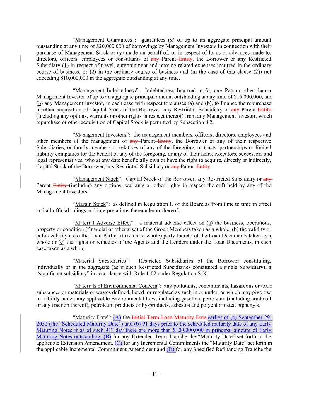 “Management Guarantees”: guarantees (x) of up to an aggregate principal amount outstanding at any time of $20,000,000 of borrowings by Management Investors in connection with their purchase of Management Stock or (y) made on behalf of, or in respect of loans or advances made to, directors, officers, employees or consultants of any Parent Entity, the Borrower or any Restricted Subsidiary (1) in respect of travel, entertainment and moving related expenses incurred in the ordinary course of business, or (2) in the ordinary course of business and (in the case of this clause (2)) not exceeding $10,000,000 in the aggregate outstanding at any time. “Management Indebtedness”: Indebtedness Incurred to (a) any Person other than a Management Investor of up to an aggregate principal amount outstanding at any time of $15,000,000, and (b) any Management Investor, in each case with respect to clauses (a) and (b), to finance the repurchase or other acquisition of Capital Stock of the Borrower, any Restricted Subsidiary or any Parent Entity (including any options, warrants or other rights in respect thereof) from any Management Investor, which repurchase or other acquisition of Capital Stock is permitted by Subsection 8.2. “Management Investors”: the management members, officers, directors, employees and other members of the management of any Parent Entity, the Borrower or any of their respective Subsidiaries, or family members or relatives of any of the foregoing, or trusts, partnerships or limited liability companies for the benefit of any of the foregoing, or any of their heirs, executors, successors and legal representatives, who at any date beneficially own or have the right to acquire, directly or indirectly, Capital Stock of the Borrower, any Restricted Subsidiary or any Parent Entity. “Management Stock”: Capital Stock of the Borrower, any Restricted Subsidiary or any Parent Entity (including any options, warrants or other rights in respect thereof) held by any of the Management Investors. “Margin Stock”: as defined in Regulation U of the Board as from time to time in effect and all official rulings and interpretations thereunder or thereof. “Material Adverse Effect”: a material adverse effect on (a) the business, operations, property or condition (financial or otherwise) of the Group Members taken as a whole, (b) the validity or enforceability as to the Loan Parties (taken as a whole) party thereto of the Loan Documents taken as a whole or (c) the rights or remedies of the Agents and the Lenders under the Loan Documents, in each case taken as a whole. “Material Subsidiaries”: Restricted Subsidiaries of the Borrower constituting, individually or in the aggregate (as if such Restricted Subsidiaries constituted a single Subsidiary), a “significant subsidiary” in accordance with Rule 1-02 under Regulation S-X. “Materials of Environmental Concern”: any pollutants, contaminants, hazardous or toxic substances or materials or wastes defined, listed, or regulated as such in or under, or which may give rise to liability under, any applicable Environmental Law, including gasoline, petroleum (including crude oil or any fraction thereof), petroleum products or by-products, asbestos and polychlorinated biphenyls. “Maturity Date”: (A) the Initial Term Loan Maturity Date,earlier of (a) September 29, 2032 (the “Scheduled Maturity Date”) and (b) 91 days prior to the scheduled maturity date of any Early Maturing Notes if as of such 91st day there are more than $100,000,000 in principal amount of Early Maturing Notes outstanding, (B) for any Extended Term Tranche the “Maturity Date” set forth in the applicable Extension Amendment, (C) for any Incremental Commitments the “Maturity Date” set forth in the applicable Incremental Commitment Amendment and (D) for any Specified Refinancing Tranche the - 41 -