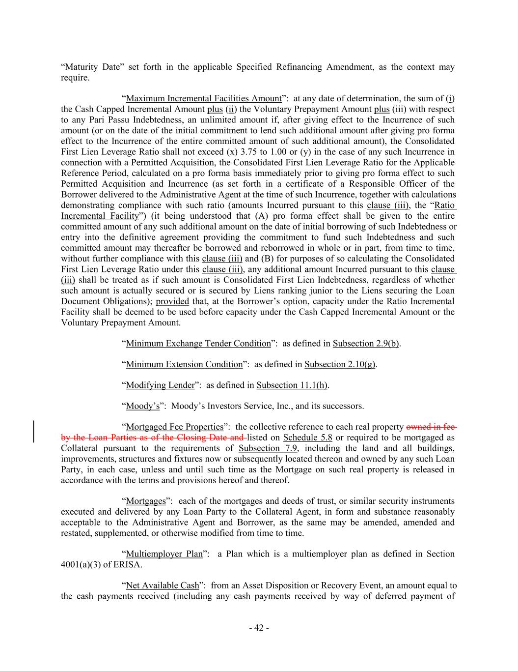 “Maturity Date” set forth in the applicable Specified Refinancing Amendment, as the context may require. “Maximum Incremental Facilities Amount”: at any date of determination, the sum of (i) the Cash Capped Incremental Amount plus (ii) the Voluntary Prepayment Amount plus (iii) with respect to any Pari Passu Indebtedness, an unlimited amount if, after giving effect to the Incurrence of such amount (or on the date of the initial commitment to lend such additional amount after giving pro forma effect to the Incurrence of the entire committed amount of such additional amount), the Consolidated First Lien Leverage Ratio shall not exceed (x) 3.75 to 1.00 or (y) in the case of any such Incurrence in connection with a Permitted Acquisition, the Consolidated First Lien Leverage Ratio for the Applicable Reference Period, calculated on a pro forma basis immediately prior to giving pro forma effect to such Permitted Acquisition and Incurrence (as set forth in a certificate of a Responsible Officer of the Borrower delivered to the Administrative Agent at the time of such Incurrence, together with calculations demonstrating compliance with such ratio (amounts Incurred pursuant to this clause (iii), the “Ratio Incremental Facility”) (it being understood that (A) pro forma effect shall be given to the entire committed amount of any such additional amount on the date of initial borrowing of such Indebtedness or entry into the definitive agreement providing the commitment to fund such Indebtedness and such committed amount may thereafter be borrowed and reborrowed in whole or in part, from time to time, without further compliance with this clause (iii) and (B) for purposes of so calculating the Consolidated First Lien Leverage Ratio under this clause (iii), any additional amount Incurred pursuant to this clause (iii) shall be treated as if such amount is Consolidated First Lien Indebtedness, regardless of whether such amount is actually secured or is secured by Liens ranking junior to the Liens securing the Loan Document Obligations); provided that, at the Borrower’s option, capacity under the Ratio Incremental Facility shall be deemed to be used before capacity under the Cash Capped Incremental Amount or the Voluntary Prepayment Amount. “Minimum Exchange Tender Condition”: as defined in Subsection 2.9(b). “Minimum Extension Condition”: as defined in Subsection 2.10(g). “Modifying Lender”: as defined in Subsection 11.1(h). “Moody’s”: Moody’s Investors Service, Inc., and its successors. “Mortgaged Fee Properties”: the collective reference to each real property owned in fee by the Loan Parties as of the Closing Date and listed on Schedule 5.8 or required to be mortgaged as Collateral pursuant to the requirements of Subsection 7.9, including the land and all buildings, improvements, structures and fixtures now or subsequently located thereon and owned by any such Loan Party, in each case, unless and until such time as the Mortgage on such real property is released in accordance with the terms and provisions hereof and thereof. “Mortgages”: each of the mortgages and deeds of trust, or similar security instruments executed and delivered by any Loan Party to the Collateral Agent, in form and substance reasonably acceptable to the Administrative Agent and Borrower, as the same may be amended, amended and restated, supplemented, or otherwise modified from time to time. “Multiemployer Plan”: a Plan which is a multiemployer plan as defined in Section 4001(a)(3) of ERISA. “Net Available Cash”: from an Asset Disposition or Recovery Event, an amount equal to the cash payments received (including any cash payments received by way of deferred payment of - 42 -