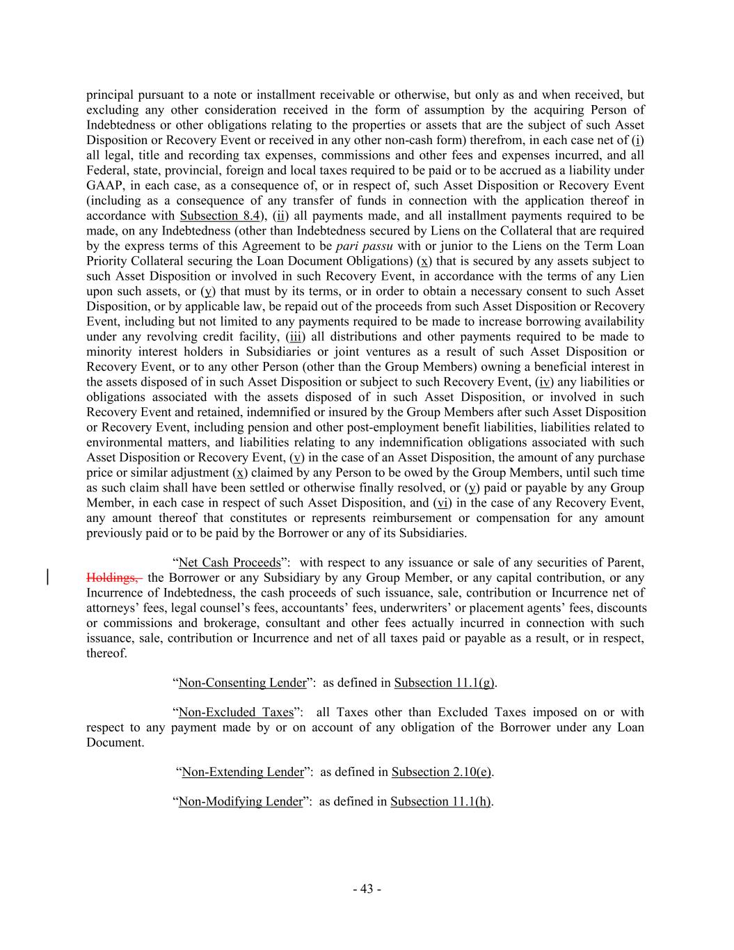 principal pursuant to a note or installment receivable or otherwise, but only as and when received, but excluding any other consideration received in the form of assumption by the acquiring Person of Indebtedness or other obligations relating to the properties or assets that are the subject of such Asset Disposition or Recovery Event or received in any other non-cash form) therefrom, in each case net of (i) all legal, title and recording tax expenses, commissions and other fees and expenses incurred, and all Federal, state, provincial, foreign and local taxes required to be paid or to be accrued as a liability under GAAP, in each case, as a consequence of, or in respect of, such Asset Disposition or Recovery Event (including as a consequence of any transfer of funds in connection with the application thereof in accordance with Subsection 8.4), (ii) all payments made, and all installment payments required to be made, on any Indebtedness (other than Indebtedness secured by Liens on the Collateral that are required by the express terms of this Agreement to be pari passu with or junior to the Liens on the Term Loan Priority Collateral securing the Loan Document Obligations) (x) that is secured by any assets subject to such Asset Disposition or involved in such Recovery Event, in accordance with the terms of any Lien upon such assets, or (y) that must by its terms, or in order to obtain a necessary consent to such Asset Disposition, or by applicable law, be repaid out of the proceeds from such Asset Disposition or Recovery Event, including but not limited to any payments required to be made to increase borrowing availability under any revolving credit facility, (iii) all distributions and other payments required to be made to minority interest holders in Subsidiaries or joint ventures as a result of such Asset Disposition or Recovery Event, or to any other Person (other than the Group Members) owning a beneficial interest in the assets disposed of in such Asset Disposition or subject to such Recovery Event, (iv) any liabilities or obligations associated with the assets disposed of in such Asset Disposition, or involved in such Recovery Event and retained, indemnified or insured by the Group Members after such Asset Disposition or Recovery Event, including pension and other post-employment benefit liabilities, liabilities related to environmental matters, and liabilities relating to any indemnification obligations associated with such Asset Disposition or Recovery Event, (v) in the case of an Asset Disposition, the amount of any purchase price or similar adjustment (x) claimed by any Person to be owed by the Group Members, until such time as such claim shall have been settled or otherwise finally resolved, or (y) paid or payable by any Group Member, in each case in respect of such Asset Disposition, and (vi) in the case of any Recovery Event, any amount thereof that constitutes or represents reimbursement or compensation for any amount previously paid or to be paid by the Borrower or any of its Subsidiaries. “Net Cash Proceeds”: with respect to any issuance or sale of any securities of Parent, Holdings, the Borrower or any Subsidiary by any Group Member, or any capital contribution, or any Incurrence of Indebtedness, the cash proceeds of such issuance, sale, contribution or Incurrence net of attorneys’ fees, legal counsel’s fees, accountants’ fees, underwriters’ or placement agents’ fees, discounts or commissions and brokerage, consultant and other fees actually incurred in connection with such issuance, sale, contribution or Incurrence and net of all taxes paid or payable as a result, or in respect, thereof. “Non-Consenting Lender”: as defined in Subsection 11.1(g). “Non-Excluded Taxes”: all Taxes other than Excluded Taxes imposed on or with respect to any payment made by or on account of any obligation of the Borrower under any Loan Document. “Non-Extending Lender”: as defined in Subsection 2.10(e). “Non-Modifying Lender”: as defined in Subsection 11.1(h). - 43 -