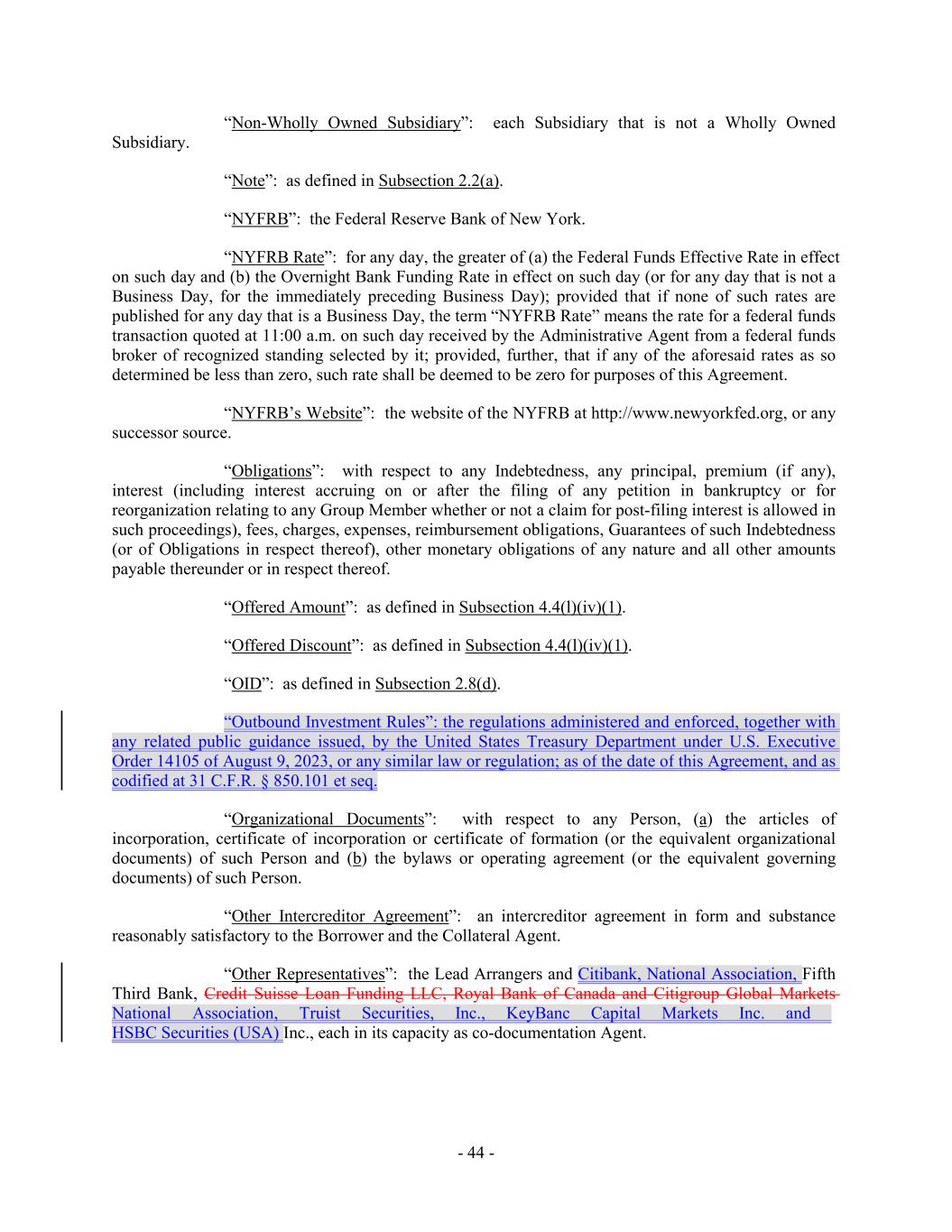 “Non-Wholly Owned Subsidiary”: each Subsidiary that is not a Wholly Owned Subsidiary. “Note”: as defined in Subsection 2.2(a). “NYFRB”: the Federal Reserve Bank of New York. “NYFRB Rate”: for any day, the greater of (a) the Federal Funds Effective Rate in effect on such day and (b) the Overnight Bank Funding Rate in effect on such day (or for any day that is not a Business Day, for the immediately preceding Business Day); provided that if none of such rates are published for any day that is a Business Day, the term “NYFRB Rate” means the rate for a federal funds transaction quoted at 11:00 a.m. on such day received by the Administrative Agent from a federal funds broker of recognized standing selected by it; provided, further, that if any of the aforesaid rates as so determined be less than zero, such rate shall be deemed to be zero for purposes of this Agreement. “NYFRB’s Website”: the website of the NYFRB at http://www.newyorkfed.org, or any successor source. “Obligations”: with respect to any Indebtedness, any principal, premium (if any), interest (including interest accruing on or after the filing of any petition in bankruptcy or for reorganization relating to any Group Member whether or not a claim for post-filing interest is allowed in such proceedings), fees, charges, expenses, reimbursement obligations, Guarantees of such Indebtedness (or of Obligations in respect thereof), other monetary obligations of any nature and all other amounts payable thereunder or in respect thereof. “Offered Amount”: as defined in Subsection 4.4(l)(iv)(1). “Offered Discount”: as defined in Subsection 4.4(l)(iv)(1). “OID”: as defined in Subsection 2.8(d). “Outbound Investment Rules”: the regulations administered and enforced, together with any related public guidance issued, by the United States Treasury Department under U.S. Executive Order 14105 of August 9, 2023, or any similar law or regulation; as of the date of this Agreement, and as codified at 31 C.F.R. § 850.101 et seq. “Organizational Documents”: with respect to any Person, (a) the articles of incorporation, certificate of incorporation or certificate of formation (or the equivalent organizational documents) of such Person and (b) the bylaws or operating agreement (or the equivalent governing documents) of such Person. “Other Intercreditor Agreement”: an intercreditor agreement in form and substance reasonably satisfactory to the Borrower and the Collateral Agent. “Other Representatives”: the Lead Arrangers and Citibank, National Association, Fifth Third Bank, Credit Suisse Loan Funding LLC, Royal Bank of Canada and Citigroup Global Markets National Association, Truist Securities, Inc., KeyBanc Capital Markets Inc. and HSBC Securities (USA) Inc., each in its capacity as co-documentation Agent. - 44 -