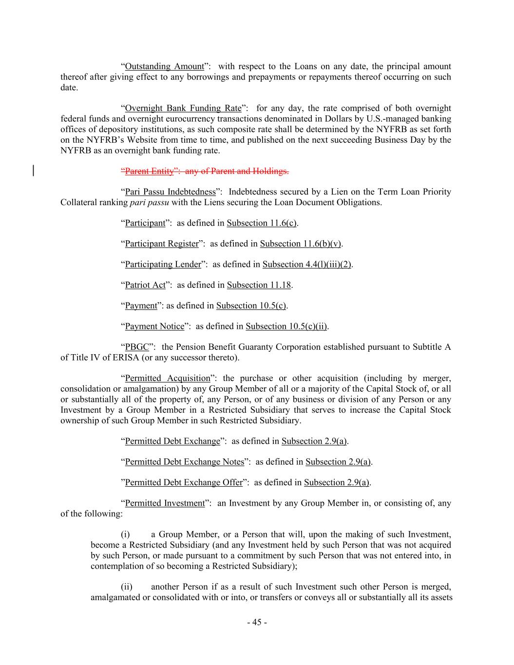“Outstanding Amount”: with respect to the Loans on any date, the principal amount thereof after giving effect to any borrowings and prepayments or repayments thereof occurring on such date. “Overnight Bank Funding Rate”: for any day, the rate comprised of both overnight federal funds and overnight eurocurrency transactions denominated in Dollars by U.S.-managed banking offices of depository institutions, as such composite rate shall be determined by the NYFRB as set forth on the NYFRB’s Website from time to time, and published on the next succeeding Business Day by the NYFRB as an overnight bank funding rate. “Parent Entity”: any of Parent and Holdings. “Pari Passu Indebtedness”: Indebtedness secured by a Lien on the Term Loan Priority Collateral ranking pari passu with the Liens securing the Loan Document Obligations. “Participant”: as defined in Subsection 11.6(c). “Participant Register”: as defined in Subsection 11.6(b)(v). “Participating Lender”: as defined in Subsection 4.4(l)(iii)(2). “Patriot Act”: as defined in Subsection 11.18. “Payment”: as defined in Subsection 10.5(c). “Payment Notice”: as defined in Subsection 10.5(c)(ii). “PBGC”: the Pension Benefit Guaranty Corporation established pursuant to Subtitle A of Title IV of ERISA (or any successor thereto). “Permitted Acquisition”: the purchase or other acquisition (including by merger, consolidation or amalgamation) by any Group Member of all or a majority of the Capital Stock of, or all or substantially all of the property of, any Person, or of any business or division of any Person or any Investment by a Group Member in a Restricted Subsidiary that serves to increase the Capital Stock ownership of such Group Member in such Restricted Subsidiary. “Permitted Debt Exchange”: as defined in Subsection 2.9(a). “Permitted Debt Exchange Notes”: as defined in Subsection 2.9(a). ”Permitted Debt Exchange Offer”: as defined in Subsection 2.9(a). “Permitted Investment”: an Investment by any Group Member in, or consisting of, any of the following: (i) a Group Member, or a Person that will, upon the making of such Investment, become a Restricted Subsidiary (and any Investment held by such Person that was not acquired by such Person, or made pursuant to a commitment by such Person that was not entered into, in contemplation of so becoming a Restricted Subsidiary); (ii) another Person if as a result of such Investment such other Person is merged, amalgamated or consolidated with or into, or transfers or conveys all or substantially all its assets - 45 -