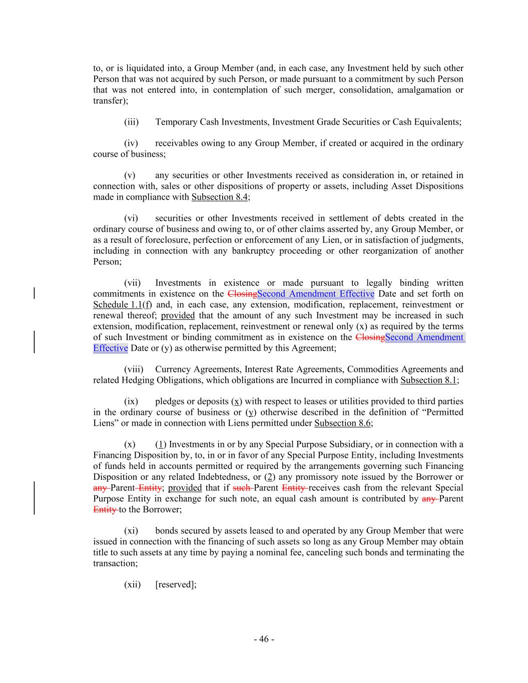 to, or is liquidated into, a Group Member (and, in each case, any Investment held by such other Person that was not acquired by such Person, or made pursuant to a commitment by such Person that was not entered into, in contemplation of such merger, consolidation, amalgamation or transfer); (iii) Temporary Cash Investments, Investment Grade Securities or Cash Equivalents; (iv) receivables owing to any Group Member, if created or acquired in the ordinary course of business; (v) any securities or other Investments received as consideration in, or retained in connection with, sales or other dispositions of property or assets, including Asset Dispositions made in compliance with Subsection 8.4; (vi) securities or other Investments received in settlement of debts created in the ordinary course of business and owing to, or of other claims asserted by, any Group Member, or as a result of foreclosure, perfection or enforcement of any Lien, or in satisfaction of judgments, including in connection with any bankruptcy proceeding or other reorganization of another Person; (vii) Investments in existence or made pursuant to legally binding written commitments in existence on the ClosingSecond Amendment Effective Date and set forth on Schedule 1.1(f) and, in each case, any extension, modification, replacement, reinvestment or renewal thereof; provided that the amount of any such Investment may be increased in such extension, modification, replacement, reinvestment or renewal only (x) as required by the terms of such Investment or binding commitment as in existence on the ClosingSecond Amendment Effective Date or (y) as otherwise permitted by this Agreement; (viii) Currency Agreements, Interest Rate Agreements, Commodities Agreements and related Hedging Obligations, which obligations are Incurred in compliance with Subsection 8.1; (ix) pledges or deposits (x) with respect to leases or utilities provided to third parties in the ordinary course of business or (y) otherwise described in the definition of “Permitted Liens” or made in connection with Liens permitted under Subsection 8.6; (x) (1) Investments in or by any Special Purpose Subsidiary, or in connection with a Financing Disposition by, to, in or in favor of any Special Purpose Entity, including Investments of funds held in accounts permitted or required by the arrangements governing such Financing Disposition or any related Indebtedness, or (2) any promissory note issued by the Borrower or any Parent Entity; provided that if such Parent Entity receives cash from the relevant Special Purpose Entity in exchange for such note, an equal cash amount is contributed by any Parent Entity to the Borrower; (xi) bonds secured by assets leased to and operated by any Group Member that were issued in connection with the financing of such assets so long as any Group Member may obtain title to such assets at any time by paying a nominal fee, canceling such bonds and terminating the transaction; (xii) [reserved]; - 46 -