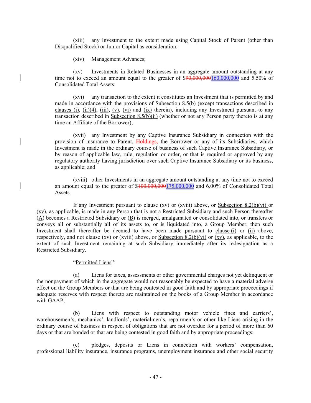 (xiii) any Investment to the extent made using Capital Stock of Parent (other than Disqualified Stock) or Junior Capital as consideration; (xiv) Management Advances; (xv) Investments in Related Businesses in an aggregate amount outstanding at any time not to exceed an amount equal to the greater of $90,000,000160,000,000 and 5.50% of Consolidated Total Assets; (xvi) any transaction to the extent it constitutes an Investment that is permitted by and made in accordance with the provisions of Subsection 8.5(b) (except transactions described in clauses (i), (ii)(4), (iii), (v), (vi) and (ix) therein), including any Investment pursuant to any transaction described in Subsection 8.5(b)(ii) (whether or not any Person party thereto is at any time an Affiliate of the Borrower); (xvii) any Investment by any Captive Insurance Subsidiary in connection with the provision of insurance to Parent, Holdings, the Borrower or any of its Subsidiaries, which Investment is made in the ordinary course of business of such Captive Insurance Subsidiary, or by reason of applicable law, rule, regulation or order, or that is required or approved by any regulatory authority having jurisdiction over such Captive Insurance Subsidiary or its business, as applicable; and (xviii) other Investments in an aggregate amount outstanding at any time not to exceed an amount equal to the greater of $100,000,000175,000,000 and 6.00% of Consolidated Total Assets. If any Investment pursuant to clause (xv) or (xviii) above, or Subsection 8.2(b)(vi) or (xv), as applicable, is made in any Person that is not a Restricted Subsidiary and such Person thereafter (A) becomes a Restricted Subsidiary or (B) is merged, amalgamated or consolidated into, or transfers or conveys all or substantially all of its assets to, or is liquidated into, a Group Member, then such Investment shall thereafter be deemed to have been made pursuant to clause (i) or (ii) above, respectively, and not clause (xv) or (xviii) above, or Subsection 8.2(b)(vi) or (xv), as applicable, to the extent of such Investment remaining at such Subsidiary immediately after its redesignation as a Restricted Subsidiary. “Permitted Liens”: (a) Liens for taxes, assessments or other governmental charges not yet delinquent or the nonpayment of which in the aggregate would not reasonably be expected to have a material adverse effect on the Group Members or that are being contested in good faith and by appropriate proceedings if adequate reserves with respect thereto are maintained on the books of a Group Member in accordance with GAAP; (b) Liens with respect to outstanding motor vehicle fines and carriers’, warehousemen’s, mechanics’, landlords’, materialmen’s, repairmen’s or other like Liens arising in the ordinary course of business in respect of obligations that are not overdue for a period of more than 60 days or that are bonded or that are being contested in good faith and by appropriate proceedings; (c) pledges, deposits or Liens in connection with workers’ compensation, professional liability insurance, insurance programs, unemployment insurance and other social security - 47 -