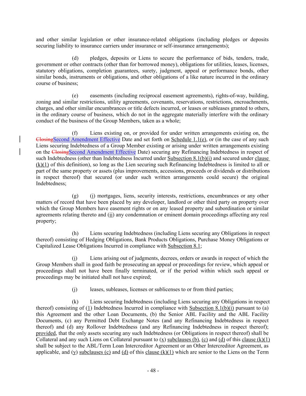 and other similar legislation or other insurance-related obligations (including pledges or deposits securing liability to insurance carriers under insurance or self-insurance arrangements); (d) pledges, deposits or Liens to secure the performance of bids, tenders, trade, government or other contracts (other than for borrowed money), obligations for utilities, leases, licenses, statutory obligations, completion guarantees, surety, judgment, appeal or performance bonds, other similar bonds, instruments or obligations, and other obligations of a like nature incurred in the ordinary course of business; (e) easements (including reciprocal easement agreements), rights-of-way, building, zoning and similar restrictions, utility agreements, covenants, reservations, restrictions, encroachments, charges, and other similar encumbrances or title defects incurred, or leases or subleases granted to others, in the ordinary course of business, which do not in the aggregate materially interfere with the ordinary conduct of the business of the Group Members, taken as a whole; (f) Liens existing on, or provided for under written arrangements existing on, the ClosingSecond Amendment Effective Date and set forth on Schedule 1.1(e), or (in the case of any such Liens securing Indebtedness of a Group Member existing or arising under written arrangements existing on the ClosingSecond Amendment Effective Date) securing any Refinancing Indebtedness in respect of such Indebtedness (other than Indebtedness Incurred under Subsection 8.1(b)(i) and secured under clause (k)(1) of this definition), so long as the Lien securing such Refinancing Indebtedness is limited to all or part of the same property or assets (plus improvements, accessions, proceeds or dividends or distributions in respect thereof) that secured (or under such written arrangements could secure) the original Indebtedness; (g) (i) mortgages, liens, security interests, restrictions, encumbrances or any other matters of record that have been placed by any developer, landlord or other third party on property over which the Group Members have easement rights or on any leased property and subordination or similar agreements relating thereto and (ii) any condemnation or eminent domain proceedings affecting any real property; (h) Liens securing Indebtedness (including Liens securing any Obligations in respect thereof) consisting of Hedging Obligations, Bank Products Obligations, Purchase Money Obligations or Capitalized Lease Obligations Incurred in compliance with Subsection 8.1; (i) Liens arising out of judgments, decrees, orders or awards in respect of which the Group Members shall in good faith be prosecuting an appeal or proceedings for review, which appeal or proceedings shall not have been finally terminated, or if the period within which such appeal or proceedings may be initiated shall not have expired; (j) leases, subleases, licenses or sublicenses to or from third parties; (k) Liens securing Indebtedness (including Liens securing any Obligations in respect thereof) consisting of (1) Indebtedness Incurred in compliance with Subsection 8.1(b)(i) pursuant to (a) this Agreement and the other Loan Documents, (b) the Senior ABL Facility and the ABL Facility Documents, (c) any Permitted Debt Exchange Notes (and any Refinancing Indebtedness in respect thereof) and (d) any Rollover Indebtedness (and any Refinancing Indebtedness in respect thereof); provided, that the only assets securing any such Indebtedness (or Obligations in respect thereof) shall be Collateral and any such Liens on Collateral pursuant to (x) subclauses (b), (c) and (d) of this clause (k)(1) shall be subject to the ABL/Term Loan Intercreditor Agreement or an Other Intercreditor Agreement, as applicable, and (y) subclauses (c) and (d) of this clause (k)(1) which are senior to the Liens on the Term - 48 -