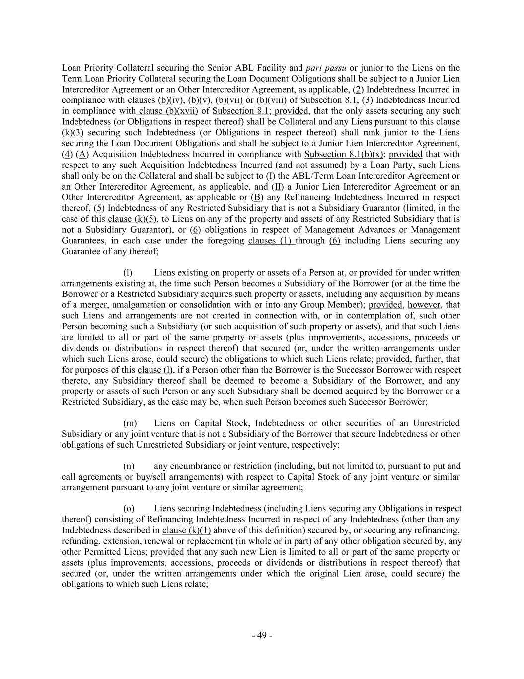 Loan Priority Collateral securing the Senior ABL Facility and pari passu or junior to the Liens on the Term Loan Priority Collateral securing the Loan Document Obligations shall be subject to a Junior Lien Intercreditor Agreement or an Other Intercreditor Agreement, as applicable, (2) Indebtedness Incurred in compliance with clauses (b)(iv), (b)(v), (b)(vii) or (b)(viii) of Subsection 8.1, (3) Indebtedness Incurred in compliance with clause (b)(xvii) of Subsection 8.1; provided, that the only assets securing any such Indebtedness (or Obligations in respect thereof) shall be Collateral and any Liens pursuant to this clause (k)(3) securing such Indebtedness (or Obligations in respect thereof) shall rank junior to the Liens securing the Loan Document Obligations and shall be subject to a Junior Lien Intercreditor Agreement, (4) (A) Acquisition Indebtedness Incurred in compliance with Subsection 8.1(b)(x); provided that with respect to any such Acquisition Indebtedness Incurred (and not assumed) by a Loan Party, such Liens shall only be on the Collateral and shall be subject to (I) the ABL/Term Loan Intercreditor Agreement or an Other Intercreditor Agreement, as applicable, and (II) a Junior Lien Intercreditor Agreement or an Other Intercreditor Agreement, as applicable or (B) any Refinancing Indebtedness Incurred in respect thereof, (5) Indebtedness of any Restricted Subsidiary that is not a Subsidiary Guarantor (limited, in the case of this clause (k)(5), to Liens on any of the property and assets of any Restricted Subsidiary that is not a Subsidiary Guarantor), or (6) obligations in respect of Management Advances or Management Guarantees, in each case under the foregoing clauses (1) through (6) including Liens securing any Guarantee of any thereof; (l) Liens existing on property or assets of a Person at, or provided for under written arrangements existing at, the time such Person becomes a Subsidiary of the Borrower (or at the time the Borrower or a Restricted Subsidiary acquires such property or assets, including any acquisition by means of a merger, amalgamation or consolidation with or into any Group Member); provided, however, that such Liens and arrangements are not created in connection with, or in contemplation of, such other Person becoming such a Subsidiary (or such acquisition of such property or assets), and that such Liens are limited to all or part of the same property or assets (plus improvements, accessions, proceeds or dividends or distributions in respect thereof) that secured (or, under the written arrangements under which such Liens arose, could secure) the obligations to which such Liens relate; provided, further, that for purposes of this clause (l), if a Person other than the Borrower is the Successor Borrower with respect thereto, any Subsidiary thereof shall be deemed to become a Subsidiary of the Borrower, and any property or assets of such Person or any such Subsidiary shall be deemed acquired by the Borrower or a Restricted Subsidiary, as the case may be, when such Person becomes such Successor Borrower; (m) Liens on Capital Stock, Indebtedness or other securities of an Unrestricted Subsidiary or any joint venture that is not a Subsidiary of the Borrower that secure Indebtedness or other obligations of such Unrestricted Subsidiary or joint venture, respectively; (n) any encumbrance or restriction (including, but not limited to, pursuant to put and call agreements or buy/sell arrangements) with respect to Capital Stock of any joint venture or similar arrangement pursuant to any joint venture or similar agreement; (o) Liens securing Indebtedness (including Liens securing any Obligations in respect thereof) consisting of Refinancing Indebtedness Incurred in respect of any Indebtedness (other than any Indebtedness described in clause (k)(1) above of this definition) secured by, or securing any refinancing, refunding, extension, renewal or replacement (in whole or in part) of any other obligation secured by, any other Permitted Liens; provided that any such new Lien is limited to all or part of the same property or assets (plus improvements, accessions, proceeds or dividends or distributions in respect thereof) that secured (or, under the written arrangements under which the original Lien arose, could secure) the obligations to which such Liens relate; - 49 -