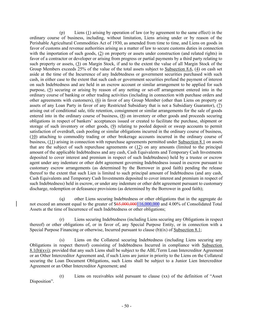 (p) Liens (1) arising by operation of law (or by agreement to the same effect) in the ordinary course of business, including, without limitation, Liens arising under or by reason of the Perishable Agricultural Commodities Act of 1930, as amended from time to time, and Liens on goods in favor of customs and revenue authorities arising as a matter of law to secure customs duties in connection with the importation of such goods, (2) on property or assets under construction (and related rights) in favor of a contractor or developer or arising from progress or partial payments by a third party relating to such property or assets, (3) on Margin Stock, if and to the extent the value of all Margin Stock of the Group Members exceeds 25% of the value of the total assets subject to Subsection 8.6, (4) on cash set aside at the time of the Incurrence of any Indebtedness or government securities purchased with such cash, in either case to the extent that such cash or government securities prefund the payment of interest on such Indebtedness and are held in an escrow account or similar arrangement to be applied for such purpose, (5) securing or arising by reason of any netting or set-off arrangement entered into in the ordinary course of banking or other trading activities (including in connection with purchase orders and other agreements with customers), (6) in favor of any Group Member (other than Liens on property or assets of any Loan Party in favor of any Restricted Subsidiary that is not a Subsidiary Guarantor), (7) arising out of conditional sale, title retention, consignment or similar arrangements for the sale of goods entered into in the ordinary course of business, (8) on inventory or other goods and proceeds securing obligations in respect of bankers’ acceptances issued or created to facilitate the purchase, shipment or storage of such inventory or other goods, (9) relating to pooled deposit or sweep accounts to permit satisfaction of overdraft, cash pooling or similar obligations incurred in the ordinary course of business, (10) attaching to commodity trading or other brokerage accounts incurred in the ordinary course of business, (11) arising in connection with repurchase agreements permitted under Subsection 8.1 on assets that are the subject of such repurchase agreements or (12) on any amounts (limited to the principal amount of the applicable Indebtedness and any cash, Cash Equivalents and Temporary Cash Investments deposited to cover interest and premium in respect of such Indebtedness) held by a trustee or escrow agent under any indenture or other debt agreement governing Indebtedness issued in escrow pursuant to customary escrow arrangements (as determined by the Borrower in good faith) pending the release thereof to the extent that such Lien is limited to such principal amount of Indebtedness (and any cash, Cash Equivalents and Temporary Cash Investments deposited to cover interest and premium in respect of such Indebtedness) held in escrow, or under any indenture or other debt agreement pursuant to customary discharge, redemption or defeasance provisions (as determined by the Borrower in good faith); (q) other Liens securing Indebtedness or other obligations that in the aggregate do not exceed an amount equal to the greater of $65,000,000116,000,000 and 4.00% of Consolidated Total Assets at the time of Incurrence of such Indebtedness or other obligations; (r) Liens securing Indebtedness (including Liens securing any Obligations in respect thereof) or other obligations of, or in favor of, any Special Purpose Entity, or in connection with a Special Purpose Financing or otherwise, Incurred pursuant to clause (b)(ix) of Subsection 8.1; (s) Liens on the Collateral securing Indebtedness (including Liens securing any Obligations in respect thereof) consisting of Indebtedness Incurred in compliance with Subsection 8.1(b)(xvi); provided that any such Liens shall be subject to the ABL/Term Loan Intercreditor Agreement or an Other Intercreditor Agreement and, if such Liens are junior in priority to the Liens on the Collateral securing the Loan Document Obligations, such Liens shall be subject to a Junior Lien Intercreditor Agreement or an Other Intercreditor Agreement; and (t) Liens on receivables sold pursuant to clause (xx) of the definition of “Asset Disposition”. - 50 -
