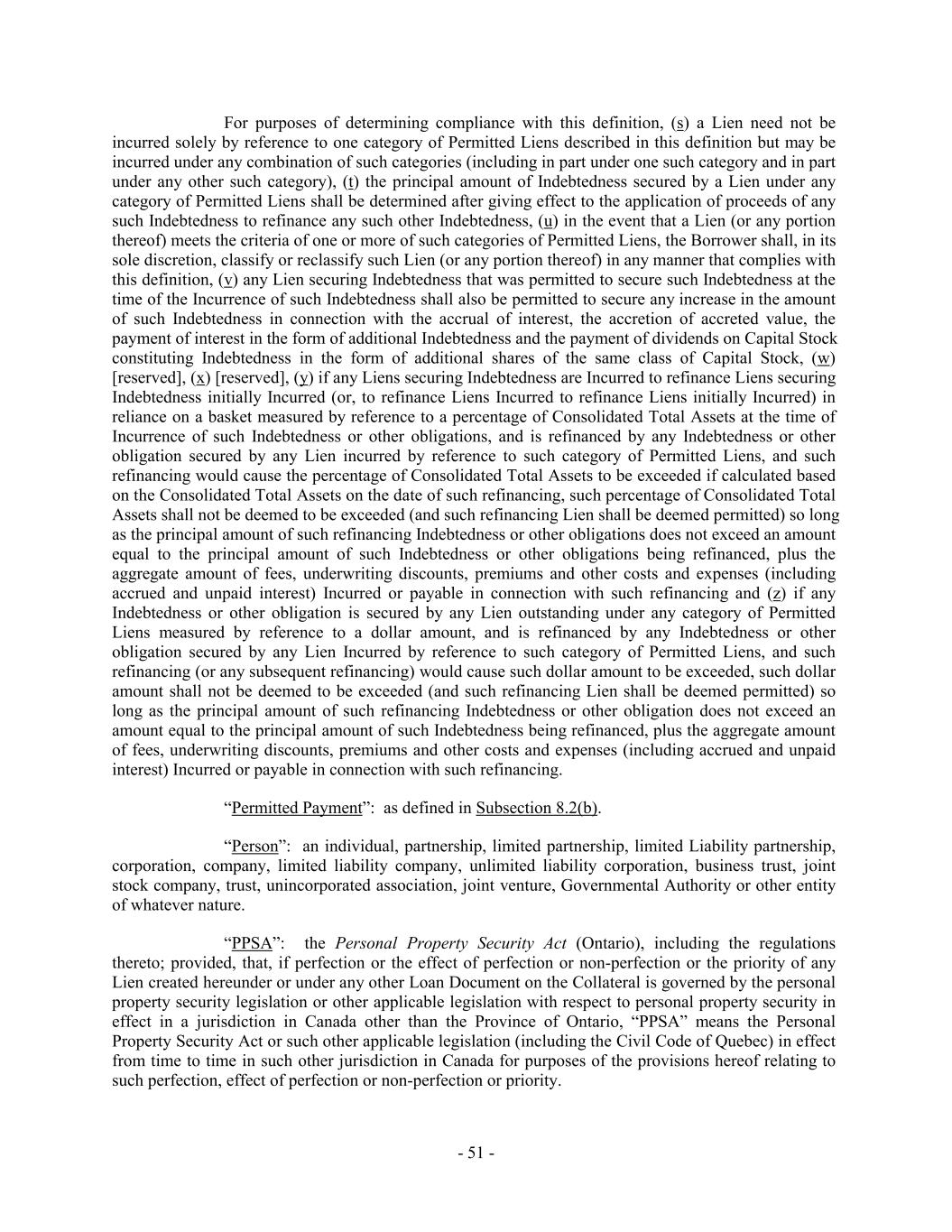 For purposes of determining compliance with this definition, (s) a Lien need not be incurred solely by reference to one category of Permitted Liens described in this definition but may be incurred under any combination of such categories (including in part under one such category and in part under any other such category), (t) the principal amount of Indebtedness secured by a Lien under any category of Permitted Liens shall be determined after giving effect to the application of proceeds of any such Indebtedness to refinance any such other Indebtedness, (u) in the event that a Lien (or any portion thereof) meets the criteria of one or more of such categories of Permitted Liens, the Borrower shall, in its sole discretion, classify or reclassify such Lien (or any portion thereof) in any manner that complies with this definition, (v) any Lien securing Indebtedness that was permitted to secure such Indebtedness at the time of the Incurrence of such Indebtedness shall also be permitted to secure any increase in the amount of such Indebtedness in connection with the accrual of interest, the accretion of accreted value, the payment of interest in the form of additional Indebtedness and the payment of dividends on Capital Stock constituting Indebtedness in the form of additional shares of the same class of Capital Stock, (w) [reserved], (x) [reserved], (y) if any Liens securing Indebtedness are Incurred to refinance Liens securing Indebtedness initially Incurred (or, to refinance Liens Incurred to refinance Liens initially Incurred) in reliance on a basket measured by reference to a percentage of Consolidated Total Assets at the time of Incurrence of such Indebtedness or other obligations, and is refinanced by any Indebtedness or other obligation secured by any Lien incurred by reference to such category of Permitted Liens, and such refinancing would cause the percentage of Consolidated Total Assets to be exceeded if calculated based on the Consolidated Total Assets on the date of such refinancing, such percentage of Consolidated Total Assets shall not be deemed to be exceeded (and such refinancing Lien shall be deemed permitted) so long as the principal amount of such refinancing Indebtedness or other obligations does not exceed an amount equal to the principal amount of such Indebtedness or other obligations being refinanced, plus the aggregate amount of fees, underwriting discounts, premiums and other costs and expenses (including accrued and unpaid interest) Incurred or payable in connection with such refinancing and (z) if any Indebtedness or other obligation is secured by any Lien outstanding under any category of Permitted Liens measured by reference to a dollar amount, and is refinanced by any Indebtedness or other obligation secured by any Lien Incurred by reference to such category of Permitted Liens, and such refinancing (or any subsequent refinancing) would cause such dollar amount to be exceeded, such dollar amount shall not be deemed to be exceeded (and such refinancing Lien shall be deemed permitted) so long as the principal amount of such refinancing Indebtedness or other obligation does not exceed an amount equal to the principal amount of such Indebtedness being refinanced, plus the aggregate amount of fees, underwriting discounts, premiums and other costs and expenses (including accrued and unpaid interest) Incurred or payable in connection with such refinancing. “Permitted Payment”: as defined in Subsection 8.2(b). “Person”: an individual, partnership, limited partnership, limited Liability partnership, corporation, company, limited liability company, unlimited liability corporation, business trust, joint stock company, trust, unincorporated association, joint venture, Governmental Authority or other entity of whatever nature. “PPSA”: the Personal Property Security Act (Ontario), including the regulations thereto; provided, that, if perfection or the effect of perfection or non-perfection or the priority of any Lien created hereunder or under any other Loan Document on the Collateral is governed by the personal property security legislation or other applicable legislation with respect to personal property security in effect in a jurisdiction in Canada other than the Province of Ontario, “PPSA” means the Personal Property Security Act or such other applicable legislation (including the Civil Code of Quebec) in effect from time to time in such other jurisdiction in Canada for purposes of the provisions hereof relating to such perfection, effect of perfection or non-perfection or priority. - 51 -