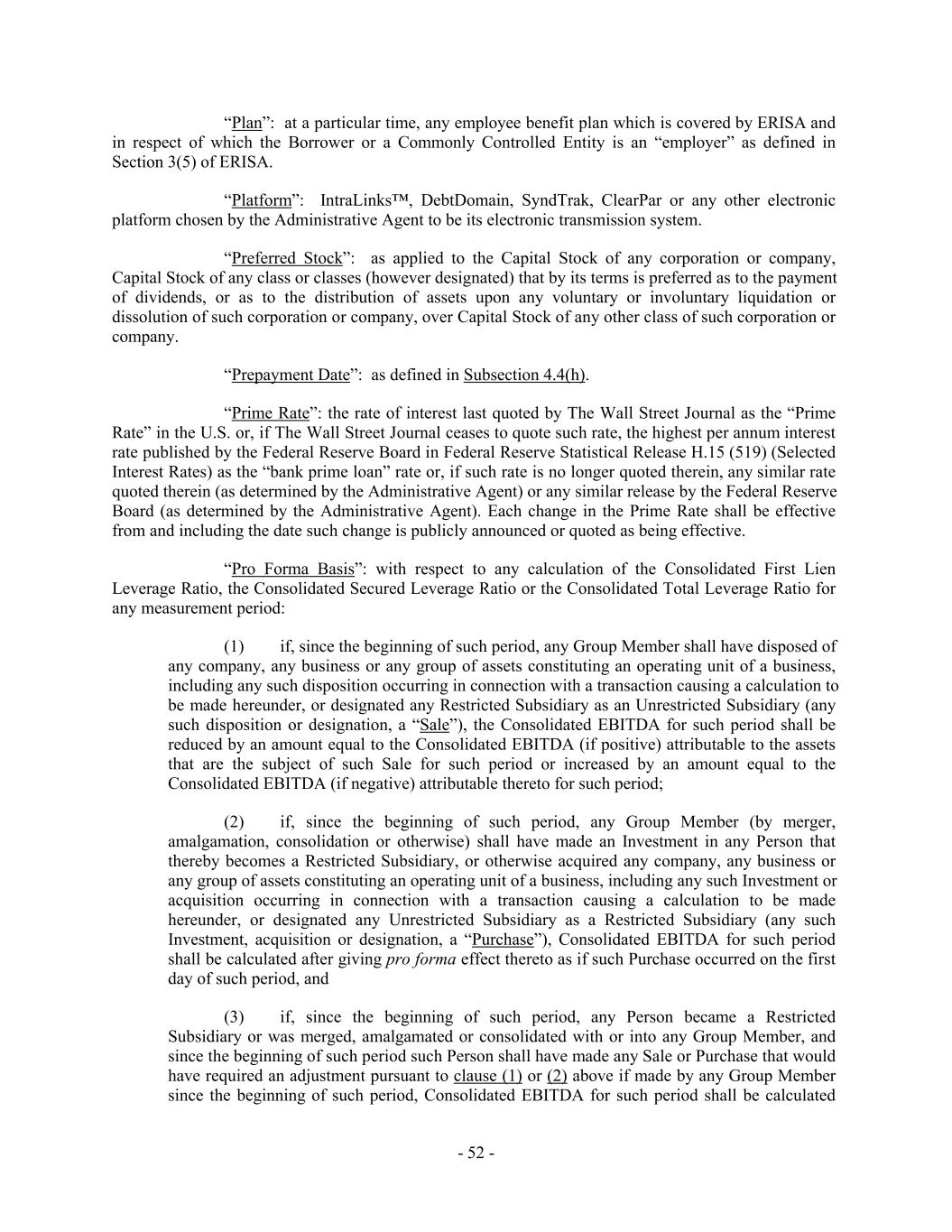 “Plan”: at a particular time, any employee benefit plan which is covered by ERISA and in respect of which the Borrower or a Commonly Controlled Entity is an “employer” as defined in Section 3(5) of ERISA. “Platform”: IntraLinks™, DebtDomain, SyndTrak, ClearPar or any other electronic platform chosen by the Administrative Agent to be its electronic transmission system. “Preferred Stock”: as applied to the Capital Stock of any corporation or company, Capital Stock of any class or classes (however designated) that by its terms is preferred as to the payment of dividends, or as to the distribution of assets upon any voluntary or involuntary liquidation or dissolution of such corporation or company, over Capital Stock of any other class of such corporation or company. “Prepayment Date”: as defined in Subsection 4.4(h). “Prime Rate”: the rate of interest last quoted by The Wall Street Journal as the “Prime Rate” in the U.S. or, if The Wall Street Journal ceases to quote such rate, the highest per annum interest rate published by the Federal Reserve Board in Federal Reserve Statistical Release H.15 (519) (Selected Interest Rates) as the “bank prime loan” rate or, if such rate is no longer quoted therein, any similar rate quoted therein (as determined by the Administrative Agent) or any similar release by the Federal Reserve Board (as determined by the Administrative Agent). Each change in the Prime Rate shall be effective from and including the date such change is publicly announced or quoted as being effective. “Pro Forma Basis”: with respect to any calculation of the Consolidated First Lien Leverage Ratio, the Consolidated Secured Leverage Ratio or the Consolidated Total Leverage Ratio for any measurement period: (1) if, since the beginning of such period, any Group Member shall have disposed of any company, any business or any group of assets constituting an operating unit of a business, including any such disposition occurring in connection with a transaction causing a calculation to be made hereunder, or designated any Restricted Subsidiary as an Unrestricted Subsidiary (any such disposition or designation, a “Sale”), the Consolidated EBITDA for such period shall be reduced by an amount equal to the Consolidated EBITDA (if positive) attributable to the assets that are the subject of such Sale for such period or increased by an amount equal to the Consolidated EBITDA (if negative) attributable thereto for such period; (2) if, since the beginning of such period, any Group Member (by merger, amalgamation, consolidation or otherwise) shall have made an Investment in any Person that thereby becomes a Restricted Subsidiary, or otherwise acquired any company, any business or any group of assets constituting an operating unit of a business, including any such Investment or acquisition occurring in connection with a transaction causing a calculation to be made hereunder, or designated any Unrestricted Subsidiary as a Restricted Subsidiary (any such Investment, acquisition or designation, a “Purchase”), Consolidated EBITDA for such period shall be calculated after giving pro forma effect thereto as if such Purchase occurred on the first day of such period, and (3) if, since the beginning of such period, any Person became a Restricted Subsidiary or was merged, amalgamated or consolidated with or into any Group Member, and since the beginning of such period such Person shall have made any Sale or Purchase that would have required an adjustment pursuant to clause (1) or (2) above if made by any Group Member since the beginning of such period, Consolidated EBITDA for such period shall be calculated - 52 -