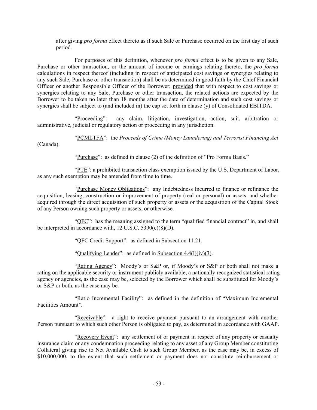 after giving pro forma effect thereto as if such Sale or Purchase occurred on the first day of such period. For purposes of this definition, whenever pro forma effect is to be given to any Sale, Purchase or other transaction, or the amount of income or earnings relating thereto, the pro forma calculations in respect thereof (including in respect of anticipated cost savings or synergies relating to any such Sale, Purchase or other transaction) shall be as determined in good faith by the Chief Financial Officer or another Responsible Officer of the Borrower; provided that with respect to cost savings or synergies relating to any Sale, Purchase or other transaction, the related actions are expected by the Borrower to be taken no later than 18 months after the date of determination and such cost savings or synergies shall be subject to (and included in) the cap set forth in clause (y) of Consolidated EBITDA. “Proceeding”: any claim, litigation, investigation, action, suit, arbitration or administrative, judicial or regulatory action or proceeding in any jurisdiction. “PCMLTFA”: the Proceeds of Crime (Money Laundering) and Terrorist Financing Act (Canada). “Purchase”: as defined in clause (2) of the definition of “Pro Forma Basis.” “PTE”: a prohibited transaction class exemption issued by the U.S. Department of Labor, as any such exemption may be amended from time to time. “Purchase Money Obligations”: any Indebtedness Incurred to finance or refinance the acquisition, leasing, construction or improvement of property (real or personal) or assets, and whether acquired through the direct acquisition of such property or assets or the acquisition of the Capital Stock of any Person owning such property or assets, or otherwise. “QFC”: has the meaning assigned to the term “qualified financial contract” in, and shall be interpreted in accordance with, 12 U.S.C. 5390(c)(8)(D). “QFC Credit Support”: as defined in Subsection 11.21. “Qualifying Lender”: as defined in Subsection 4.4(l)(iv)(3). “Rating Agency”: Moody’s or S&P or, if Moody’s or S&P or both shall not make a rating on the applicable security or instrument publicly available, a nationally recognized statistical rating agency or agencies, as the case may be, selected by the Borrower which shall be substituted for Moody’s or S&P or both, as the case may be. “Ratio Incremental Facility”: as defined in the definition of “Maximum Incremental Facilities Amount”. “Receivable”: a right to receive payment pursuant to an arrangement with another Person pursuant to which such other Person is obligated to pay, as determined in accordance with GAAP. “Recovery Event”: any settlement of or payment in respect of any property or casualty insurance claim or any condemnation proceeding relating to any asset of any Group Member constituting Collateral giving rise to Net Available Cash to such Group Member, as the case may be, in excess of $10,000,000, to the extent that such settlement or payment does not constitute reimbursement or - 53 -