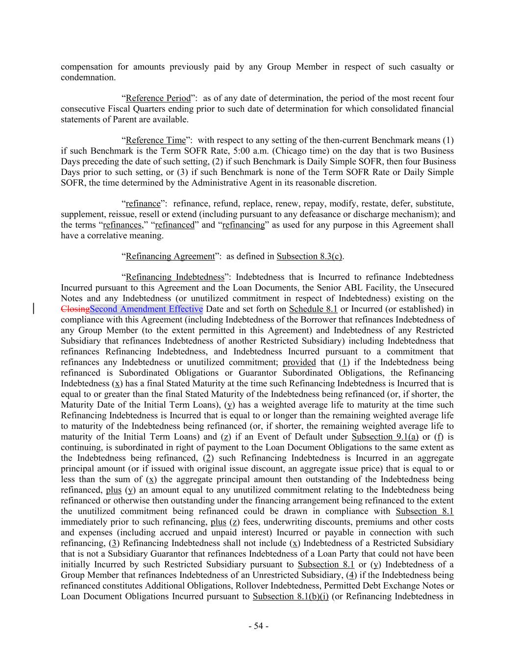 compensation for amounts previously paid by any Group Member in respect of such casualty or condemnation. “Reference Period”: as of any date of determination, the period of the most recent four consecutive Fiscal Quarters ending prior to such date of determination for which consolidated financial statements of Parent are available. “Reference Time”: with respect to any setting of the then-current Benchmark means (1) if such Benchmark is the Term SOFR Rate, 5:00 a.m. (Chicago time) on the day that is two Business Days preceding the date of such setting, (2) if such Benchmark is Daily Simple SOFR, then four Business Days prior to such setting, or (3) if such Benchmark is none of the Term SOFR Rate or Daily Simple SOFR, the time determined by the Administrative Agent in its reasonable discretion. “refinance”: refinance, refund, replace, renew, repay, modify, restate, defer, substitute, supplement, reissue, resell or extend (including pursuant to any defeasance or discharge mechanism); and the terms “refinances,” “refinanced” and “refinancing” as used for any purpose in this Agreement shall have a correlative meaning. “Refinancing Agreement”: as defined in Subsection 8.3(c). “Refinancing Indebtedness”: Indebtedness that is Incurred to refinance Indebtedness Incurred pursuant to this Agreement and the Loan Documents, the Senior ABL Facility, the Unsecured Notes and any Indebtedness (or unutilized commitment in respect of Indebtedness) existing on the ClosingSecond Amendment Effective Date and set forth on Schedule 8.1 or Incurred (or established) in compliance with this Agreement (including Indebtedness of the Borrower that refinances Indebtedness of any Group Member (to the extent permitted in this Agreement) and Indebtedness of any Restricted Subsidiary that refinances Indebtedness of another Restricted Subsidiary) including Indebtedness that refinances Refinancing Indebtedness, and Indebtedness Incurred pursuant to a commitment that refinances any Indebtedness or unutilized commitment; provided that (1) if the Indebtedness being refinanced is Subordinated Obligations or Guarantor Subordinated Obligations, the Refinancing Indebtedness (x) has a final Stated Maturity at the time such Refinancing Indebtedness is Incurred that is equal to or greater than the final Stated Maturity of the Indebtedness being refinanced (or, if shorter, the Maturity Date of the Initial Term Loans), (y) has a weighted average life to maturity at the time such Refinancing Indebtedness is Incurred that is equal to or longer than the remaining weighted average life to maturity of the Indebtedness being refinanced (or, if shorter, the remaining weighted average life to maturity of the Initial Term Loans) and (z) if an Event of Default under Subsection 9.1(a) or (f) is continuing, is subordinated in right of payment to the Loan Document Obligations to the same extent as the Indebtedness being refinanced, (2) such Refinancing Indebtedness is Incurred in an aggregate principal amount (or if issued with original issue discount, an aggregate issue price) that is equal to or less than the sum of (x) the aggregate principal amount then outstanding of the Indebtedness being refinanced, plus (y) an amount equal to any unutilized commitment relating to the Indebtedness being refinanced or otherwise then outstanding under the financing arrangement being refinanced to the extent the unutilized commitment being refinanced could be drawn in compliance with Subsection 8.1 immediately prior to such refinancing, plus (z) fees, underwriting discounts, premiums and other costs and expenses (including accrued and unpaid interest) Incurred or payable in connection with such refinancing, (3) Refinancing Indebtedness shall not include (x) Indebtedness of a Restricted Subsidiary that is not a Subsidiary Guarantor that refinances Indebtedness of a Loan Party that could not have been initially Incurred by such Restricted Subsidiary pursuant to Subsection 8.1 or (y) Indebtedness of a Group Member that refinances Indebtedness of an Unrestricted Subsidiary, (4) if the Indebtedness being refinanced constitutes Additional Obligations, Rollover Indebtedness, Permitted Debt Exchange Notes or Loan Document Obligations Incurred pursuant to Subsection 8.1(b)(i) (or Refinancing Indebtedness in - 54 -