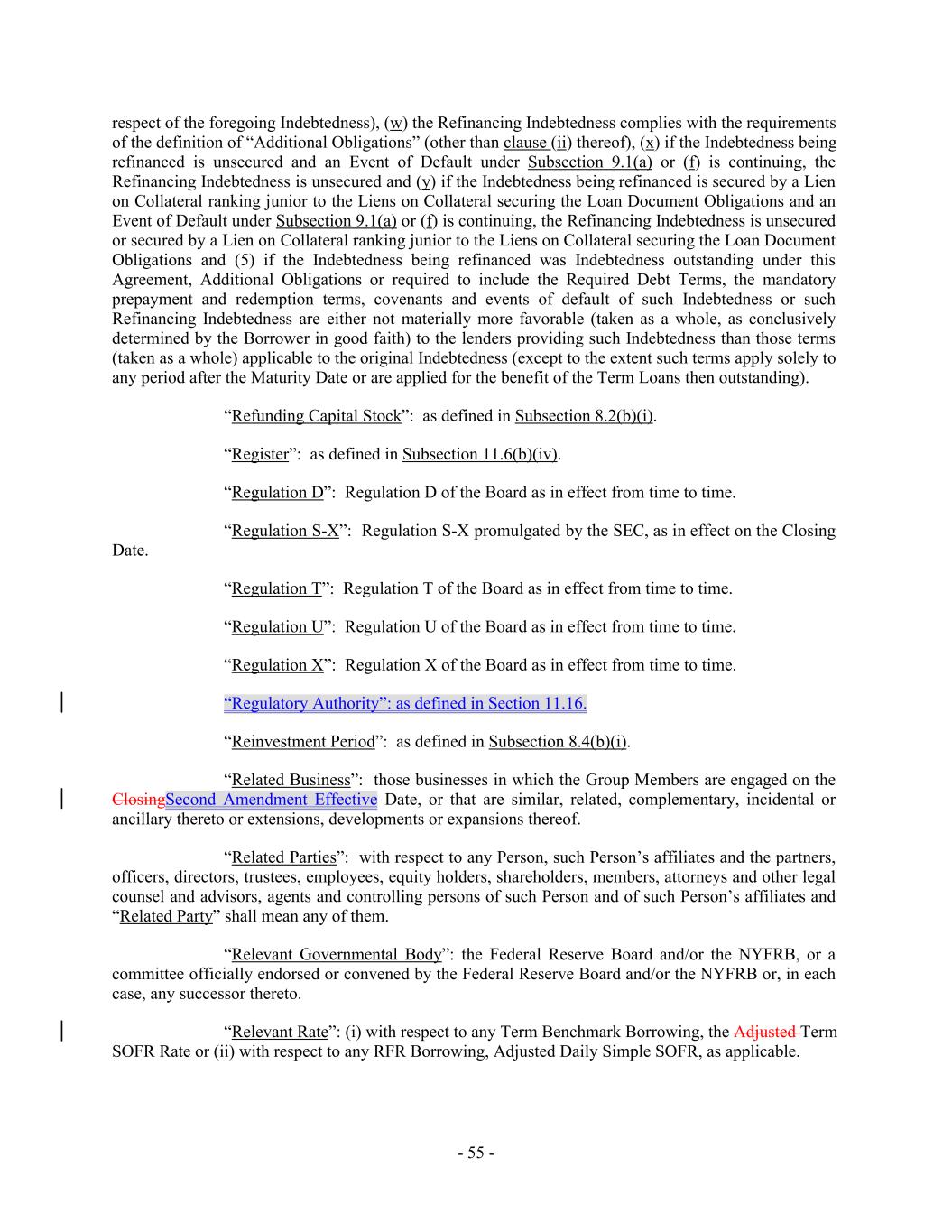 respect of the foregoing Indebtedness), (w) the Refinancing Indebtedness complies with the requirements of the definition of “Additional Obligations” (other than clause (ii) thereof), (x) if the Indebtedness being refinanced is unsecured and an Event of Default under Subsection 9.1(a) or (f) is continuing, the Refinancing Indebtedness is unsecured and (y) if the Indebtedness being refinanced is secured by a Lien on Collateral ranking junior to the Liens on Collateral securing the Loan Document Obligations and an Event of Default under Subsection 9.1(a) or (f) is continuing, the Refinancing Indebtedness is unsecured or secured by a Lien on Collateral ranking junior to the Liens on Collateral securing the Loan Document Obligations and (5) if the Indebtedness being refinanced was Indebtedness outstanding under this Agreement, Additional Obligations or required to include the Required Debt Terms, the mandatory prepayment and redemption terms, covenants and events of default of such Indebtedness or such Refinancing Indebtedness are either not materially more favorable (taken as a whole, as conclusively determined by the Borrower in good faith) to the lenders providing such Indebtedness than those terms (taken as a whole) applicable to the original Indebtedness (except to the extent such terms apply solely to any period after the Maturity Date or are applied for the benefit of the Term Loans then outstanding). “Refunding Capital Stock”: as defined in Subsection 8.2(b)(i). “Register”: as defined in Subsection 11.6(b)(iv). “Regulation D”: Regulation D of the Board as in effect from time to time. “Regulation S-X”: Regulation S-X promulgated by the SEC, as in effect on the Closing Date. “Regulation T”: Regulation T of the Board as in effect from time to time. “Regulation U”: Regulation U of the Board as in effect from time to time. “Regulation X”: Regulation X of the Board as in effect from time to time. “Regulatory Authority”: as defined in Section 11.16. “Reinvestment Period”: as defined in Subsection 8.4(b)(i). “Related Business”: those businesses in which the Group Members are engaged on the ClosingSecond Amendment Effective Date, or that are similar, related, complementary, incidental or ancillary thereto or extensions, developments or expansions thereof. “Related Parties”: with respect to any Person, such Person’s affiliates and the partners, officers, directors, trustees, employees, equity holders, shareholders, members, attorneys and other legal counsel and advisors, agents and controlling persons of such Person and of such Person’s affiliates and “Related Party” shall mean any of them. “Relevant Governmental Body”: the Federal Reserve Board and/or the NYFRB, or a committee officially endorsed or convened by the Federal Reserve Board and/or the NYFRB or, in each case, any successor thereto. “Relevant Rate”: (i) with respect to any Term Benchmark Borrowing, the Adjusted Term SOFR Rate or (ii) with respect to any RFR Borrowing, Adjusted Daily Simple SOFR, as applicable. - 55 -