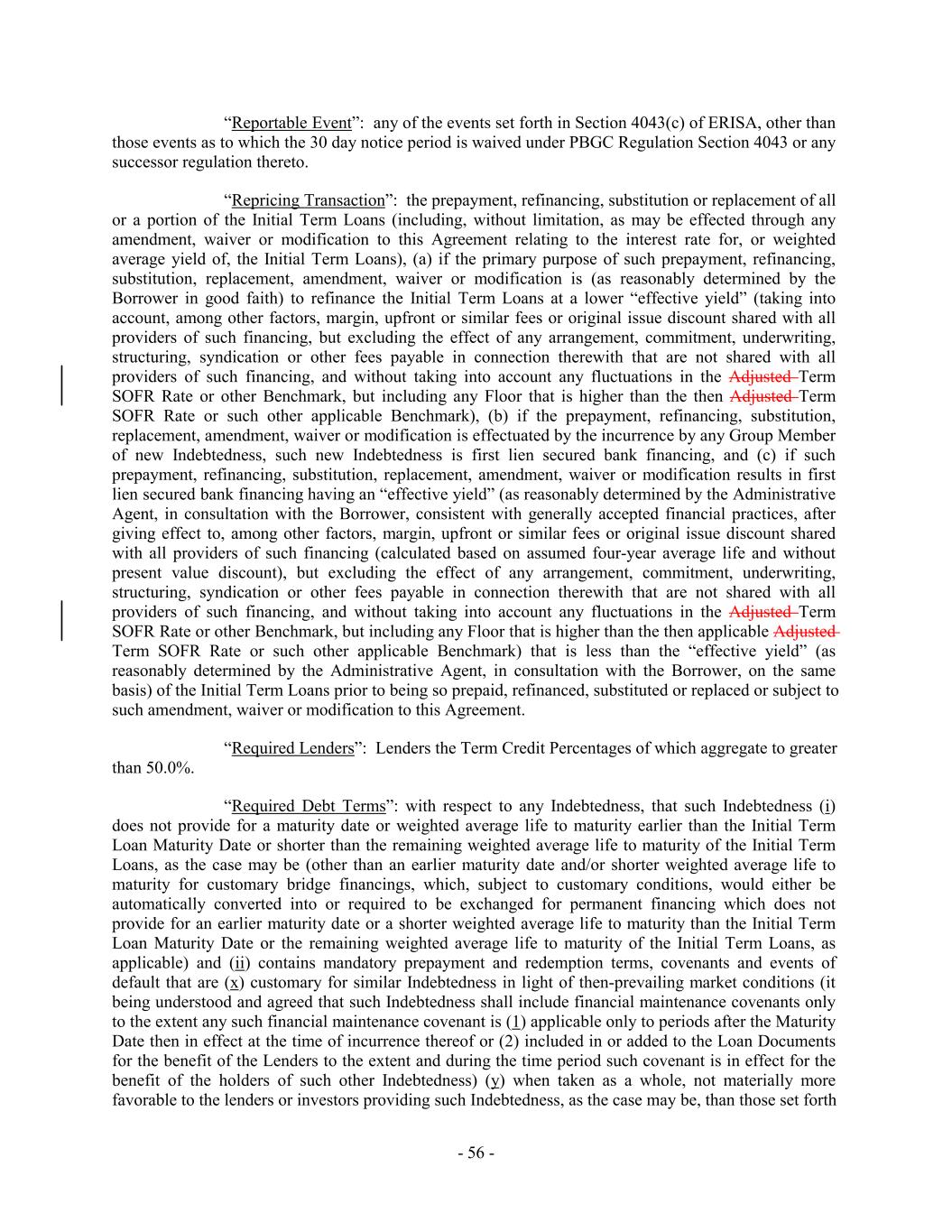 “Reportable Event”: any of the events set forth in Section 4043(c) of ERISA, other than those events as to which the 30 day notice period is waived under PBGC Regulation Section 4043 or any successor regulation thereto. “Repricing Transaction”: the prepayment, refinancing, substitution or replacement of all or a portion of the Initial Term Loans (including, without limitation, as may be effected through any amendment, waiver or modification to this Agreement relating to the interest rate for, or weighted average yield of, the Initial Term Loans), (a) if the primary purpose of such prepayment, refinancing, substitution, replacement, amendment, waiver or modification is (as reasonably determined by the Borrower in good faith) to refinance the Initial Term Loans at a lower “effective yield” (taking into account, among other factors, margin, upfront or similar fees or original issue discount shared with all providers of such financing, but excluding the effect of any arrangement, commitment, underwriting, structuring, syndication or other fees payable in connection therewith that are not shared with all providers of such financing, and without taking into account any fluctuations in the Adjusted Term SOFR Rate or other Benchmark, but including any Floor that is higher than the then Adjusted Term SOFR Rate or such other applicable Benchmark), (b) if the prepayment, refinancing, substitution, replacement, amendment, waiver or modification is effectuated by the incurrence by any Group Member of new Indebtedness, such new Indebtedness is first lien secured bank financing, and (c) if such prepayment, refinancing, substitution, replacement, amendment, waiver or modification results in first lien secured bank financing having an “effective yield” (as reasonably determined by the Administrative Agent, in consultation with the Borrower, consistent with generally accepted financial practices, after giving effect to, among other factors, margin, upfront or similar fees or original issue discount shared with all providers of such financing (calculated based on assumed four-year average life and without present value discount), but excluding the effect of any arrangement, commitment, underwriting, structuring, syndication or other fees payable in connection therewith that are not shared with all providers of such financing, and without taking into account any fluctuations in the Adjusted Term SOFR Rate or other Benchmark, but including any Floor that is higher than the then applicable Adjusted Term SOFR Rate or such other applicable Benchmark) that is less than the “effective yield” (as reasonably determined by the Administrative Agent, in consultation with the Borrower, on the same basis) of the Initial Term Loans prior to being so prepaid, refinanced, substituted or replaced or subject to such amendment, waiver or modification to this Agreement. “Required Lenders”: Lenders the Term Credit Percentages of which aggregate to greater than 50.0%. “Required Debt Terms”: with respect to any Indebtedness, that such Indebtedness (i) does not provide for a maturity date or weighted average life to maturity earlier than the Initial Term Loan Maturity Date or shorter than the remaining weighted average life to maturity of the Initial Term Loans, as the case may be (other than an earlier maturity date and/or shorter weighted average life to maturity for customary bridge financings, which, subject to customary conditions, would either be automatically converted into or required to be exchanged for permanent financing which does not provide for an earlier maturity date or a shorter weighted average life to maturity than the Initial Term Loan Maturity Date or the remaining weighted average life to maturity of the Initial Term Loans, as applicable) and (ii) contains mandatory prepayment and redemption terms, covenants and events of default that are (x) customary for similar Indebtedness in light of then-prevailing market conditions (it being understood and agreed that such Indebtedness shall include financial maintenance covenants only to the extent any such financial maintenance covenant is (1) applicable only to periods after the Maturity Date then in effect at the time of incurrence thereof or (2) included in or added to the Loan Documents for the benefit of the Lenders to the extent and during the time period such covenant is in effect for the benefit of the holders of such other Indebtedness) (y) when taken as a whole, not materially more favorable to the lenders or investors providing such Indebtedness, as the case may be, than those set forth - 56 -