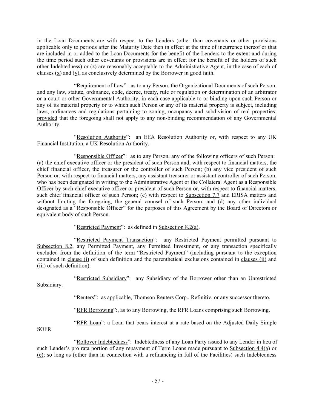 in the Loan Documents are with respect to the Lenders (other than covenants or other provisions applicable only to periods after the Maturity Date then in effect at the time of incurrence thereof or that are included in or added to the Loan Documents for the benefit of the Lenders to the extent and during the time period such other covenants or provisions are in effect for the benefit of the holders of such other Indebtedness) or (z) are reasonably acceptable to the Administrative Agent, in the case of each of clauses (x) and (y), as conclusively determined by the Borrower in good faith. “Requirement of Law”: as to any Person, the Organizational Documents of such Person, and any law, statute, ordinance, code, decree, treaty, rule or regulation or determination of an arbitrator or a court or other Governmental Authority, in each case applicable to or binding upon such Person or any of its material property or to which such Person or any of its material property is subject, including laws, ordinances and regulations pertaining to zoning, occupancy and subdivision of real properties; provided that the foregoing shall not apply to any non-binding recommendation of any Governmental Authority. “Resolution Authority”: an EEA Resolution Authority or, with respect to any UK Financial Institution, a UK Resolution Authority. “Responsible Officer”: as to any Person, any of the following officers of such Person: (a) the chief executive officer or the president of such Person and, with respect to financial matters, the chief financial officer, the treasurer or the controller of such Person; (b) any vice president of such Person or, with respect to financial matters, any assistant treasurer or assistant controller of such Person, who has been designated in writing to the Administrative Agent or the Collateral Agent as a Responsible Officer by such chief executive officer or president of such Person or, with respect to financial matters, such chief financial officer of such Person; (c) with respect to Subsection 7.7 and ERISA matters and without limiting the foregoing, the general counsel of such Person; and (d) any other individual designated as a “Responsible Officer” for the purposes of this Agreement by the Board of Directors or equivalent body of such Person. “Restricted Payment”: as defined in Subsection 8.2(a). “Restricted Payment Transaction”: any Restricted Payment permitted pursuant to Subsection 8.2, any Permitted Payment, any Permitted Investment, or any transaction specifically excluded from the definition of the term “Restricted Payment” (including pursuant to the exception contained in clause (i) of such definition and the parenthetical exclusions contained in clauses (ii) and (iii) of such definition). “Restricted Subsidiary”: any Subsidiary of the Borrower other than an Unrestricted Subsidiary. “Reuters”: as applicable, Thomson Reuters Corp., Refinitiv, or any successor thereto. “RFR Borrowing”:, as to any Borrowing, the RFR Loans comprising such Borrowing. “RFR Loan”: a Loan that bears interest at a rate based on the Adjusted Daily Simple SOFR. “Rollover Indebtedness”: Indebtedness of any Loan Party issued to any Lender in lieu of such Lender’s pro rata portion of any repayment of Term Loans made pursuant to Subsection 4.4(a) or (e); so long as (other than in connection with a refinancing in full of the Facilities) such Indebtedness - 57 -