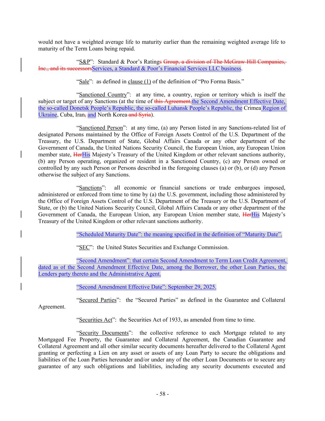 would not have a weighted average life to maturity earlier than the remaining weighted average life to maturity of the Term Loans being repaid. “S&P”: Standard & Poor’s Ratings Group, a division of The McGraw-Hill Companies, Inc., and its successorsServices, a Standard & Poor’s Financial Services LLC business. “Sale”: as defined in clause (1) of the definition of “Pro Forma Basis.” “Sanctioned Country”: at any time, a country, region or territory which is itself the subject or target of any Sanctions (at the time of this Agreement,the Second Amendment Effective Date, the so-called Donetsk People’s Republic, the so-called Luhansk People’s Republic, the Crimea Region of Ukraine, Cuba, Iran, and North Korea and Syria). “Sanctioned Person”: at any time, (a) any Person listed in any Sanctions-related list of designated Persons maintained by the Office of Foreign Assets Control of the U.S. Department of the Treasury, the U.S. Department of State, Global Affairs Canada or any other department of the Government of Canada, the United Nations Security Council, the European Union, any European Union member state, HerHis Majesty’s Treasury of the United Kingdom or other relevant sanctions authority, (b) any Person operating, organized or resident in a Sanctioned Country, (c) any Person owned or controlled by any such Person or Persons described in the foregoing clauses (a) or (b), or (d) any Person otherwise the subject of any Sanctions. “Sanctions”: all economic or financial sanctions or trade embargoes imposed, administered or enforced from time to time by (a) the U.S. government, including those administered by the Office of Foreign Assets Control of the U.S. Department of the Treasury or the U.S. Department of State, or (b) the United Nations Security Council, Global Affairs Canada or any other department of the Government of Canada, the European Union, any European Union member state, HerHis Majesty’s Treasury of the United Kingdom or other relevant sanctions authority. “Scheduled Maturity Date”: the meaning specified in the definition of “Maturity Date”. “SEC”: the United States Securities and Exchange Commission. “Second Amendment”: that certain Second Amendment to Term Loan Credit Agreement, dated as of the Second Amendment Effective Date, among the Borrower, the other Loan Parties, the Lenders party thereto and the Administrative Agent. “Second Amendment Effective Date”: September 29, 2025. “Secured Parties”: the “Secured Parties” as defined in the Guarantee and Collateral Agreement. “Securities Act”: the Securities Act of 1933, as amended from time to time. “Security Documents”: the collective reference to each Mortgage related to any Mortgaged Fee Property, the Guarantee and Collateral Agreement, the Canadian Guarantee and Collateral Agreement and all other similar security documents hereafter delivered to the Collateral Agent granting or perfecting a Lien on any asset or assets of any Loan Party to secure the obligations and liabilities of the Loan Parties hereunder and/or under any of the other Loan Documents or to secure any guarantee of any such obligations and liabilities, including any security documents executed and - 58 -