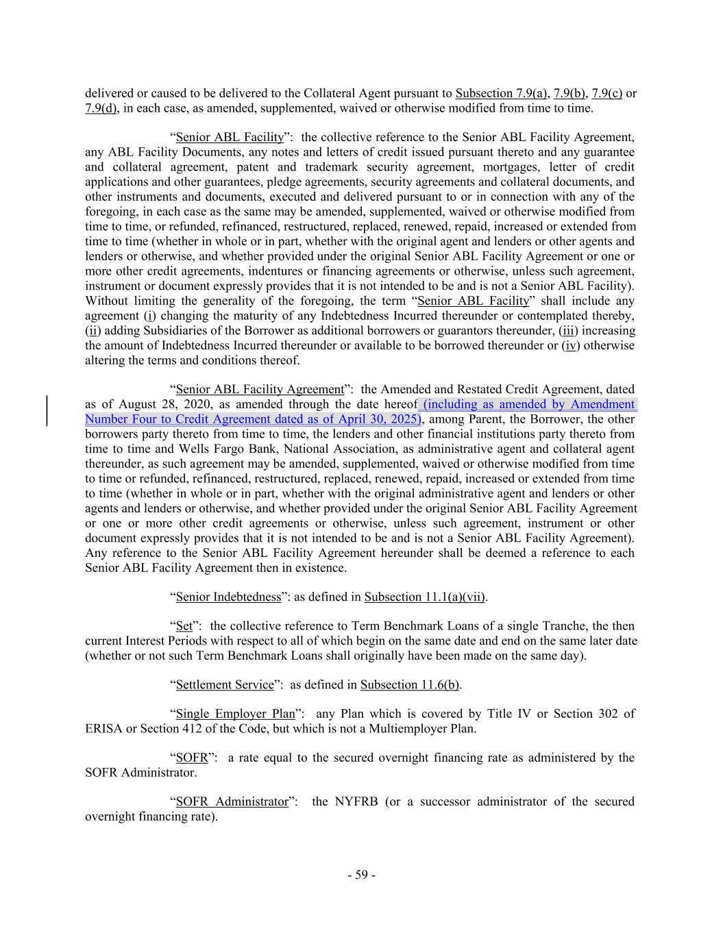 delivered or caused to be delivered to the Collateral Agent pursuant to Subsection 7.9(a), 7.9(b), 7.9(c) or 7.9(d), in each case, as amended, supplemented, waived or otherwise modified from time to time. “Senior ABL Facility”: the collective reference to the Senior ABL Facility Agreement, any ABL Facility Documents, any notes and letters of credit issued pursuant thereto and any guarantee and collateral agreement, patent and trademark security agreement, mortgages, letter of credit applications and other guarantees, pledge agreements, security agreements and collateral documents, and other instruments and documents, executed and delivered pursuant to or in connection with any of the foregoing, in each case as the same may be amended, supplemented, waived or otherwise modified from time to time, or refunded, refinanced, restructured, replaced, renewed, repaid, increased or extended from time to time (whether in whole or in part, whether with the original agent and lenders or other agents and lenders or otherwise, and whether provided under the original Senior ABL Facility Agreement or one or more other credit agreements, indentures or financing agreements or otherwise, unless such agreement, instrument or document expressly provides that it is not intended to be and is not a Senior ABL Facility). Without limiting the generality of the foregoing, the term “Senior ABL Facility” shall include any agreement (i) changing the maturity of any Indebtedness Incurred thereunder or contemplated thereby, (ii) adding Subsidiaries of the Borrower as additional borrowers or guarantors thereunder, (iii) increasing the amount of Indebtedness Incurred thereunder or available to be borrowed thereunder or (iv) otherwise altering the terms and conditions thereof. “Senior ABL Facility Agreement”: the Amended and Restated Credit Agreement, dated as of August 28, 2020, as amended through the date hereof (including as amended by Amendment Number Four to Credit Agreement dated as of April 30, 2025), among Parent, the Borrower, the other borrowers party thereto from time to time, the lenders and other financial institutions party thereto from time to time and Wells Fargo Bank, National Association, as administrative agent and collateral agent thereunder, as such agreement may be amended, supplemented, waived or otherwise modified from time to time or refunded, refinanced, restructured, replaced, renewed, repaid, increased or extended from time to time (whether in whole or in part, whether with the original administrative agent and lenders or other agents and lenders or otherwise, and whether provided under the original Senior ABL Facility Agreement or one or more other credit agreements or otherwise, unless such agreement, instrument or other document expressly provides that it is not intended to be and is not a Senior ABL Facility Agreement). Any reference to the Senior ABL Facility Agreement hereunder shall be deemed a reference to each Senior ABL Facility Agreement then in existence. “Senior Indebtedness”: as defined in Subsection 11.1(a)(vii). “Set”: the collective reference to Term Benchmark Loans of a single Tranche, the then current Interest Periods with respect to all of which begin on the same date and end on the same later date (whether or not such Term Benchmark Loans shall originally have been made on the same day). “Settlement Service”: as defined in Subsection 11.6(b). “Single Employer Plan”: any Plan which is covered by Title IV or Section 302 of ERISA or Section 412 of the Code, but which is not a Multiemployer Plan. “SOFR”: a rate equal to the secured overnight financing rate as administered by the SOFR Administrator. “SOFR Administrator”: the NYFRB (or a successor administrator of the secured overnight financing rate). - 59 -
