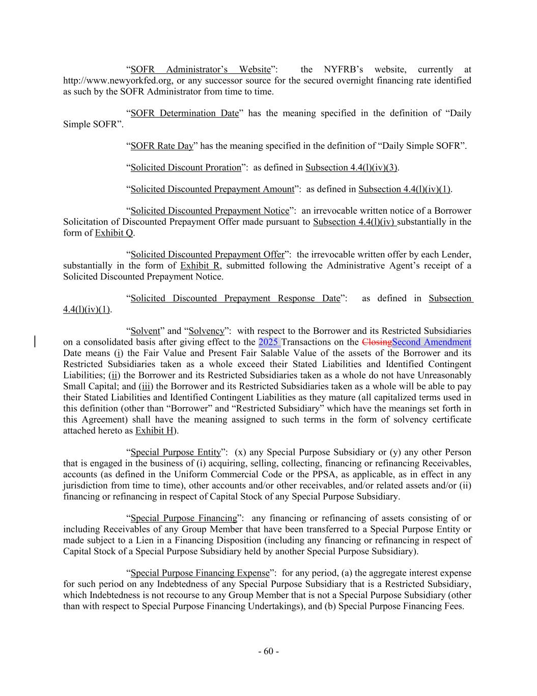 “SOFR Administrator’s Website”: the NYFRB’s website, currently at http://www.newyorkfed.org, or any successor source for the secured overnight financing rate identified as such by the SOFR Administrator from time to time. “SOFR Determination Date” has the meaning specified in the definition of “Daily Simple SOFR”. “SOFR Rate Day” has the meaning specified in the definition of “Daily Simple SOFR”. “Solicited Discount Proration”: as defined in Subsection 4.4(l)(iv)(3). “Solicited Discounted Prepayment Amount”: as defined in Subsection 4.4(l)(iv)(1). “Solicited Discounted Prepayment Notice”: an irrevocable written notice of a Borrower Solicitation of Discounted Prepayment Offer made pursuant to Subsection 4.4(l)(iv) substantially in the form of Exhibit Q. “Solicited Discounted Prepayment Offer”: the irrevocable written offer by each Lender, substantially in the form of Exhibit R, submitted following the Administrative Agent’s receipt of a Solicited Discounted Prepayment Notice. “Solicited Discounted Prepayment Response Date”: as defined in Subsection 4.4(l)(iv)(1). “Solvent” and “Solvency”: with respect to the Borrower and its Restricted Subsidiaries on a consolidated basis after giving effect to the 2025 Transactions on the ClosingSecond Amendment Date means (i) the Fair Value and Present Fair Salable Value of the assets of the Borrower and its Restricted Subsidiaries taken as a whole exceed their Stated Liabilities and Identified Contingent Liabilities; (ii) the Borrower and its Restricted Subsidiaries taken as a whole do not have Unreasonably Small Capital; and (iii) the Borrower and its Restricted Subsidiaries taken as a whole will be able to pay their Stated Liabilities and Identified Contingent Liabilities as they mature (all capitalized terms used in this definition (other than “Borrower” and “Restricted Subsidiary” which have the meanings set forth in this Agreement) shall have the meaning assigned to such terms in the form of solvency certificate attached hereto as Exhibit H). “Special Purpose Entity”: (x) any Special Purpose Subsidiary or (y) any other Person that is engaged in the business of (i) acquiring, selling, collecting, financing or refinancing Receivables, accounts (as defined in the Uniform Commercial Code or the PPSA, as applicable, as in effect in any jurisdiction from time to time), other accounts and/or other receivables, and/or related assets and/or (ii) financing or refinancing in respect of Capital Stock of any Special Purpose Subsidiary. “Special Purpose Financing”: any financing or refinancing of assets consisting of or including Receivables of any Group Member that have been transferred to a Special Purpose Entity or made subject to a Lien in a Financing Disposition (including any financing or refinancing in respect of Capital Stock of a Special Purpose Subsidiary held by another Special Purpose Subsidiary). “Special Purpose Financing Expense”: for any period, (a) the aggregate interest expense for such period on any Indebtedness of any Special Purpose Subsidiary that is a Restricted Subsidiary, which Indebtedness is not recourse to any Group Member that is not a Special Purpose Subsidiary (other than with respect to Special Purpose Financing Undertakings), and (b) Special Purpose Financing Fees. - 60 -