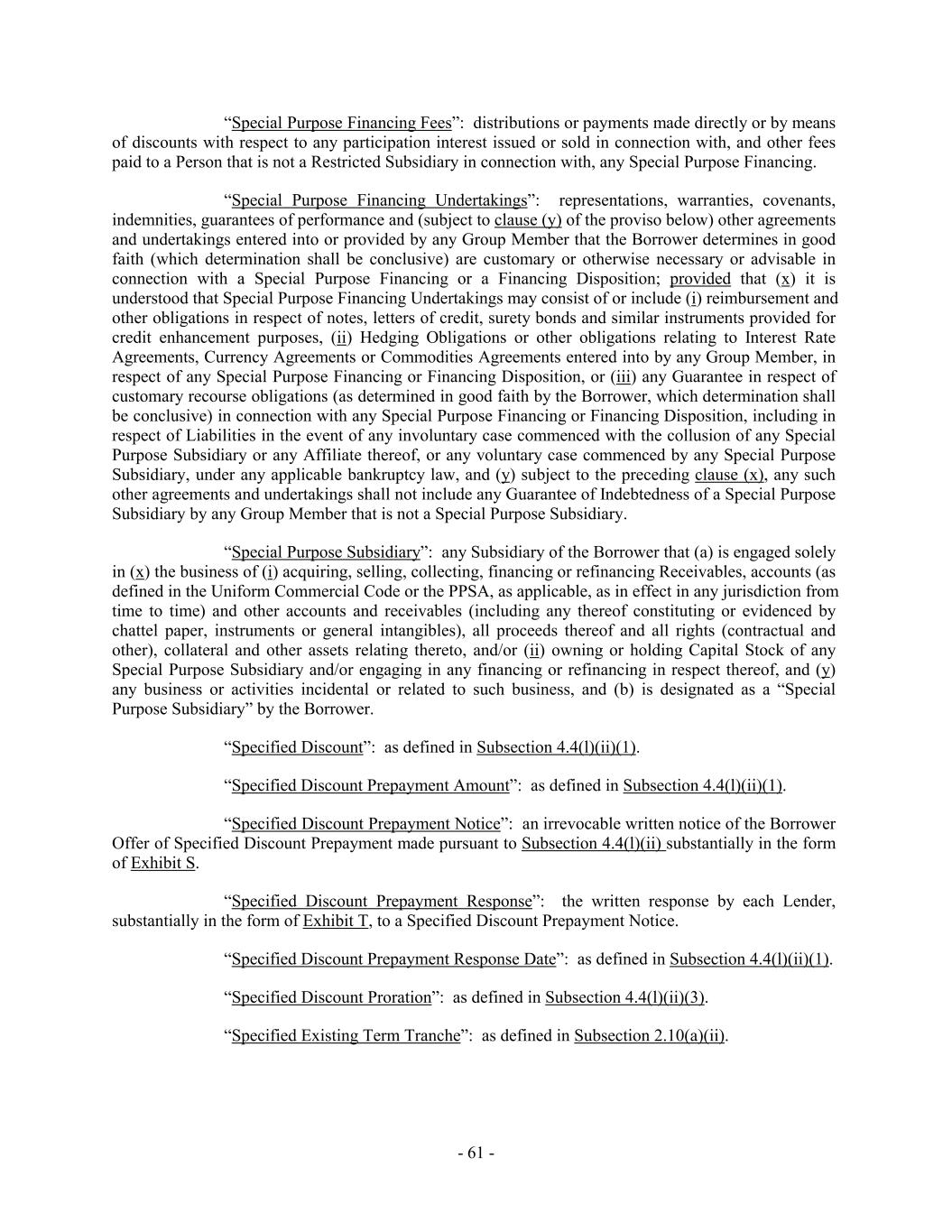 “Special Purpose Financing Fees”: distributions or payments made directly or by means of discounts with respect to any participation interest issued or sold in connection with, and other fees paid to a Person that is not a Restricted Subsidiary in connection with, any Special Purpose Financing. “Special Purpose Financing Undertakings”: representations, warranties, covenants, indemnities, guarantees of performance and (subject to clause (y) of the proviso below) other agreements and undertakings entered into or provided by any Group Member that the Borrower determines in good faith (which determination shall be conclusive) are customary or otherwise necessary or advisable in connection with a Special Purpose Financing or a Financing Disposition; provided that (x) it is understood that Special Purpose Financing Undertakings may consist of or include (i) reimbursement and other obligations in respect of notes, letters of credit, surety bonds and similar instruments provided for credit enhancement purposes, (ii) Hedging Obligations or other obligations relating to Interest Rate Agreements, Currency Agreements or Commodities Agreements entered into by any Group Member, in respect of any Special Purpose Financing or Financing Disposition, or (iii) any Guarantee in respect of customary recourse obligations (as determined in good faith by the Borrower, which determination shall be conclusive) in connection with any Special Purpose Financing or Financing Disposition, including in respect of Liabilities in the event of any involuntary case commenced with the collusion of any Special Purpose Subsidiary or any Affiliate thereof, or any voluntary case commenced by any Special Purpose Subsidiary, under any applicable bankruptcy law, and (y) subject to the preceding clause (x), any such other agreements and undertakings shall not include any Guarantee of Indebtedness of a Special Purpose Subsidiary by any Group Member that is not a Special Purpose Subsidiary. “Special Purpose Subsidiary”: any Subsidiary of the Borrower that (a) is engaged solely in (x) the business of (i) acquiring, selling, collecting, financing or refinancing Receivables, accounts (as defined in the Uniform Commercial Code or the PPSA, as applicable, as in effect in any jurisdiction from time to time) and other accounts and receivables (including any thereof constituting or evidenced by chattel paper, instruments or general intangibles), all proceeds thereof and all rights (contractual and other), collateral and other assets relating thereto, and/or (ii) owning or holding Capital Stock of any Special Purpose Subsidiary and/or engaging in any financing or refinancing in respect thereof, and (y) any business or activities incidental or related to such business, and (b) is designated as a “Special Purpose Subsidiary” by the Borrower. “Specified Discount”: as defined in Subsection 4.4(l)(ii)(1). “Specified Discount Prepayment Amount”: as defined in Subsection 4.4(l)(ii)(1). “Specified Discount Prepayment Notice”: an irrevocable written notice of the Borrower Offer of Specified Discount Prepayment made pursuant to Subsection 4.4(l)(ii) substantially in the form of Exhibit S. “Specified Discount Prepayment Response”: the written response by each Lender, substantially in the form of Exhibit T, to a Specified Discount Prepayment Notice. “Specified Discount Prepayment Response Date”: as defined in Subsection 4.4(l)(ii)(1). “Specified Discount Proration”: as defined in Subsection 4.4(l)(ii)(3). “Specified Existing Term Tranche”: as defined in Subsection 2.10(a)(ii). - 61 -
