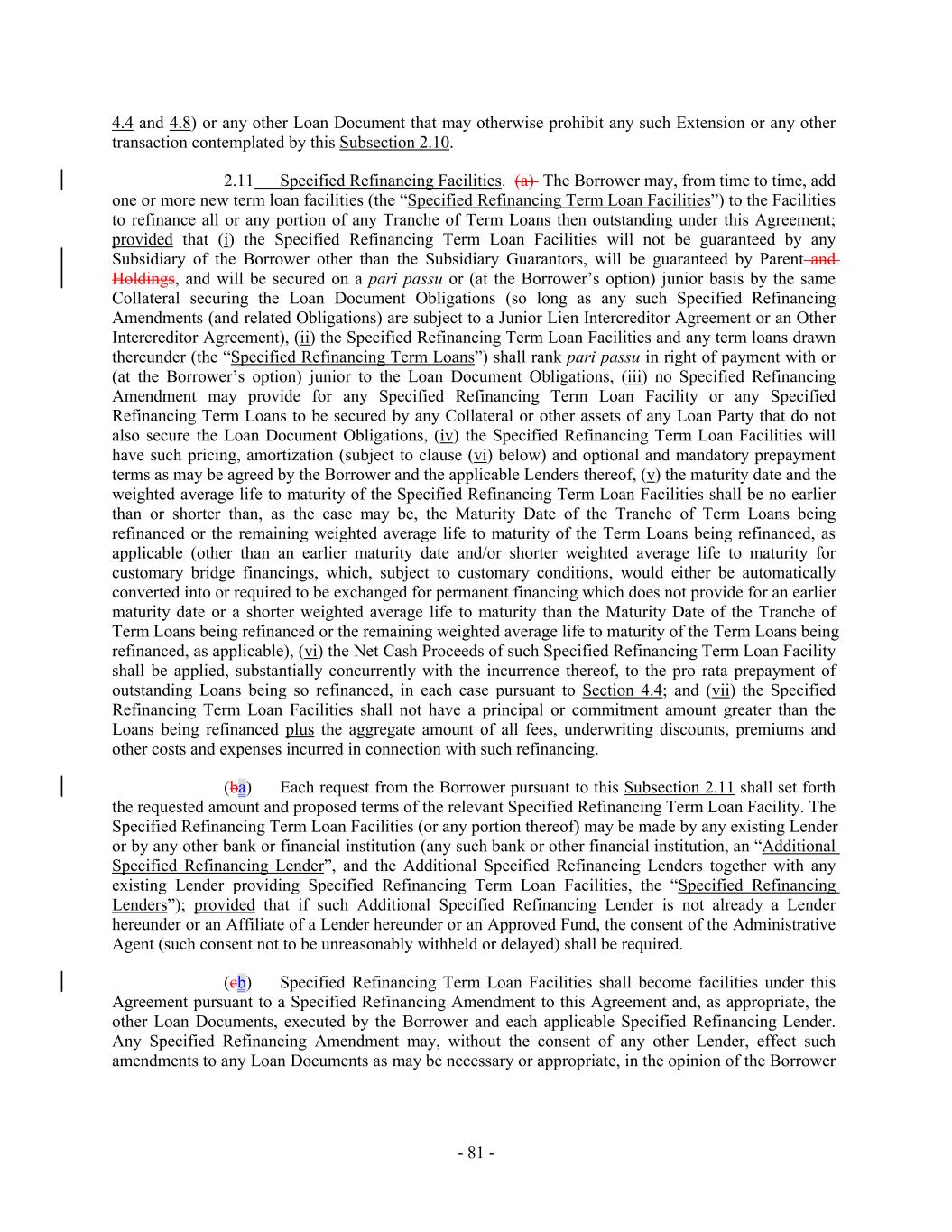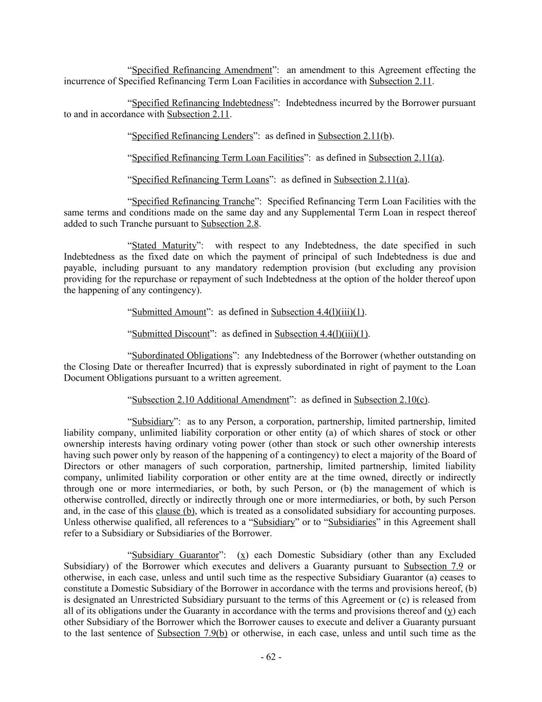 “Specified Refinancing Amendment”: an amendment to this Agreement effecting the incurrence of Specified Refinancing Term Loan Facilities in accordance with Subsection 2.11. “Specified Refinancing Indebtedness”: Indebtedness incurred by the Borrower pursuant to and in accordance with Subsection 2.11. “Specified Refinancing Lenders”: as defined in Subsection 2.11(b). “Specified Refinancing Term Loan Facilities”: as defined in Subsection 2.11(a). “Specified Refinancing Term Loans”: as defined in Subsection 2.11(a). “Specified Refinancing Tranche”: Specified Refinancing Term Loan Facilities with the same terms and conditions made on the same day and any Supplemental Term Loan in respect thereof added to such Tranche pursuant to Subsection 2.8. “Stated Maturity”: with respect to any Indebtedness, the date specified in such Indebtedness as the fixed date on which the payment of principal of such Indebtedness is due and payable, including pursuant to any mandatory redemption provision (but excluding any provision providing for the repurchase or repayment of such Indebtedness at the option of the holder thereof upon the happening of any contingency). “Submitted Amount”: as defined in Subsection 4.4(l)(iii)(1). “Submitted Discount”: as defined in Subsection 4.4(l)(iii)(1). “Subordinated Obligations”: any Indebtedness of the Borrower (whether outstanding on the Closing Date or thereafter Incurred) that is expressly subordinated in right of payment to the Loan Document Obligations pursuant to a written agreement. “Subsection 2.10 Additional Amendment”: as defined in Subsection 2.10(c). “Subsidiary”: as to any Person, a corporation, partnership, limited partnership, limited liability company, unlimited liability corporation or other entity (a) of which shares of stock or other ownership interests having ordinary voting power (other than stock or such other ownership interests having such power only by reason of the happening of a contingency) to elect a majority of the Board of Directors or other managers of such corporation, partnership, limited partnership, limited liability company, unlimited liability corporation or other entity are at the time owned, directly or indirectly through one or more intermediaries, or both, by such Person, or (b) the management of which is otherwise controlled, directly or indirectly through one or more intermediaries, or both, by such Person and, in the case of this clause (b), which is treated as a consolidated subsidiary for accounting purposes. Unless otherwise qualified, all references to a “Subsidiary” or to “Subsidiaries” in this Agreement shall refer to a Subsidiary or Subsidiaries of the Borrower. “Subsidiary Guarantor”: (x) each Domestic Subsidiary (other than any Excluded Subsidiary) of the Borrower which executes and delivers a Guaranty pursuant to Subsection 7.9 or otherwise, in each case, unless and until such time as the respective Subsidiary Guarantor (a) ceases to constitute a Domestic Subsidiary of the Borrower in accordance with the terms and provisions hereof, (b) is designated an Unrestricted Subsidiary pursuant to the terms of this Agreement or (c) is released from all of its obligations under the Guaranty in accordance with the terms and provisions thereof and (y) each other Subsidiary of the Borrower which the Borrower causes to execute and deliver a Guaranty pursuant to the last sentence of Subsection 7.9(b) or otherwise, in each case, unless and until such time as the - 62 -