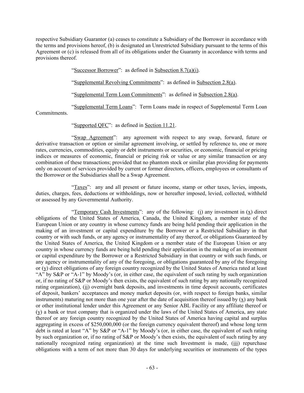 respective Subsidiary Guarantor (a) ceases to constitute a Subsidiary of the Borrower in accordance with the terms and provisions hereof, (b) is designated an Unrestricted Subsidiary pursuant to the terms of this Agreement or (c) is released from all of its obligations under the Guaranty in accordance with terms and provisions thereof. “Successor Borrower”: as defined in Subsection 8.7(a)(i). “Supplemental Revolving Commitments”: as defined in Subsection 2.8(a). “Supplemental Term Loan Commitments”: as defined in Subsection 2.8(a). “Supplemental Term Loans”: Term Loans made in respect of Supplemental Term Loan Commitments. “Supported QFC”: as defined in Section 11.21. “Swap Agreement”: any agreement with respect to any swap, forward, future or derivative transaction or option or similar agreement involving, or settled by reference to, one or more rates, currencies, commodities, equity or debt instruments or securities, or economic, financial or pricing indices or measures of economic, financial or pricing risk or value or any similar transaction or any combination of these transactions; provided that no phantom stock or similar plan providing for payments only on account of services provided by current or former directors, officers, employees or consultants of the Borrower or the Subsidiaries shall be a Swap Agreement. “Taxes”: any and all present or future income, stamp or other taxes, levies, imposts, duties, charges, fees, deductions or withholdings, now or hereafter imposed, levied, collected, withheld or assessed by any Governmental Authority. “Temporary Cash Investments”: any of the following: (i) any investment in (x) direct obligations of the United States of America, Canada, the United Kingdom, a member state of the European Union or any country in whose currency funds are being held pending their application in the making of an investment or capital expenditure by the Borrower or a Restricted Subsidiary in that country or with such funds, or any agency or instrumentality of any thereof, or obligations Guaranteed by the United States of America, the United Kingdom or a member state of the European Union or any country in whose currency funds are being held pending their application in the making of an investment or capital expenditure by the Borrower or a Restricted Subsidiary in that country or with such funds, or any agency or instrumentality of any of the foregoing, or obligations guaranteed by any of the foregoing or (y) direct obligations of any foreign country recognized by the United States of America rated at least “A” by S&P or “A-1” by Moody’s (or, in either case, the equivalent of such rating by such organization or, if no rating of S&P or Moody’s then exists, the equivalent of such rating by any nationally recognized rating organization), (ii) overnight bank deposits, and investments in time deposit accounts, certificates of deposit, bankers’ acceptances and money market deposits (or, with respect to foreign banks, similar instruments) maturing not more than one year after the date of acquisition thereof issued by (x) any bank or other institutional lender under this Agreement or any Senior ABL Facility or any affiliate thereof or (y) a bank or trust company that is organized under the laws of the United States of America, any state thereof or any foreign country recognized by the United States of America having capital and surplus aggregating in excess of $250,000,000 (or the foreign currency equivalent thereof) and whose long term debt is rated at least “A” by S&P or “A-1” by Moody’s (or, in either case, the equivalent of such rating by such organization or, if no rating of S&P or Moody’s then exists, the equivalent of such rating by any nationally recognized rating organization) at the time such Investment is made, (iii) repurchase obligations with a term of not more than 30 days for underlying securities or instruments of the types - 63 -