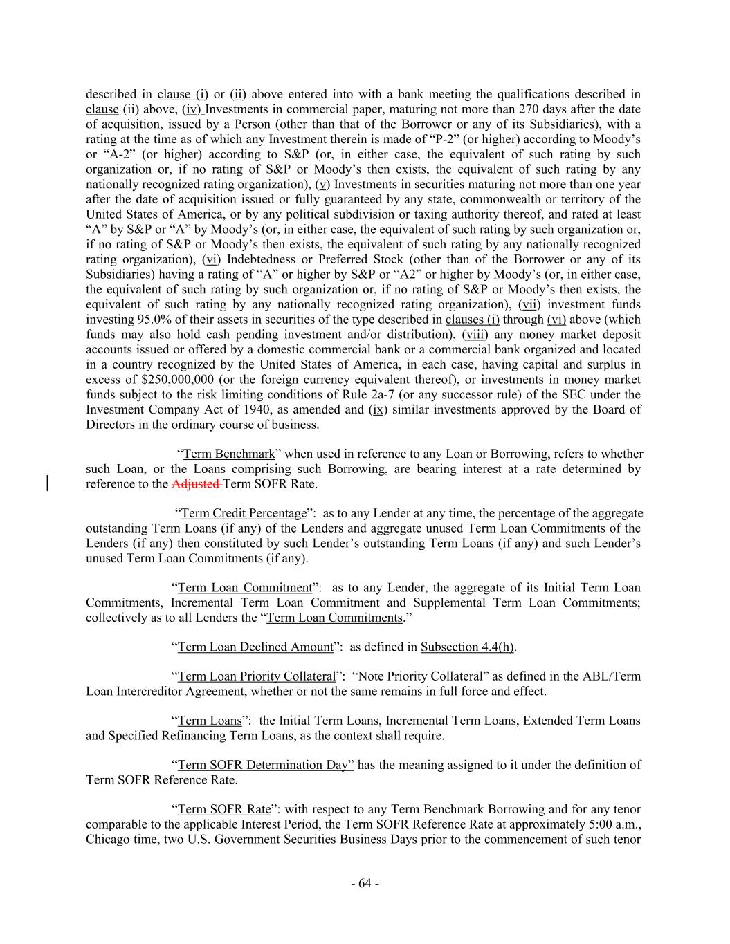 described in clause (i) or (ii) above entered into with a bank meeting the qualifications described in clause (ii) above, (iv) Investments in commercial paper, maturing not more than 270 days after the date of acquisition, issued by a Person (other than that of the Borrower or any of its Subsidiaries), with a rating at the time as of which any Investment therein is made of “P-2” (or higher) according to Moody’s or “A-2” (or higher) according to S&P (or, in either case, the equivalent of such rating by such organization or, if no rating of S&P or Moody’s then exists, the equivalent of such rating by any nationally recognized rating organization), (v) Investments in securities maturing not more than one year after the date of acquisition issued or fully guaranteed by any state, commonwealth or territory of the United States of America, or by any political subdivision or taxing authority thereof, and rated at least “A” by S&P or “A” by Moody’s (or, in either case, the equivalent of such rating by such organization or, if no rating of S&P or Moody’s then exists, the equivalent of such rating by any nationally recognized rating organization), (vi) Indebtedness or Preferred Stock (other than of the Borrower or any of its Subsidiaries) having a rating of “A” or higher by S&P or “A2” or higher by Moody’s (or, in either case, the equivalent of such rating by such organization or, if no rating of S&P or Moody’s then exists, the equivalent of such rating by any nationally recognized rating organization), (vii) investment funds investing 95.0% of their assets in securities of the type described in clauses (i) through (vi) above (which funds may also hold cash pending investment and/or distribution), (viii) any money market deposit accounts issued or offered by a domestic commercial bank or a commercial bank organized and located in a country recognized by the United States of America, in each case, having capital and surplus in excess of $250,000,000 (or the foreign currency equivalent thereof), or investments in money market funds subject to the risk limiting conditions of Rule 2a-7 (or any successor rule) of the SEC under the Investment Company Act of 1940, as amended and (ix) similar investments approved by the Board of Directors in the ordinary course of business. “Term Benchmark” when used in reference to any Loan or Borrowing, refers to whether such Loan, or the Loans comprising such Borrowing, are bearing interest at a rate determined by reference to the Adjusted Term SOFR Rate. “Term Credit Percentage”: as to any Lender at any time, the percentage of the aggregate outstanding Term Loans (if any) of the Lenders and aggregate unused Term Loan Commitments of the Lenders (if any) then constituted by such Lender’s outstanding Term Loans (if any) and such Lender’s unused Term Loan Commitments (if any). “Term Loan Commitment”: as to any Lender, the aggregate of its Initial Term Loan Commitments, Incremental Term Loan Commitment and Supplemental Term Loan Commitments; collectively as to all Lenders the “Term Loan Commitments.” “Term Loan Declined Amount”: as defined in Subsection 4.4(h). “Term Loan Priority Collateral”: “Note Priority Collateral” as defined in the ABL/Term Loan Intercreditor Agreement, whether or not the same remains in full force and effect. “Term Loans”: the Initial Term Loans, Incremental Term Loans, Extended Term Loans and Specified Refinancing Term Loans, as the context shall require. “Term SOFR Determination Day” has the meaning assigned to it under the definition of Term SOFR Reference Rate. “Term SOFR Rate”: with respect to any Term Benchmark Borrowing and for any tenor comparable to the applicable Interest Period, the Term SOFR Reference Rate at approximately 5:00 a.m., Chicago time, two U.S. Government Securities Business Days prior to the commencement of such tenor - 64 -