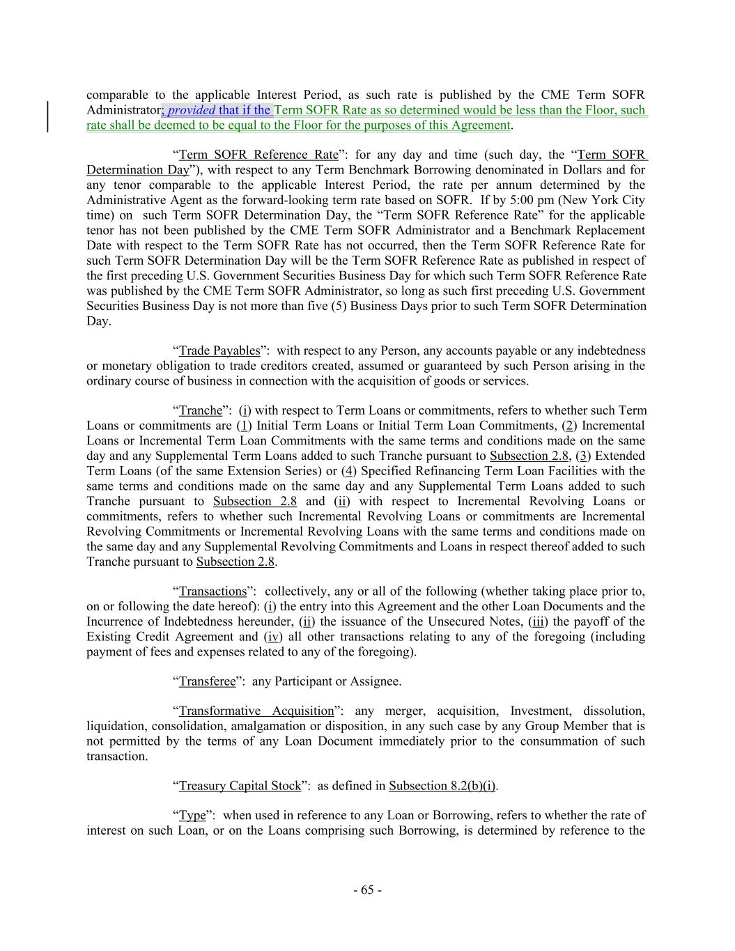 comparable to the applicable Interest Period, as such rate is published by the CME Term SOFR Administrator; provided that if the Term SOFR Rate as so determined would be less than the Floor, such rate shall be deemed to be equal to the Floor for the purposes of this Agreement. “Term SOFR Reference Rate”: for any day and time (such day, the “Term SOFR Determination Day”), with respect to any Term Benchmark Borrowing denominated in Dollars and for any tenor comparable to the applicable Interest Period, the rate per annum determined by the Administrative Agent as the forward-looking term rate based on SOFR. If by 5:00 pm (New York City time) on such Term SOFR Determination Day, the “Term SOFR Reference Rate” for the applicable tenor has not been published by the CME Term SOFR Administrator and a Benchmark Replacement Date with respect to the Term SOFR Rate has not occurred, then the Term SOFR Reference Rate for such Term SOFR Determination Day will be the Term SOFR Reference Rate as published in respect of the first preceding U.S. Government Securities Business Day for which such Term SOFR Reference Rate was published by the CME Term SOFR Administrator, so long as such first preceding U.S. Government Securities Business Day is not more than five (5) Business Days prior to such Term SOFR Determination Day. “Trade Payables”: with respect to any Person, any accounts payable or any indebtedness or monetary obligation to trade creditors created, assumed or guaranteed by such Person arising in the ordinary course of business in connection with the acquisition of goods or services. “Tranche”: (i) with respect to Term Loans or commitments, refers to whether such Term Loans or commitments are (1) Initial Term Loans or Initial Term Loan Commitments, (2) Incremental Loans or Incremental Term Loan Commitments with the same terms and conditions made on the same day and any Supplemental Term Loans added to such Tranche pursuant to Subsection 2.8, (3) Extended Term Loans (of the same Extension Series) or (4) Specified Refinancing Term Loan Facilities with the same terms and conditions made on the same day and any Supplemental Term Loans added to such Tranche pursuant to Subsection 2.8 and (ii) with respect to Incremental Revolving Loans or commitments, refers to whether such Incremental Revolving Loans or commitments are Incremental Revolving Commitments or Incremental Revolving Loans with the same terms and conditions made on the same day and any Supplemental Revolving Commitments and Loans in respect thereof added to such Tranche pursuant to Subsection 2.8. “Transactions”: collectively, any or all of the following (whether taking place prior to, on or following the date hereof): (i) the entry into this Agreement and the other Loan Documents and the Incurrence of Indebtedness hereunder, (ii) the issuance of the Unsecured Notes, (iii) the payoff of the Existing Credit Agreement and (iv) all other transactions relating to any of the foregoing (including payment of fees and expenses related to any of the foregoing). “Transferee”: any Participant or Assignee. “Transformative Acquisition”: any merger, acquisition, Investment, dissolution, liquidation, consolidation, amalgamation or disposition, in any such case by any Group Member that is not permitted by the terms of any Loan Document immediately prior to the consummation of such transaction. “Treasury Capital Stock”: as defined in Subsection 8.2(b)(i). “Type”: when used in reference to any Loan or Borrowing, refers to whether the rate of interest on such Loan, or on the Loans comprising such Borrowing, is determined by reference to the - 65 -