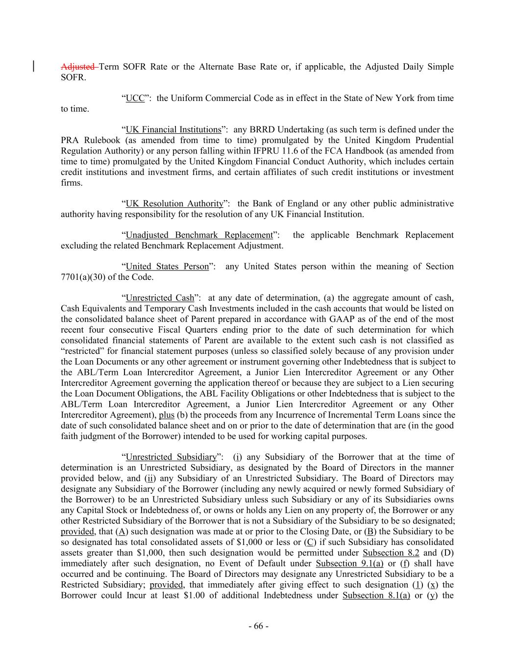 Adjusted Term SOFR Rate or the Alternate Base Rate or, if applicable, the Adjusted Daily Simple SOFR. “UCC”: the Uniform Commercial Code as in effect in the State of New York from time to time. “UK Financial Institutions”: any BRRD Undertaking (as such term is defined under the PRA Rulebook (as amended from time to time) promulgated by the United Kingdom Prudential Regulation Authority) or any person falling within IFPRU 11.6 of the FCA Handbook (as amended from time to time) promulgated by the United Kingdom Financial Conduct Authority, which includes certain credit institutions and investment firms, and certain affiliates of such credit institutions or investment firms. “UK Resolution Authority”: the Bank of England or any other public administrative authority having responsibility for the resolution of any UK Financial Institution. “Unadjusted Benchmark Replacement”: the applicable Benchmark Replacement excluding the related Benchmark Replacement Adjustment. “United States Person”: any United States person within the meaning of Section 7701(a)(30) of the Code. “Unrestricted Cash”: at any date of determination, (a) the aggregate amount of cash, Cash Equivalents and Temporary Cash Investments included in the cash accounts that would be listed on the consolidated balance sheet of Parent prepared in accordance with GAAP as of the end of the most recent four consecutive Fiscal Quarters ending prior to the date of such determination for which consolidated financial statements of Parent are available to the extent such cash is not classified as “restricted” for financial statement purposes (unless so classified solely because of any provision under the Loan Documents or any other agreement or instrument governing other Indebtedness that is subject to the ABL/Term Loan Intercreditor Agreement, a Junior Lien Intercreditor Agreement or any Other Intercreditor Agreement governing the application thereof or because they are subject to a Lien securing the Loan Document Obligations, the ABL Facility Obligations or other Indebtedness that is subject to the ABL/Term Loan Intercreditor Agreement, a Junior Lien Intercreditor Agreement or any Other Intercreditor Agreement), plus (b) the proceeds from any Incurrence of Incremental Term Loans since the date of such consolidated balance sheet and on or prior to the date of determination that are (in the good faith judgment of the Borrower) intended to be used for working capital purposes. “Unrestricted Subsidiary”: (i) any Subsidiary of the Borrower that at the time of determination is an Unrestricted Subsidiary, as designated by the Board of Directors in the manner provided below, and (ii) any Subsidiary of an Unrestricted Subsidiary. The Board of Directors may designate any Subsidiary of the Borrower (including any newly acquired or newly formed Subsidiary of the Borrower) to be an Unrestricted Subsidiary unless such Subsidiary or any of its Subsidiaries owns any Capital Stock or Indebtedness of, or owns or holds any Lien on any property of, the Borrower or any other Restricted Subsidiary of the Borrower that is not a Subsidiary of the Subsidiary to be so designated; provided, that (A) such designation was made at or prior to the Closing Date, or (B) the Subsidiary to be so designated has total consolidated assets of $1,000 or less or (C) if such Subsidiary has consolidated assets greater than $1,000, then such designation would be permitted under Subsection 8.2 and (D) immediately after such designation, no Event of Default under Subsection 9.1(a) or (f) shall have occurred and be continuing. The Board of Directors may designate any Unrestricted Subsidiary to be a Restricted Subsidiary; provided, that immediately after giving effect to such designation (1) (x) the Borrower could Incur at least $1.00 of additional Indebtedness under Subsection 8.1(a) or (y) the - 66 -