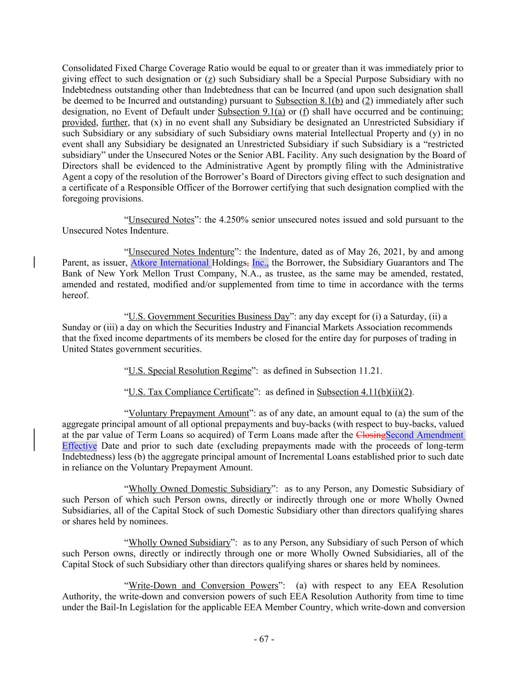 Consolidated Fixed Charge Coverage Ratio would be equal to or greater than it was immediately prior to giving effect to such designation or (z) such Subsidiary shall be a Special Purpose Subsidiary with no Indebtedness outstanding other than Indebtedness that can be Incurred (and upon such designation shall be deemed to be Incurred and outstanding) pursuant to Subsection 8.1(b) and (2) immediately after such designation, no Event of Default under Subsection 9.1(a) or (f) shall have occurred and be continuing; provided, further, that (x) in no event shall any Subsidiary be designated an Unrestricted Subsidiary if such Subsidiary or any subsidiary of such Subsidiary owns material Intellectual Property and (y) in no event shall any Subsidiary be designated an Unrestricted Subsidiary if such Subsidiary is a “restricted subsidiary” under the Unsecured Notes or the Senior ABL Facility. Any such designation by the Board of Directors shall be evidenced to the Administrative Agent by promptly filing with the Administrative Agent a copy of the resolution of the Borrower’s Board of Directors giving effect to such designation and a certificate of a Responsible Officer of the Borrower certifying that such designation complied with the foregoing provisions. “Unsecured Notes”: the 4.250% senior unsecured notes issued and sold pursuant to the Unsecured Notes Indenture. “Unsecured Notes Indenture”: the Indenture, dated as of May 26, 2021, by and among Parent, as issuer, Atkore International Holdings, Inc., the Borrower, the Subsidiary Guarantors and The Bank of New York Mellon Trust Company, N.A., as trustee, as the same may be amended, restated, amended and restated, modified and/or supplemented from time to time in accordance with the terms hereof. “U.S. Government Securities Business Day”: any day except for (i) a Saturday, (ii) a Sunday or (iii) a day on which the Securities Industry and Financial Markets Association recommends that the fixed income departments of its members be closed for the entire day for purposes of trading in United States government securities. “U.S. Special Resolution Regime”: as defined in Subsection 11.21. “U.S. Tax Compliance Certificate”: as defined in Subsection 4.11(b)(ii)(2). “Voluntary Prepayment Amount”: as of any date, an amount equal to (a) the sum of the aggregate principal amount of all optional prepayments and buy-backs (with respect to buy-backs, valued at the par value of Term Loans so acquired) of Term Loans made after the ClosingSecond Amendment Effective Date and prior to such date (excluding prepayments made with the proceeds of long-term Indebtedness) less (b) the aggregate principal amount of Incremental Loans established prior to such date in reliance on the Voluntary Prepayment Amount. “Wholly Owned Domestic Subsidiary”: as to any Person, any Domestic Subsidiary of such Person of which such Person owns, directly or indirectly through one or more Wholly Owned Subsidiaries, all of the Capital Stock of such Domestic Subsidiary other than directors qualifying shares or shares held by nominees. “Wholly Owned Subsidiary”: as to any Person, any Subsidiary of such Person of which such Person owns, directly or indirectly through one or more Wholly Owned Subsidiaries, all of the Capital Stock of such Subsidiary other than directors qualifying shares or shares held by nominees. “Write-Down and Conversion Powers”: (a) with respect to any EEA Resolution Authority, the write-down and conversion powers of such EEA Resolution Authority from time to time under the Bail-In Legislation for the applicable EEA Member Country, which write-down and conversion - 67 -