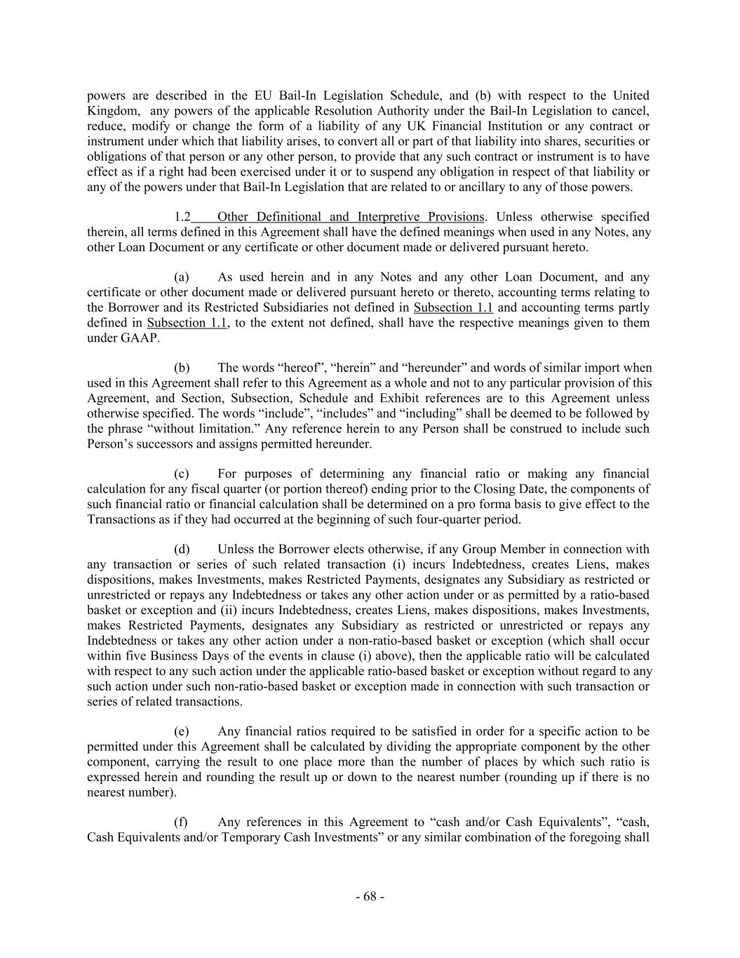 powers are described in the EU Bail-In Legislation Schedule, and (b) with respect to the United Kingdom, any powers of the applicable Resolution Authority under the Bail-In Legislation to cancel, reduce, modify or change the form of a liability of any UK Financial Institution or any contract or instrument under which that liability arises, to convert all or part of that liability into shares, securities or obligations of that person or any other person, to provide that any such contract or instrument is to have effect as if a right had been exercised under it or to suspend any obligation in respect of that liability or any of the powers under that Bail-In Legislation that are related to or ancillary to any of those powers. 1.2 Other Definitional and Interpretive Provisions. Unless otherwise specified therein, all terms defined in this Agreement shall have the defined meanings when used in any Notes, any other Loan Document or any certificate or other document made or delivered pursuant hereto. (a) As used herein and in any Notes and any other Loan Document, and any certificate or other document made or delivered pursuant hereto or thereto, accounting terms relating to the Borrower and its Restricted Subsidiaries not defined in Subsection 1.1 and accounting terms partly defined in Subsection 1.1, to the extent not defined, shall have the respective meanings given to them under GAAP. (b) The words “hereof”, “herein” and “hereunder” and words of similar import when used in this Agreement shall refer to this Agreement as a whole and not to any particular provision of this Agreement, and Section, Subsection, Schedule and Exhibit references are to this Agreement unless otherwise specified. The words “include”, “includes” and “including” shall be deemed to be followed by the phrase “without limitation.” Any reference herein to any Person shall be construed to include such Person’s successors and assigns permitted hereunder. (c) For purposes of determining any financial ratio or making any financial calculation for any fiscal quarter (or portion thereof) ending prior to the Closing Date, the components of such financial ratio or financial calculation shall be determined on a pro forma basis to give effect to the Transactions as if they had occurred at the beginning of such four-quarter period. (d) Unless the Borrower elects otherwise, if any Group Member in connection with any transaction or series of such related transaction (i) incurs Indebtedness, creates Liens, makes dispositions, makes Investments, makes Restricted Payments, designates any Subsidiary as restricted or unrestricted or repays any Indebtedness or takes any other action under or as permitted by a ratio-based basket or exception and (ii) incurs Indebtedness, creates Liens, makes dispositions, makes Investments, makes Restricted Payments, designates any Subsidiary as restricted or unrestricted or repays any Indebtedness or takes any other action under a non-ratio-based basket or exception (which shall occur within five Business Days of the events in clause (i) above), then the applicable ratio will be calculated with respect to any such action under the applicable ratio-based basket or exception without regard to any such action under such non-ratio-based basket or exception made in connection with such transaction or series of related transactions. (e) Any financial ratios required to be satisfied in order for a specific action to be permitted under this Agreement shall be calculated by dividing the appropriate component by the other component, carrying the result to one place more than the number of places by which such ratio is expressed herein and rounding the result up or down to the nearest number (rounding up if there is no nearest number). (f) Any references in this Agreement to “cash and/or Cash Equivalents”, “cash, Cash Equivalents and/or Temporary Cash Investments” or any similar combination of the foregoing shall - 68 -