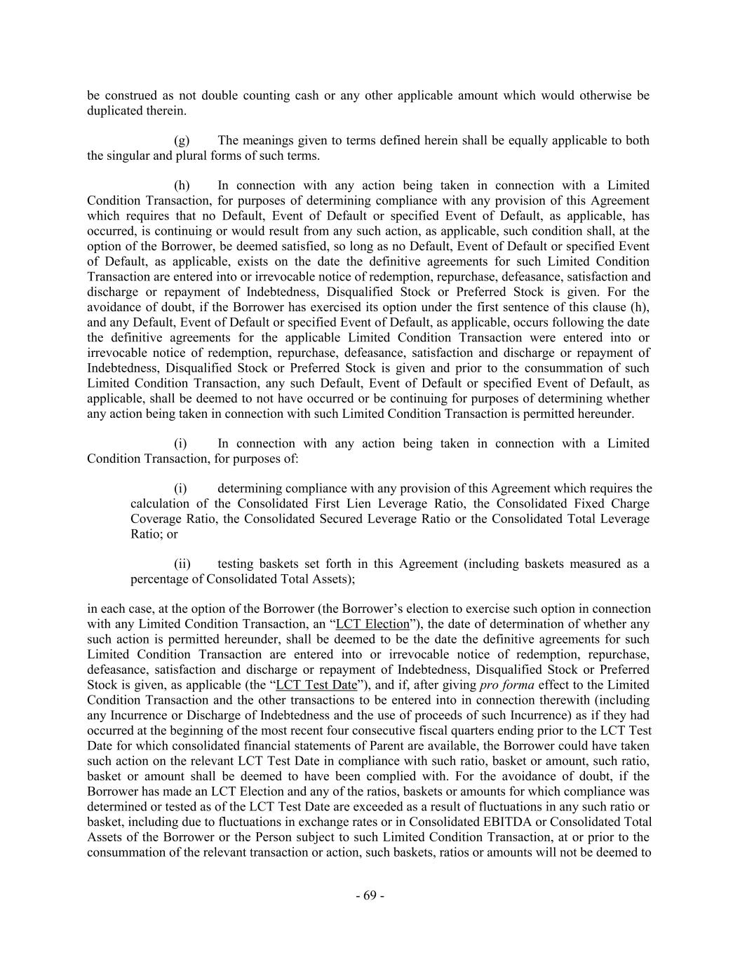 be construed as not double counting cash or any other applicable amount which would otherwise be duplicated therein. (g) The meanings given to terms defined herein shall be equally applicable to both the singular and plural forms of such terms. (h) In connection with any action being taken in connection with a Limited Condition Transaction, for purposes of determining compliance with any provision of this Agreement which requires that no Default, Event of Default or specified Event of Default, as applicable, has occurred, is continuing or would result from any such action, as applicable, such condition shall, at the option of the Borrower, be deemed satisfied, so long as no Default, Event of Default or specified Event of Default, as applicable, exists on the date the definitive agreements for such Limited Condition Transaction are entered into or irrevocable notice of redemption, repurchase, defeasance, satisfaction and discharge or repayment of Indebtedness, Disqualified Stock or Preferred Stock is given. For the avoidance of doubt, if the Borrower has exercised its option under the first sentence of this clause (h), and any Default, Event of Default or specified Event of Default, as applicable, occurs following the date the definitive agreements for the applicable Limited Condition Transaction were entered into or irrevocable notice of redemption, repurchase, defeasance, satisfaction and discharge or repayment of Indebtedness, Disqualified Stock or Preferred Stock is given and prior to the consummation of such Limited Condition Transaction, any such Default, Event of Default or specified Event of Default, as applicable, shall be deemed to not have occurred or be continuing for purposes of determining whether any action being taken in connection with such Limited Condition Transaction is permitted hereunder. (i) In connection with any action being taken in connection with a Limited Condition Transaction, for purposes of: (i) determining compliance with any provision of this Agreement which requires the calculation of the Consolidated First Lien Leverage Ratio, the Consolidated Fixed Charge Coverage Ratio, the Consolidated Secured Leverage Ratio or the Consolidated Total Leverage Ratio; or (ii) testing baskets set forth in this Agreement (including baskets measured as a percentage of Consolidated Total Assets); in each case, at the option of the Borrower (the Borrower’s election to exercise such option in connection with any Limited Condition Transaction, an “LCT Election”), the date of determination of whether any such action is permitted hereunder, shall be deemed to be the date the definitive agreements for such Limited Condition Transaction are entered into or irrevocable notice of redemption, repurchase, defeasance, satisfaction and discharge or repayment of Indebtedness, Disqualified Stock or Preferred Stock is given, as applicable (the “LCT Test Date”), and if, after giving pro forma effect to the Limited Condition Transaction and the other transactions to be entered into in connection therewith (including any Incurrence or Discharge of Indebtedness and the use of proceeds of such Incurrence) as if they had occurred at the beginning of the most recent four consecutive fiscal quarters ending prior to the LCT Test Date for which consolidated financial statements of Parent are available, the Borrower could have taken such action on the relevant LCT Test Date in compliance with such ratio, basket or amount, such ratio, basket or amount shall be deemed to have been complied with. For the avoidance of doubt, if the Borrower has made an LCT Election and any of the ratios, baskets or amounts for which compliance was determined or tested as of the LCT Test Date are exceeded as a result of fluctuations in any such ratio or basket, including due to fluctuations in exchange rates or in Consolidated EBITDA or Consolidated Total Assets of the Borrower or the Person subject to such Limited Condition Transaction, at or prior to the consummation of the relevant transaction or action, such baskets, ratios or amounts will not be deemed to - 69 -