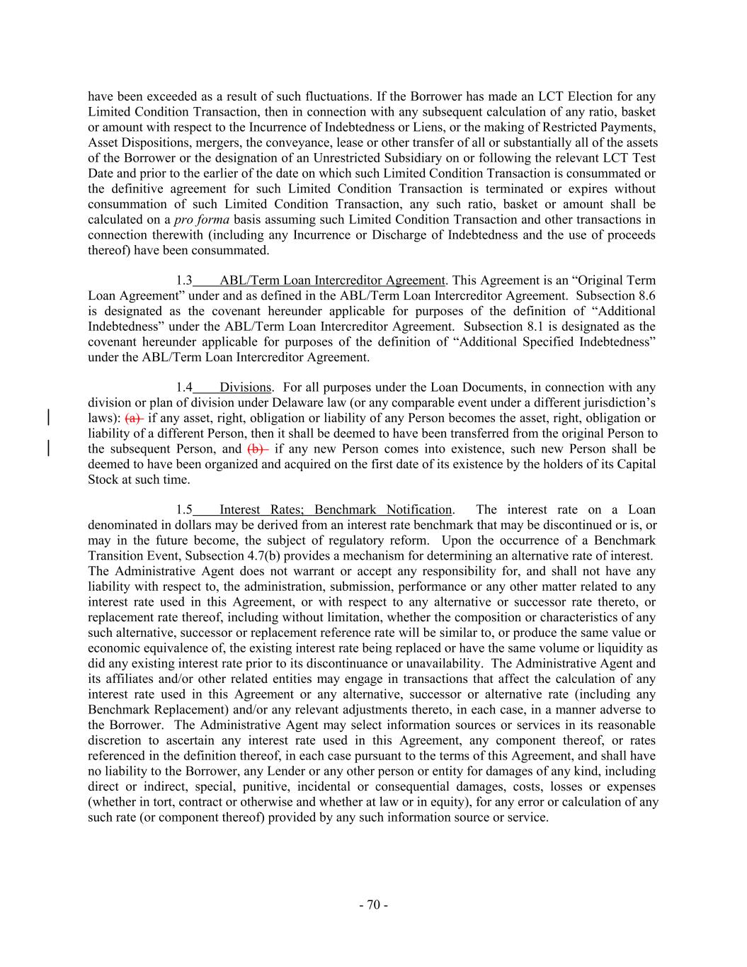 have been exceeded as a result of such fluctuations. If the Borrower has made an LCT Election for any Limited Condition Transaction, then in connection with any subsequent calculation of any ratio, basket or amount with respect to the Incurrence of Indebtedness or Liens, or the making of Restricted Payments, Asset Dispositions, mergers, the conveyance, lease or other transfer of all or substantially all of the assets of the Borrower or the designation of an Unrestricted Subsidiary on or following the relevant LCT Test Date and prior to the earlier of the date on which such Limited Condition Transaction is consummated or the definitive agreement for such Limited Condition Transaction is terminated or expires without consummation of such Limited Condition Transaction, any such ratio, basket or amount shall be calculated on a pro forma basis assuming such Limited Condition Transaction and other transactions in connection therewith (including any Incurrence or Discharge of Indebtedness and the use of proceeds thereof) have been consummated. 1.3 ABL/Term Loan Intercreditor Agreement. This Agreement is an “Original Term Loan Agreement” under and as defined in the ABL/Term Loan Intercreditor Agreement. Subsection 8.6 is designated as the covenant hereunder applicable for purposes of the definition of “Additional Indebtedness” under the ABL/Term Loan Intercreditor Agreement. Subsection 8.1 is designated as the covenant hereunder applicable for purposes of the definition of “Additional Specified Indebtedness” under the ABL/Term Loan Intercreditor Agreement. 1.4 Divisions. For all purposes under the Loan Documents, in connection with any division or plan of division under Delaware law (or any comparable event under a different jurisdiction’s laws): (a) if any asset, right, obligation or liability of any Person becomes the asset, right, obligation or liability of a different Person, then it shall be deemed to have been transferred from the original Person to the subsequent Person, and (b) if any new Person comes into existence, such new Person shall be deemed to have been organized and acquired on the first date of its existence by the holders of its Capital Stock at such time. 1.5 Interest Rates; Benchmark Notification. The interest rate on a Loan denominated in dollars may be derived from an interest rate benchmark that may be discontinued or is, or may in the future become, the subject of regulatory reform. Upon the occurrence of a Benchmark Transition Event, Subsection 4.7(b) provides a mechanism for determining an alternative rate of interest. The Administrative Agent does not warrant or accept any responsibility for, and shall not have any liability with respect to, the administration, submission, performance or any other matter related to any interest rate used in this Agreement, or with respect to any alternative or successor rate thereto, or replacement rate thereof, including without limitation, whether the composition or characteristics of any such alternative, successor or replacement reference rate will be similar to, or produce the same value or economic equivalence of, the existing interest rate being replaced or have the same volume or liquidity as did any existing interest rate prior to its discontinuance or unavailability. The Administrative Agent and its affiliates and/or other related entities may engage in transactions that affect the calculation of any interest rate used in this Agreement or any alternative, successor or alternative rate (including any Benchmark Replacement) and/or any relevant adjustments thereto, in each case, in a manner adverse to the Borrower. The Administrative Agent may select information sources or services in its reasonable discretion to ascertain any interest rate used in this Agreement, any component thereof, or rates referenced in the definition thereof, in each case pursuant to the terms of this Agreement, and shall have no liability to the Borrower, any Lender or any other person or entity for damages of any kind, including direct or indirect, special, punitive, incidental or consequential damages, costs, losses or expenses (whether in tort, contract or otherwise and whether at law or in equity), for any error or calculation of any such rate (or component thereof) provided by any such information source or service. - 70 -