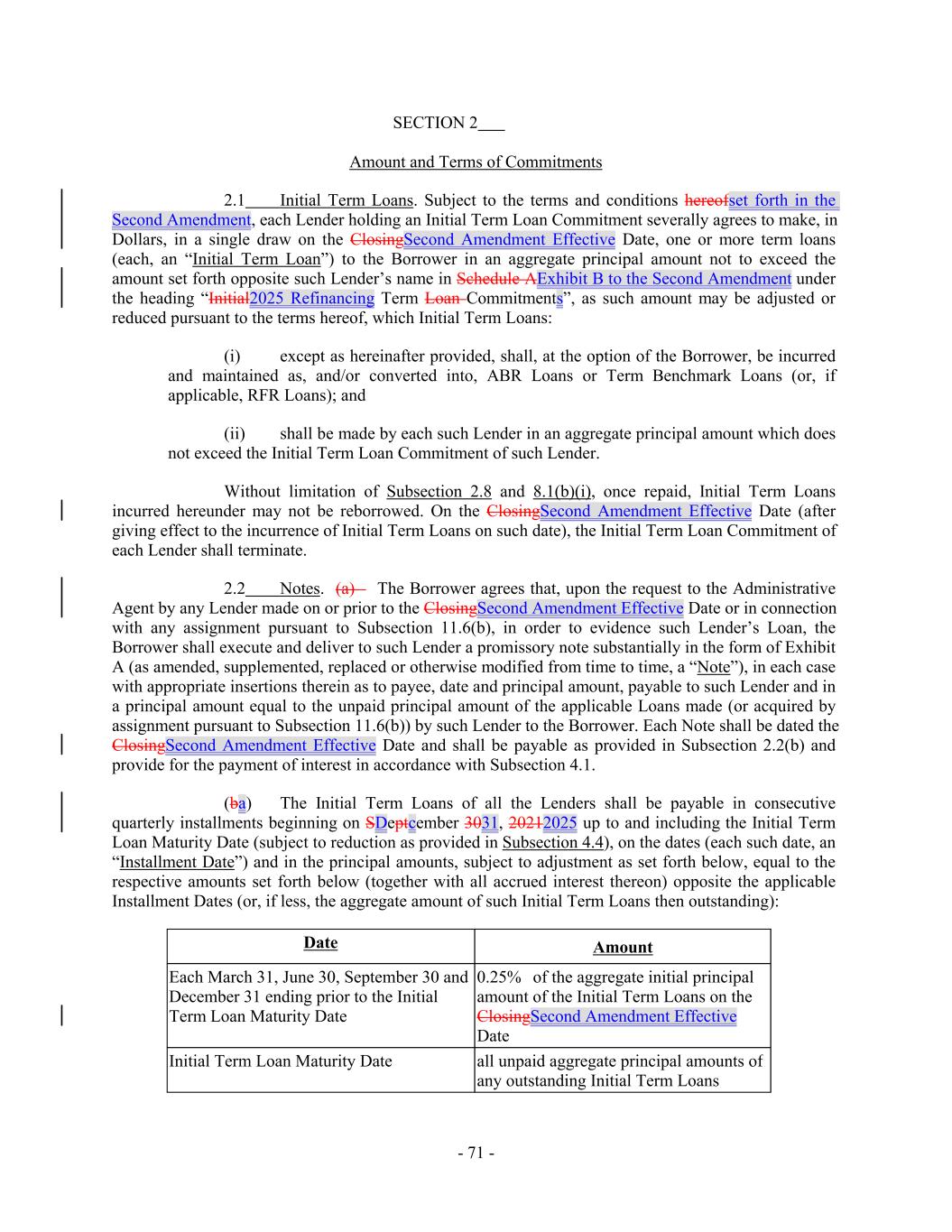 - 71 - Each March 31, June 30, September 30 and December 31 ending prior to the Initial Term Loan Maturity Date 0.25% of the aggregate initial principal amount of the Initial Term Loans on the ClosingSecond Amendment Effective Date Date Initial Term Loan Maturity Date Amount all unpaid aggregate principal amounts of any outstanding Initial Term Loans SECTION 2 Amount and Terms of Commitments 2.1 Initial Term Loans. Subject to the terms and conditions hereofset forth in the Second Amendment, each Lender holding an Initial Term Loan Commitment severally agrees to make, in Dollars, in a single draw on the ClosingSecond Amendment Effective Date, one or more term loans (each, an “Initial Term Loan”) to the Borrower in an aggregate principal amount not to exceed the amount set forth opposite such Lender’s name in Schedule AExhibit B to the Second Amendment under the heading “Initial2025 Refinancing Term Loan Commitments”, as such amount may be adjusted or reduced pursuant to the terms hereof, which Initial Term Loans: (i) except as hereinafter provided, shall, at the option of the Borrower, be incurred and maintained as, and/or converted into, ABR Loans or Term Benchmark Loans (or, if applicable, RFR Loans); and (ii) shall be made by each such Lender in an aggregate principal amount which does not exceed the Initial Term Loan Commitment of such Lender. Without limitation of Subsection 2.8 and 8.1(b)(i), once repaid, Initial Term Loans incurred hereunder may not be reborrowed. On the ClosingSecond Amendment Effective Date (after giving effect to the incurrence of Initial Term Loans on such date), the Initial Term Loan Commitment of each Lender shall terminate. 2.2 Notes. (a) The Borrower agrees that, upon the request to the Administrative Agent by any Lender made on or prior to the ClosingSecond Amendment Effective Date or in connection with any assignment pursuant to Subsection 11.6(b), in order to evidence such Lender’s Loan, the Borrower shall execute and deliver to such Lender a promissory note substantially in the form of Exhibit A (as amended, supplemented, replaced or otherwise modified from time to time, a “Note”), in each case with appropriate insertions therein as to payee, date and principal amount, payable to such Lender and in a principal amount equal to the unpaid principal amount of the applicable Loans made (or acquired by assignment pursuant to Subsection 11.6(b)) by such Lender to the Borrower. Each Note shall be dated the ClosingSecond Amendment Effective Date and shall be payable as provided in Subsection 2.2(b) and provide for the payment of interest in accordance with Subsection 4.1. (ba) The Initial Term Loans of all the Lenders shall be payable in consecutive quarterly installments beginning on SDeptcember 3031, 20212025 up to and including the Initial Term Loan Maturity Date (subject to reduction as provided in Subsection 4.4), on the dates (each such date, an “Installment Date”) and in the principal amounts, subject to adjustment as set forth below, equal to the respective amounts set forth below (together with all accrued interest thereon) opposite the applicable Installment Dates (or, if less, the aggregate amount of such Initial Term Loans then outstanding):
