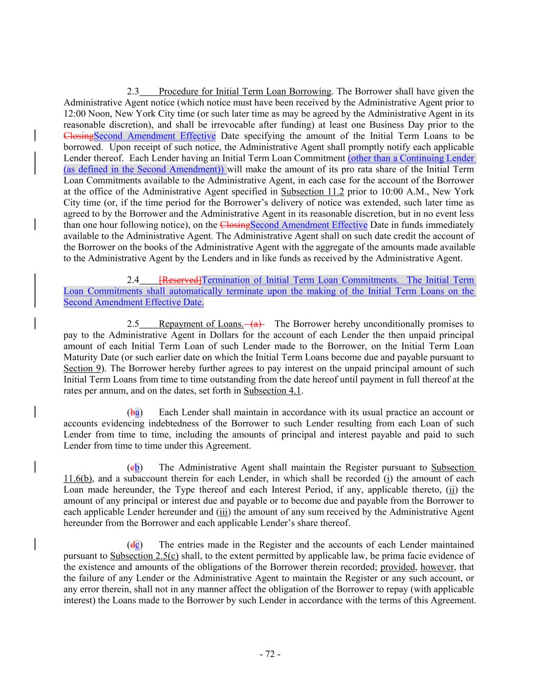 2.3 Procedure for Initial Term Loan Borrowing. The Borrower shall have given the Administrative Agent notice (which notice must have been received by the Administrative Agent prior to 12:00 Noon, New York City time (or such later time as may be agreed by the Administrative Agent in its reasonable discretion), and shall be irrevocable after funding) at least one Business Day prior to the ClosingSecond Amendment Effective Date specifying the amount of the Initial Term Loans to be borrowed. Upon receipt of such notice, the Administrative Agent shall promptly notify each applicable Lender thereof. Each Lender having an Initial Term Loan Commitment (other than a Continuing Lender (as defined in the Second Amendment)) will make the amount of its pro rata share of the Initial Term Loan Commitments available to the Administrative Agent, in each case for the account of the Borrower at the office of the Administrative Agent specified in Subsection 11.2 prior to 10:00 A.M., New York City time (or, if the time period for the Borrower’s delivery of notice was extended, such later time as agreed to by the Borrower and the Administrative Agent in its reasonable discretion, but in no event less than one hour following notice), on the ClosingSecond Amendment Effective Date in funds immediately available to the Administrative Agent. The Administrative Agent shall on such date credit the account of the Borrower on the books of the Administrative Agent with the aggregate of the amounts made available to the Administrative Agent by the Lenders and in like funds as received by the Administrative Agent. 2.4 [Reserved]Termination of Initial Term Loan Commitments. The Initial Term Loan Commitments shall automatically terminate upon the making of the Initial Term Loans on the Second Amendment Effective Date. 2.5 Repayment of Loans. (a) The Borrower hereby unconditionally promises to pay to the Administrative Agent in Dollars for the account of each Lender the then unpaid principal amount of each Initial Term Loan of such Lender made to the Borrower, on the Initial Term Loan Maturity Date (or such earlier date on which the Initial Term Loans become due and payable pursuant to Section 9). The Borrower hereby further agrees to pay interest on the unpaid principal amount of such Initial Term Loans from time to time outstanding from the date hereof until payment in full thereof at the rates per annum, and on the dates, set forth in Subsection 4.1. (ba) Each Lender shall maintain in accordance with its usual practice an account or accounts evidencing indebtedness of the Borrower to such Lender resulting from each Loan of such Lender from time to time, including the amounts of principal and interest payable and paid to such Lender from time to time under this Agreement. (cb) The Administrative Agent shall maintain the Register pursuant to Subsection 11.6(b), and a subaccount therein for each Lender, in which shall be recorded (i) the amount of each Loan made hereunder, the Type thereof and each Interest Period, if any, applicable thereto, (ii) the amount of any principal or interest due and payable or to become due and payable from the Borrower to each applicable Lender hereunder and (iii) the amount of any sum received by the Administrative Agent hereunder from the Borrower and each applicable Lender’s share thereof. (dc) The entries made in the Register and the accounts of each Lender maintained pursuant to Subsection 2.5(c) shall, to the extent permitted by applicable law, be prima facie evidence of the existence and amounts of the obligations of the Borrower therein recorded; provided, however, that the failure of any Lender or the Administrative Agent to maintain the Register or any such account, or any error therein, shall not in any manner affect the obligation of the Borrower to repay (with applicable interest) the Loans made to the Borrower by such Lender in accordance with the terms of this Agreement. - 72 -
