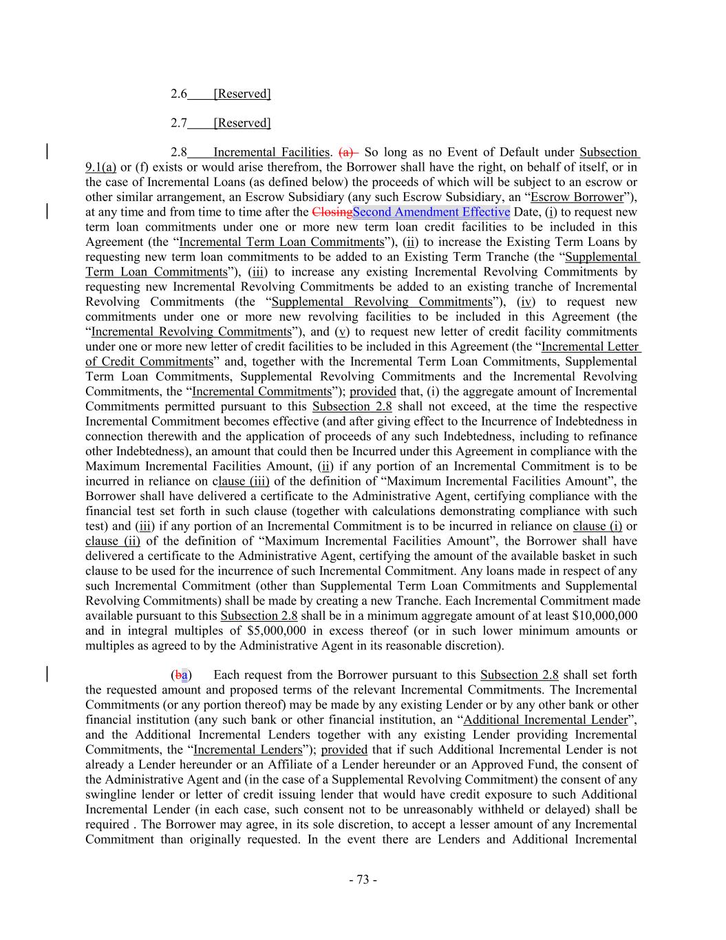 2.6 [Reserved] 2.7 [Reserved] 2.8 Incremental Facilities. (a) So long as no Event of Default under Subsection 9.1(a) or (f) exists or would arise therefrom, the Borrower shall have the right, on behalf of itself, or in the case of Incremental Loans (as defined below) the proceeds of which will be subject to an escrow or other similar arrangement, an Escrow Subsidiary (any such Escrow Subsidiary, an “Escrow Borrower”), at any time and from time to time after the ClosingSecond Amendment Effective Date, (i) to request new term loan commitments under one or more new term loan credit facilities to be included in this Agreement (the “Incremental Term Loan Commitments”), (ii) to increase the Existing Term Loans by requesting new term loan commitments to be added to an Existing Term Tranche (the “Supplemental Term Loan Commitments”), (iii) to increase any existing Incremental Revolving Commitments by requesting new Incremental Revolving Commitments be added to an existing tranche of Incremental Revolving Commitments (the “Supplemental Revolving Commitments”), (iv) to request new commitments under one or more new revolving facilities to be included in this Agreement (the “Incremental Revolving Commitments”), and (v) to request new letter of credit facility commitments under one or more new letter of credit facilities to be included in this Agreement (the “Incremental Letter of Credit Commitments” and, together with the Incremental Term Loan Commitments, Supplemental Term Loan Commitments, Supplemental Revolving Commitments and the Incremental Revolving Commitments, the “Incremental Commitments”); provided that, (i) the aggregate amount of Incremental Commitments permitted pursuant to this Subsection 2.8 shall not exceed, at the time the respective Incremental Commitment becomes effective (and after giving effect to the Incurrence of Indebtedness in connection therewith and the application of proceeds of any such Indebtedness, including to refinance other Indebtedness), an amount that could then be Incurred under this Agreement in compliance with the Maximum Incremental Facilities Amount, (ii) if any portion of an Incremental Commitment is to be incurred in reliance on clause (iii) of the definition of “Maximum Incremental Facilities Amount”, the Borrower shall have delivered a certificate to the Administrative Agent, certifying compliance with the financial test set forth in such clause (together with calculations demonstrating compliance with such test) and (iii) if any portion of an Incremental Commitment is to be incurred in reliance on clause (i) or clause (ii) of the definition of “Maximum Incremental Facilities Amount”, the Borrower shall have delivered a certificate to the Administrative Agent, certifying the amount of the available basket in such clause to be used for the incurrence of such Incremental Commitment. Any loans made in respect of any such Incremental Commitment (other than Supplemental Term Loan Commitments and Supplemental Revolving Commitments) shall be made by creating a new Tranche. Each Incremental Commitment made available pursuant to this Subsection 2.8 shall be in a minimum aggregate amount of at least $10,000,000 and in integral multiples of $5,000,000 in excess thereof (or in such lower minimum amounts or multiples as agreed to by the Administrative Agent in its reasonable discretion). (ba) Each request from the Borrower pursuant to this Subsection 2.8 shall set forth the requested amount and proposed terms of the relevant Incremental Commitments. The Incremental Commitments (or any portion thereof) may be made by any existing Lender or by any other bank or other financial institution (any such bank or other financial institution, an “Additional Incremental Lender”, and the Additional Incremental Lenders together with any existing Lender providing Incremental Commitments, the “Incremental Lenders”); provided that if such Additional Incremental Lender is not already a Lender hereunder or an Affiliate of a Lender hereunder or an Approved Fund, the consent of the Administrative Agent and (in the case of a Supplemental Revolving Commitment) the consent of any swingline lender or letter of credit issuing lender that would have credit exposure to such Additional Incremental Lender (in each case, such consent not to be unreasonably withheld or delayed) shall be required . The Borrower may agree, in its sole discretion, to accept a lesser amount of any Incremental Commitment than originally requested. In the event there are Lenders and Additional Incremental - 73 -