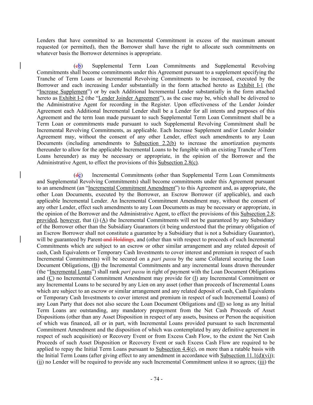 Lenders that have committed to an Incremental Commitment in excess of the maximum amount requested (or permitted), then the Borrower shall have the right to allocate such commitments on whatever basis the Borrower determines is appropriate. (cb) Supplemental Term Loan Commitments and Supplemental Revolving Commitments shall become commitments under this Agreement pursuant to a supplement specifying the Tranche of Term Loans or Incremental Revolving Commitments to be increased, executed by the Borrower and each increasing Lender substantially in the form attached hereto as Exhibit I-1 (the “Increase Supplement”) or by each Additional Incremental Lender substantially in the form attached hereto as Exhibit I-2 (the “Lender Joinder Agreement”), as the case may be, which shall be delivered to the Administrative Agent for recording in the Register. Upon effectiveness of the Lender Joinder Agreement each Additional Incremental Lender shall be a Lender for all intents and purposes of this Agreement and the term loan made pursuant to such Supplemental Term Loan Commitment shall be a Term Loan or commitments made pursuant to such Supplemental Revolving Commitment shall be Incremental Revolving Commitments, as applicable. Each Increase Supplement and/or Lender Joinder Agreement may, without the consent of any other Lender, effect such amendments to any Loan Documents (including amendments to Subsection 2.2(b) to increase the amortization payments thereunder to allow for the applicable Incremental Loans to be fungible with an existing Tranche of Term Loans hereunder) as may be necessary or appropriate, in the opinion of the Borrower and the Administrative Agent, to effect the provisions of this Subsection 2.8(c). (dc) Incremental Commitments (other than Supplemental Term Loan Commitments and Supplemental Revolving Commitments) shall become commitments under this Agreement pursuant to an amendment (an “Incremental Commitment Amendment”) to this Agreement and, as appropriate, the other Loan Documents, executed by the Borrower, an Escrow Borrower (if applicable), and each applicable Incremental Lender. An Incremental Commitment Amendment may, without the consent of any other Lender, effect such amendments to any Loan Documents as may be necessary or appropriate, in the opinion of the Borrower and the Administrative Agent, to effect the provisions of this Subsection 2.8; provided, however, that (i) (A) the Incremental Commitments will not be guaranteed by any Subsidiary of the Borrower other than the Subsidiary Guarantors (it being understood that the primary obligation of an Escrow Borrower shall not constitute a guarantee by a Subsidiary that is not a Subsidiary Guarantor), will be guaranteed by Parent and Holdings, and (other than with respect to proceeds of such Incremental Commitments which are subject to an escrow or other similar arrangement and any related deposit of cash, Cash Equivalents or Temporary Cash Investments to cover interest and premium in respect of such Incremental Commitments) will be secured on a pari passu by the same Collateral securing the Loan Document Obligations, (B) the Incremental Commitments and any incremental loans drawn thereunder (the “Incremental Loans”) shall rank pari passu in right of payment with the Loan Document Obligations and (C) no Incremental Commitment Amendment may provide for (I) any Incremental Commitment or any Incremental Loans to be secured by any Lien on any asset (other than proceeds of Incremental Loans which are subject to an escrow or similar arrangement and any related deposit of cash, Cash Equivalents or Temporary Cash Investments to cover interest and premium in respect of such Incremental Loans) of any Loan Party that does not also secure the Loan Document Obligations and (II) so long as any Initial Term Loans are outstanding, any mandatory prepayment from the Net Cash Proceeds of Asset Dispositions (other than any Asset Disposition in respect of any assets, business or Person the acquisition of which was financed, all or in part, with Incremental Loans provided pursuant to such Incremental Commitment Amendment and the disposition of which was contemplated by any definitive agreement in respect of such acquisition) or Recovery Event or from Excess Cash Flow, to the extent the Net Cash Proceeds of such Asset Disposition or Recovery Event or such Excess Cash Flow are required to be applied to repay the Initial Term Loans pursuant to Subsection 4.4(e), on more than a ratable basis with the Initial Term Loans (after giving effect to any amendment in accordance with Subsection 11.1(d)(vi)); (ii) no Lender will be required to provide any such Incremental Commitment unless it so agrees; (iii) the - 74 -