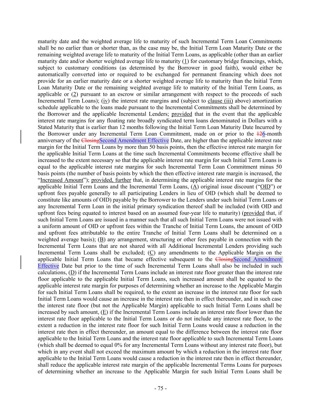 maturity date and the weighted average life to maturity of such Incremental Term Loan Commitments shall be no earlier than or shorter than, as the case may be, the Initial Term Loan Maturity Date or the remaining weighted average life to maturity of the Initial Term Loans, as applicable (other than an earlier maturity date and/or shorter weighted average life to maturity (1) for customary bridge financings, which, subject to customary conditions (as determined by the Borrower in good faith), would either be automatically converted into or required to be exchanged for permanent financing which does not provide for an earlier maturity date or a shorter weighted average life to maturity than the Initial Term Loan Maturity Date or the remaining weighted average life to maturity of the Initial Term Loans, as applicable or (2) pursuant to an escrow or similar arrangement with respect to the proceeds of such Incremental Term Loans); (iv) the interest rate margins and (subject to clause (iii) above) amortization schedule applicable to the loans made pursuant to the Incremental Commitments shall be determined by the Borrower and the applicable Incremental Lenders; provided that in the event that the applicable interest rate margins for any floating rate broadly syndicated term loans denominated in Dollars with a Stated Maturity that is earlier than 12 months following the Initial Term Loan Maturity Date Incurred by the Borrower under any Incremental Term Loan Commitment, made on or prior to the 126-month anniversary of the ClosingSecond Amendment Effective Date, are higher than the applicable interest rate margin for the Initial Term Loans by more than 50 basis points, then the effective interest rate margin for the applicable Initial Term Loans at the time such Incremental Commitments become effective shall be increased to the extent necessary so that the applicable interest rate margin for such Initial Term Loans is equal to the applicable interest rate margins for such Incremental Term Loan Commitment minus 50 basis points (the number of basis points by which the then effective interest rate margin is increased, the “Increased Amount”); provided, further that, in determining the applicable interest rate margins for the applicable Initial Term Loans and the Incremental Term Loans, (A) original issue discount (“OID”) or upfront fees payable generally to all participating Lenders in lieu of OID (which shall be deemed to constitute like amounts of OID) payable by the Borrower to the Lenders under such Initial Term Loans or any Incremental Term Loan in the initial primary syndication thereof shall be included (with OID and upfront fees being equated to interest based on an assumed four-year life to maturity) (provided that, if such Initial Term Loans are issued in a manner such that all such Initial Term Loans were not issued with a uniform amount of OID or upfront fees within the Tranche of Initial Term Loans, the amount of OID and upfront fees attributable to the entire Tranche of Initial Term Loans shall be determined on a weighted average basis); (B) any arrangement, structuring or other fees payable in connection with the Incremental Term Loans that are not shared with all Additional Incremental Lenders providing such Incremental Term Loans shall be excluded; (C) any amendments to the Applicable Margin on the applicable Initial Term Loans that became effective subsequent to the ClosingSecond Amendment Effective Date but prior to the time of such Incremental Term Loans shall also be included in such calculations, (D) if the Incremental Term Loans include an interest rate floor greater than the interest rate floor applicable to the applicable Initial Term Loans, such increased amount shall be equated to the applicable interest rate margin for purposes of determining whether an increase to the Applicable Margin for such Initial Term Loans shall be required, to the extent an increase in the interest rate floor for such Initial Term Loans would cause an increase in the interest rate then in effect thereunder, and in such case the interest rate floor (but not the Applicable Margin) applicable to such Initial Term Loans shall be increased by such amount, (E) if the Incremental Term Loans include an interest rate floor lower than the interest rate floor applicable to the Initial Term Loans or do not include any interest rate floor, to the extent a reduction in the interest rate floor for such Initial Term Loans would cause a reduction in the interest rate then in effect thereunder, an amount equal to the difference between the interest rate floor applicable to the Initial Term Loans and the interest rate floor applicable to such Incremental Term Loans (which shall be deemed to equal 0% for any Incremental Term Loans without any interest rate floor), but which in any event shall not exceed the maximum amount by which a reduction in the interest rate floor applicable to the Initial Term Loans would cause a reduction in the interest rate then in effect thereunder, shall reduce the applicable interest rate margin of the applicable Incremental Terms Loans for purposes of determining whether an increase to the Applicable Margin for such Initial Term Loans shall be - 75 -